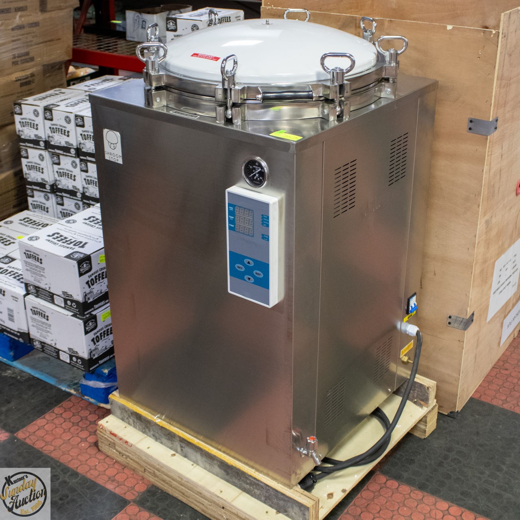 STEAM STERILIZER PRESSURE UNIT WITH WOODEN CRATE **ALL ITEMS MUST BE REMOVED BY 5PM SATURDAY, APRIL 25TH 2026. ALL REMAINING ITEMS WILL BE SUBJECT TO A $6.00 PER DAY STORAGE CHARGE. ANY ITEMS REMAINING AFTER MONDAY, MAY 11TH 2026 WILL BE CONSIDERED FORFEITED. NO REFUNDS WILL BE ISSUED FOR FORFEITED ITEMS. TO SCHEDULE A PICK UP APPOINTMENT CLICK HERE
