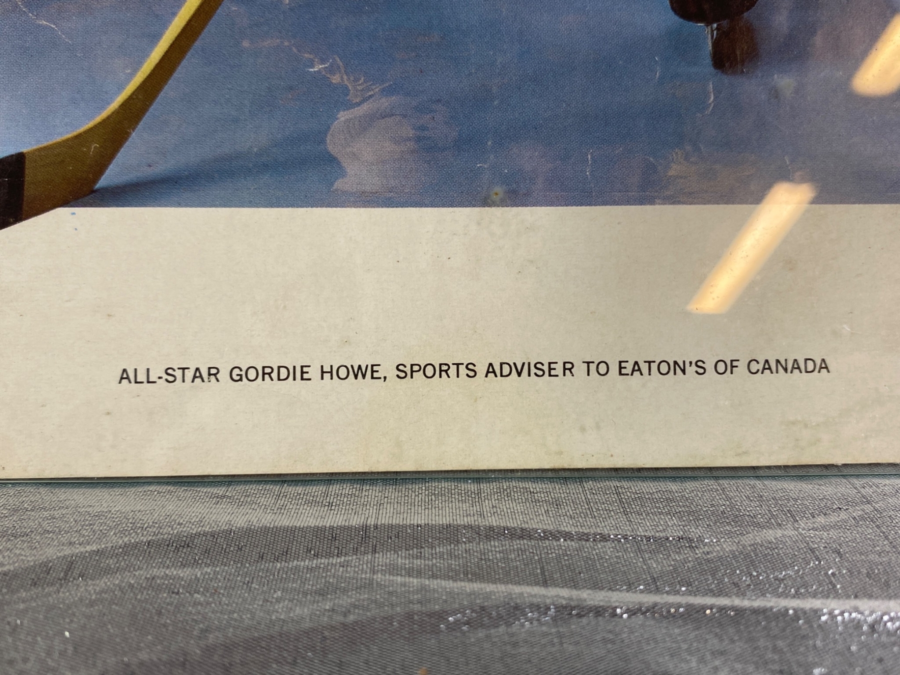 Printed wall display featuring legendary hockey player Gordie Howe in his All-Star uniform, noted as the 'Sports Adviser to Eaton's of Canada.' Mounted on a wooden backing and secured with metal clips, this collectible is perfect for hockey enthusiasts and Gordie Howe fans. Shows some signs of wear and aging, adding vintage character.