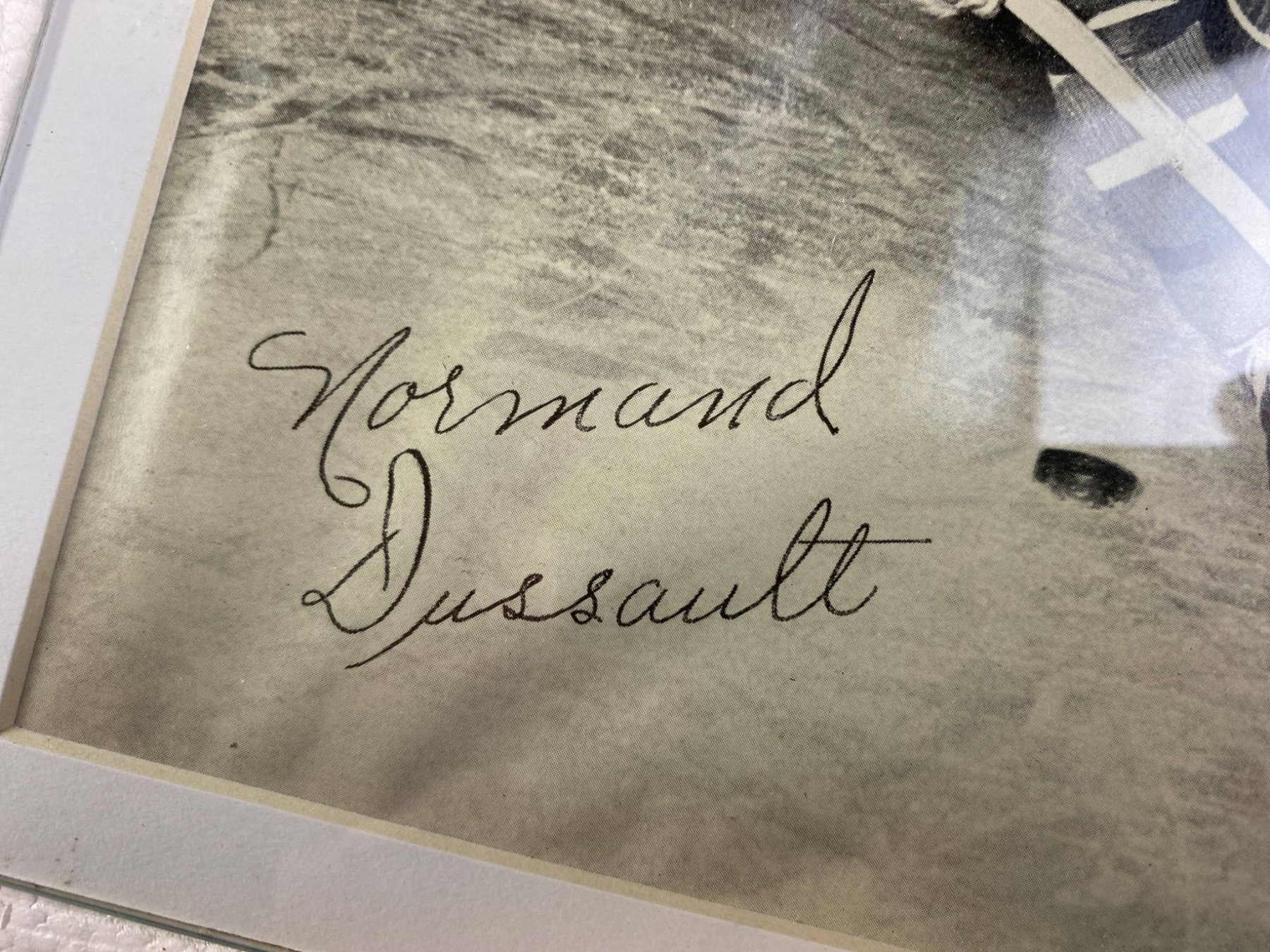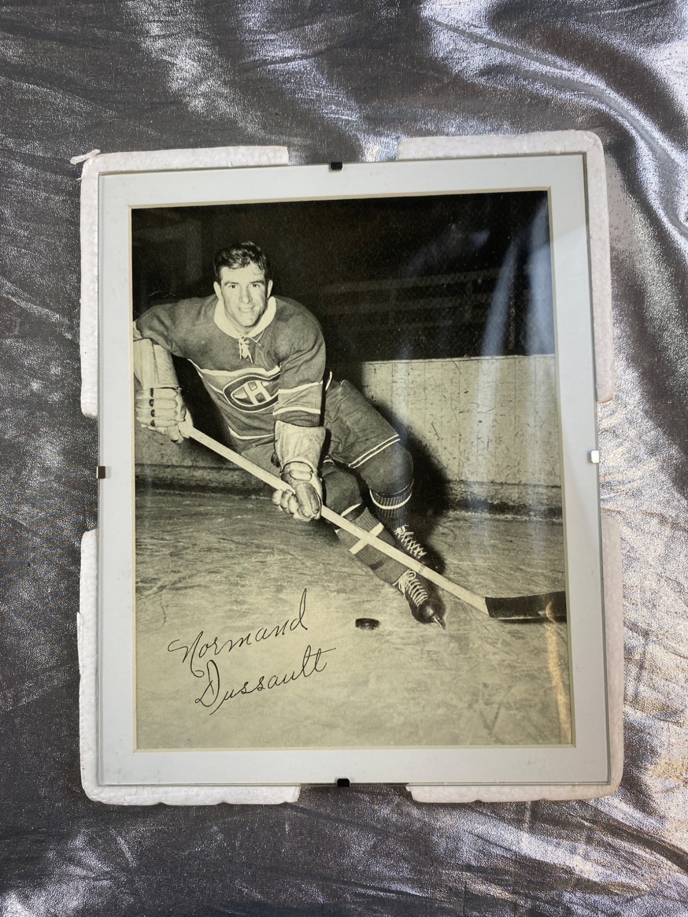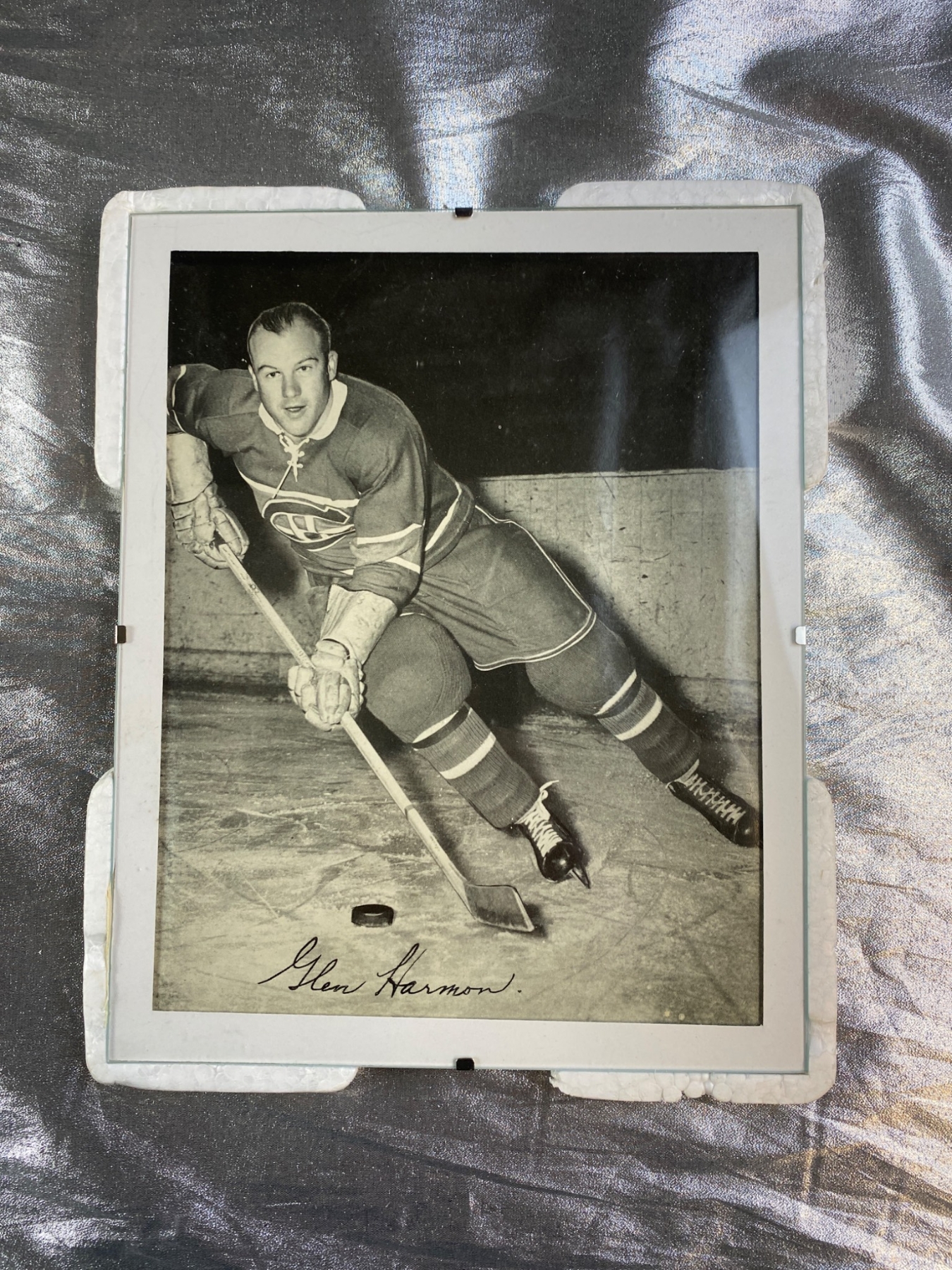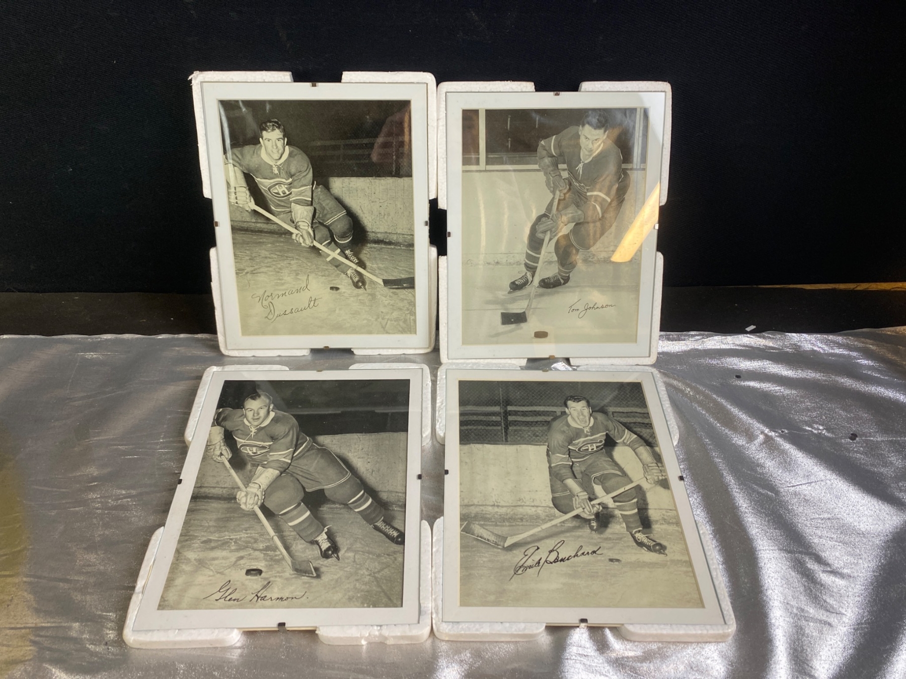 4 signed black-and-white photographs featuring Montreal Canadiens players from a past era. Each photo displays a player in action, complete with clear signatures: Glen Harmon, Emile Bouchard, Tom Johnson, and Normand Dussault. The photos are framed in protective holders and show some wear consistent with age. A fantastic find for hockey and sports memorabilia collectors.