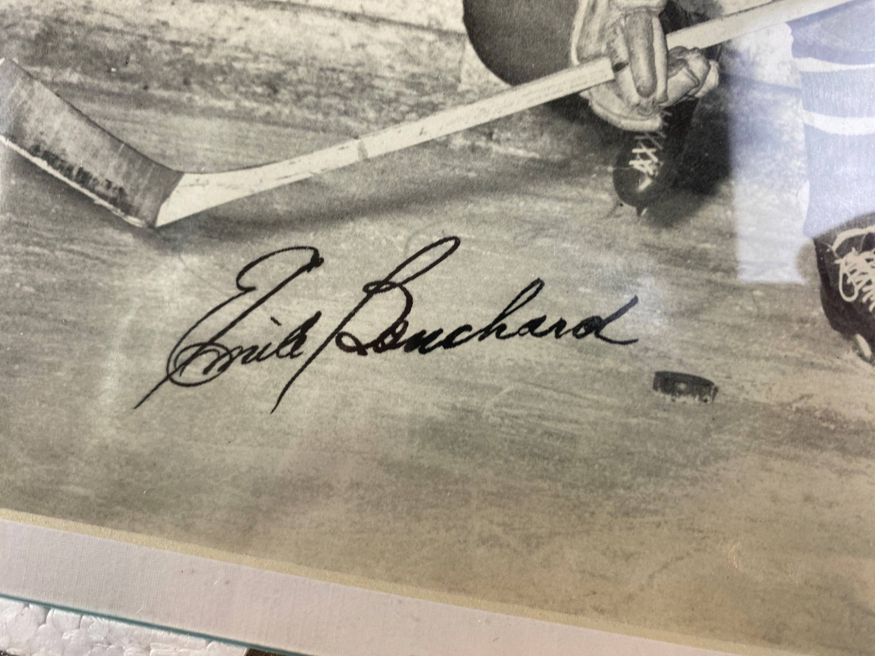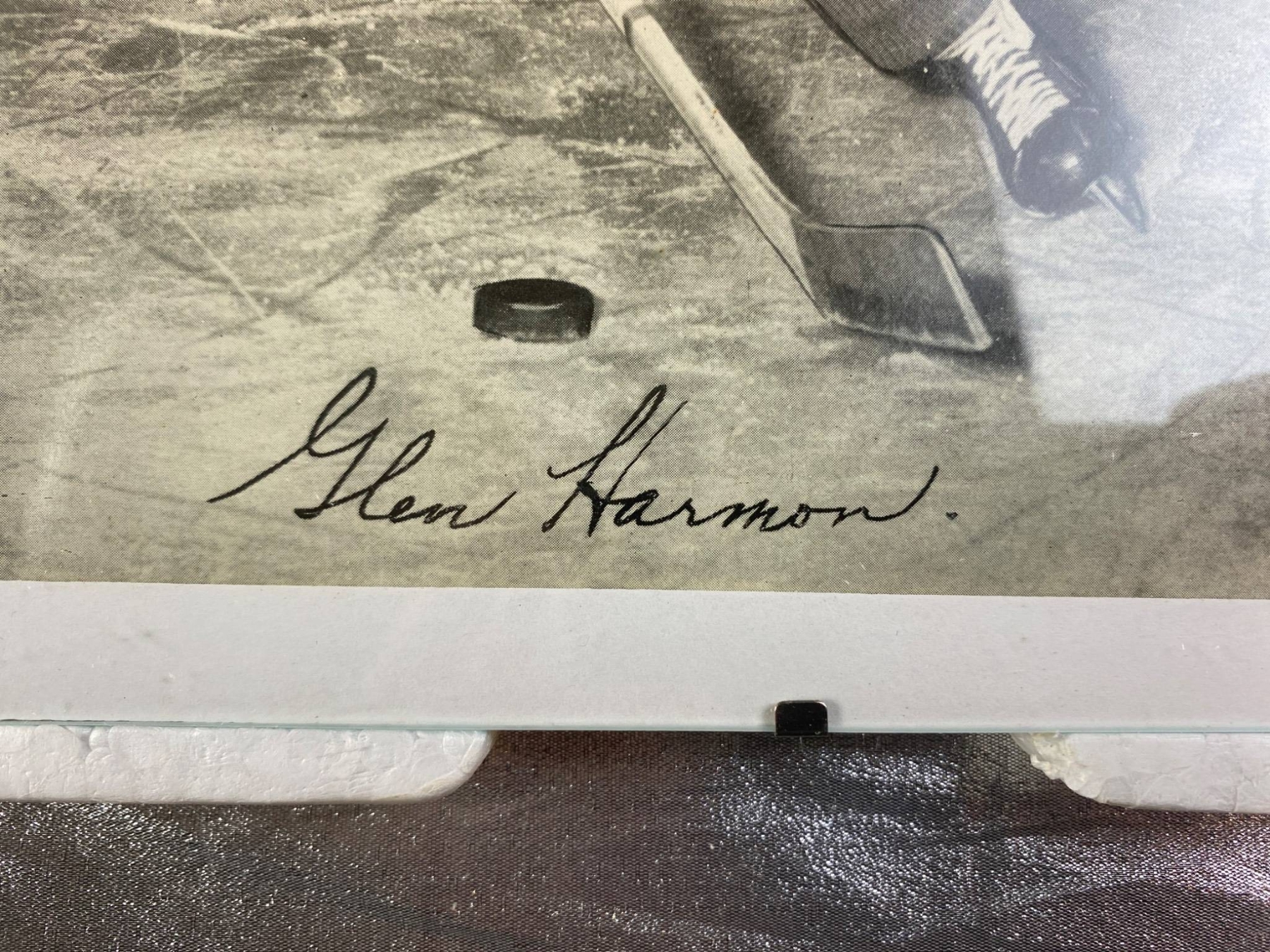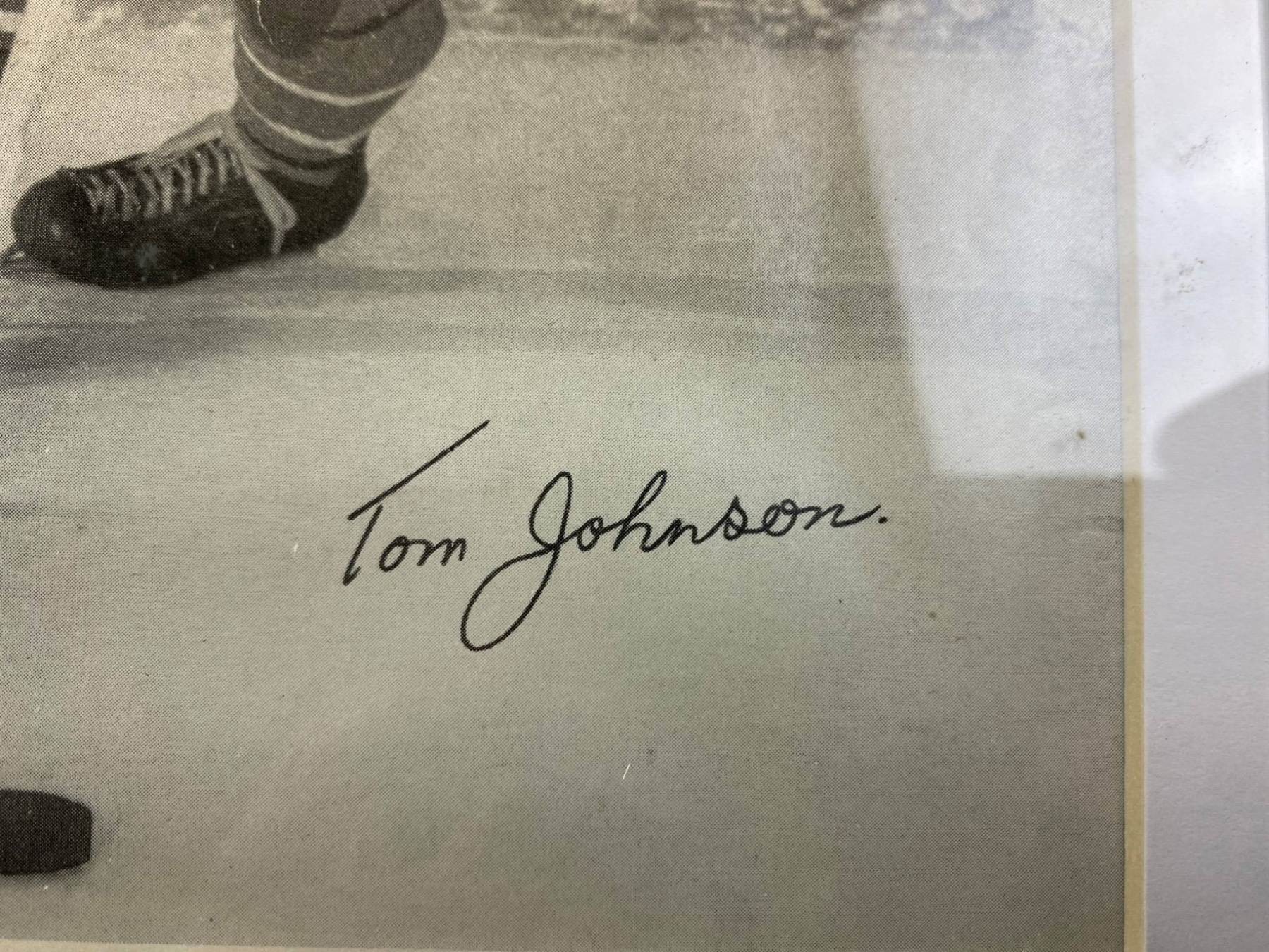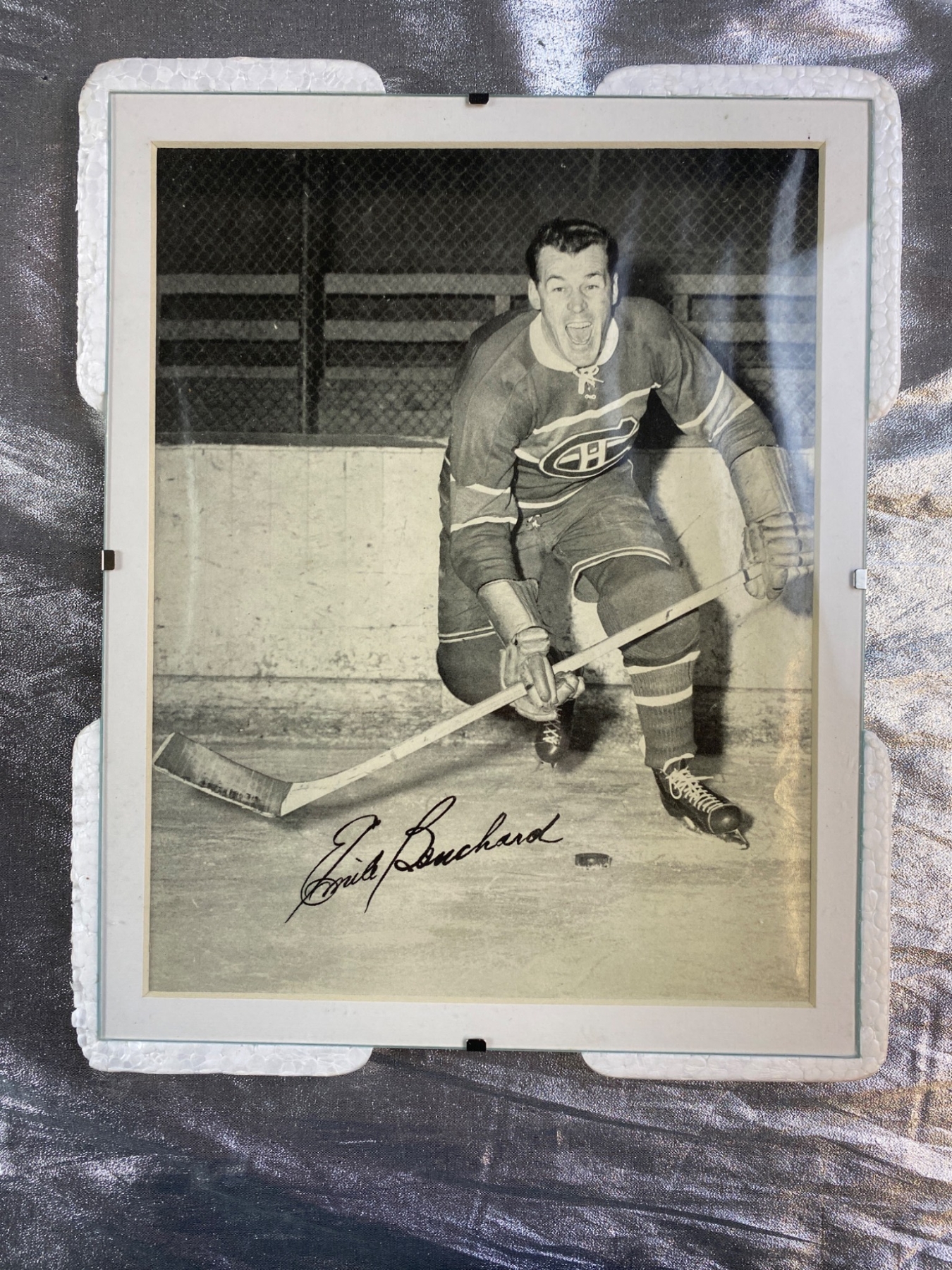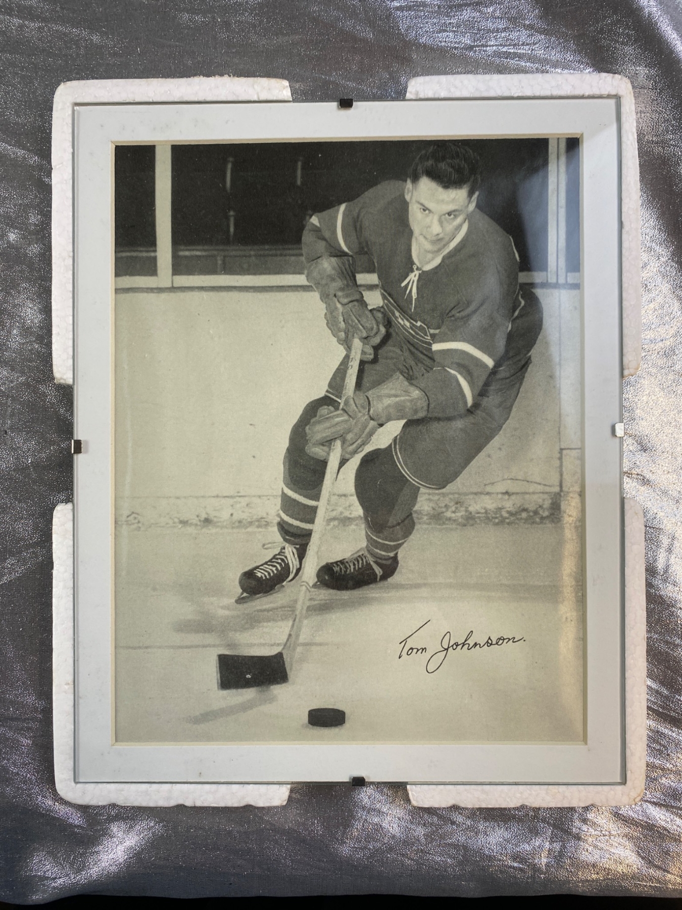 4 signed black-and-white photographs featuring Montreal Canadiens players from a past era. Each photo displays a player in action, complete with clear signatures: Glen Harmon, Emile Bouchard, Tom Johnson, and Normand Dussault. The photos are framed in protective holders and show some wear consistent with age. A fantastic find for hockey and sports memorabilia collectors.