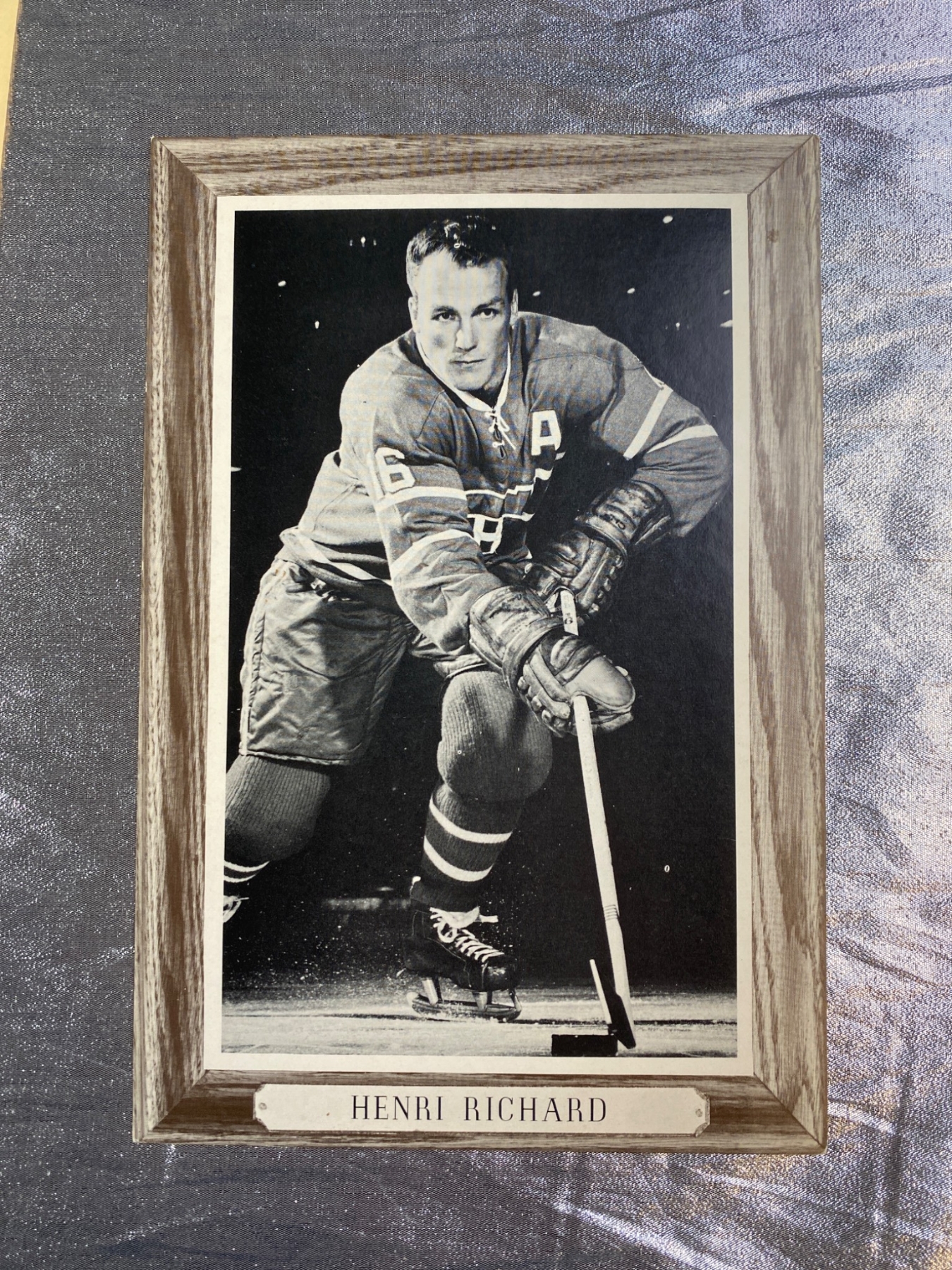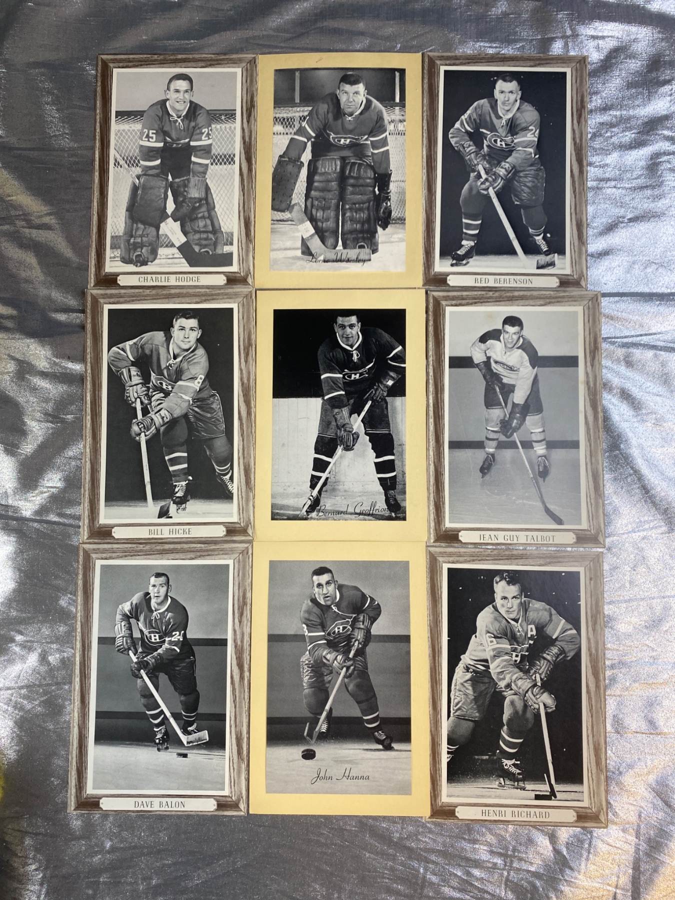Ten black-and-white photos featuring Montreal Canadiens hockey players, including Henri Richard, Jean Guy Talbot, and Charlie Hodge. Each piece is either framed with a nameplate or mounted on decorative backing, showcasing iconic moments of legendary players. A great addition for sports memorabilia collectors or hockey fans.