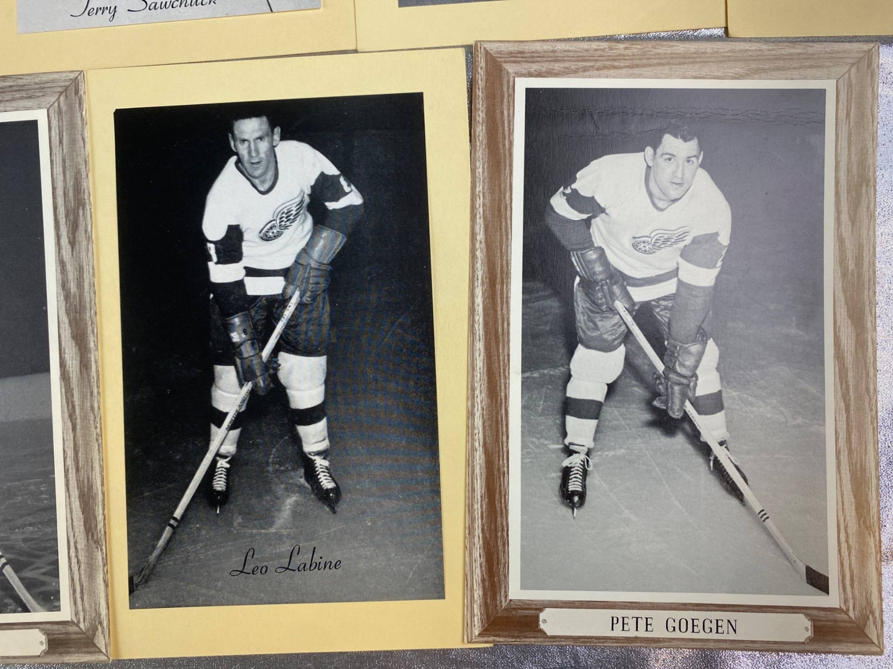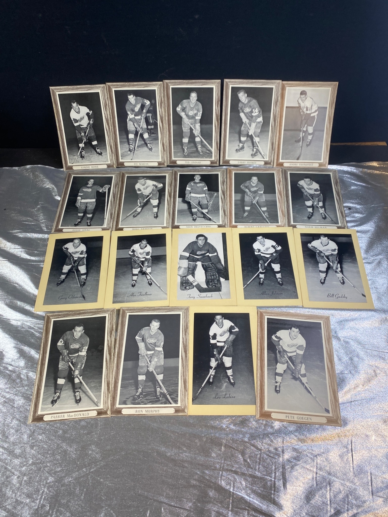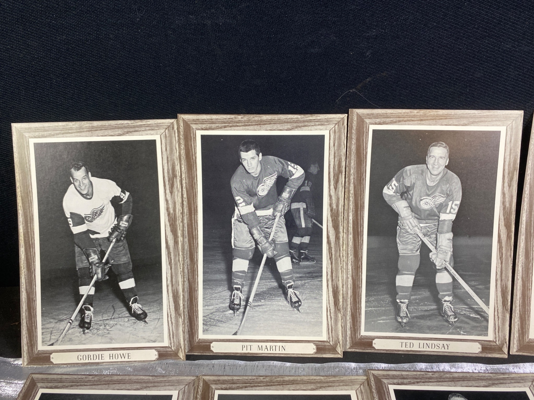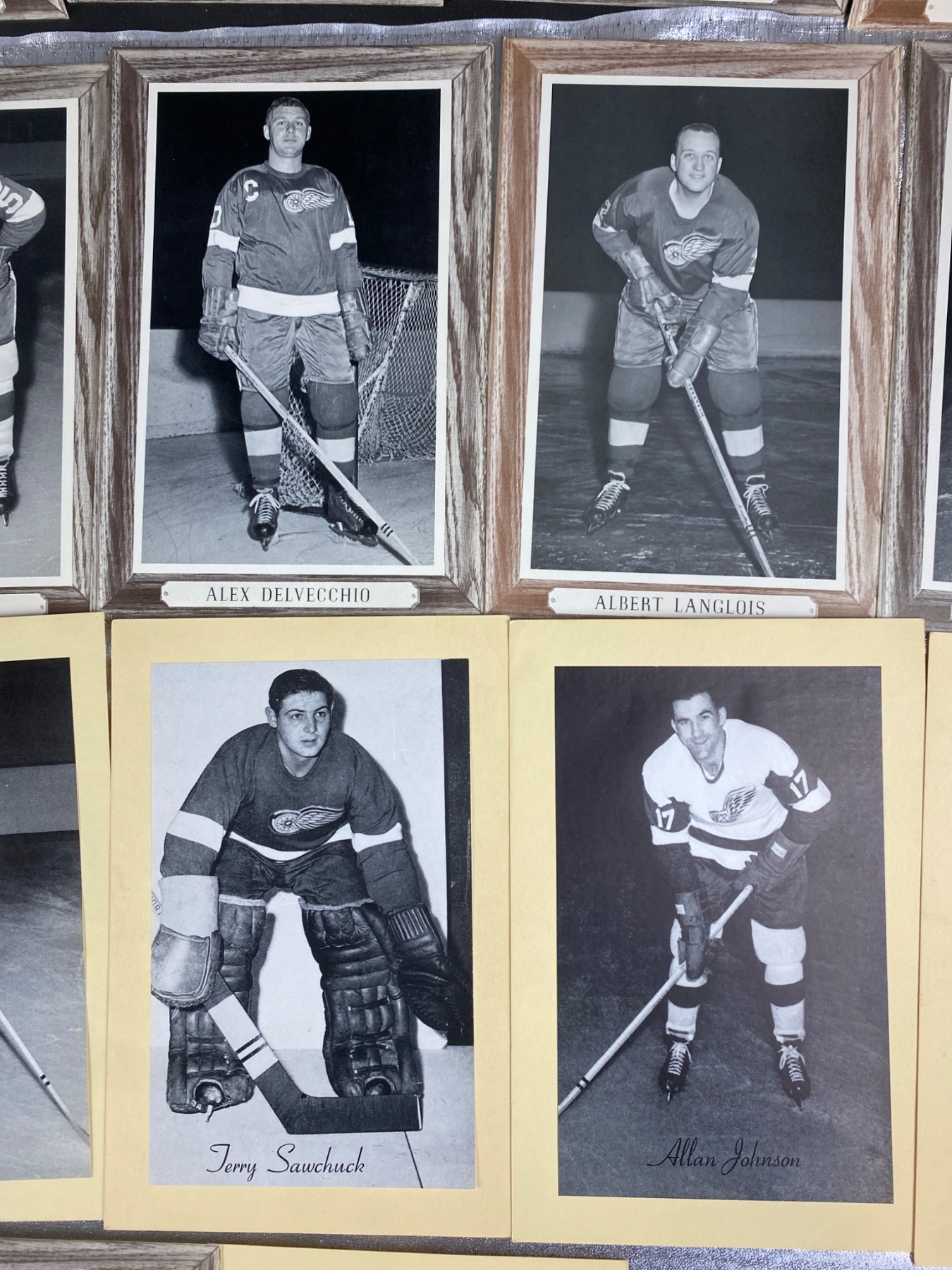 17 black-and-white photographs featuring Detroit Red Wings hockey players, showcasing iconic names such as Norm Ullman, Bill Gadsby, and Alex Delvecchio. Some photos are framed with wood-style borders, while others are mounted on cardstock. A unique addition for hockey enthusiasts or collectors of sports memorabilia. Each photo highlights players poised with their hockey sticks, ready for the rink.
