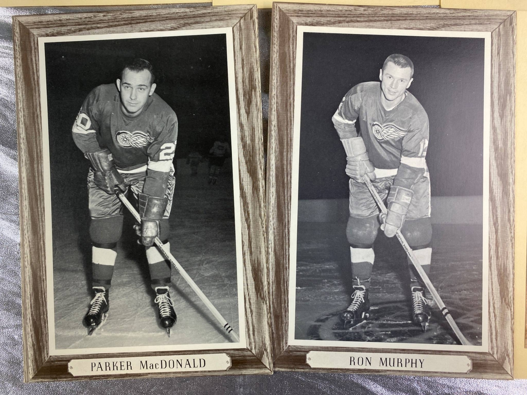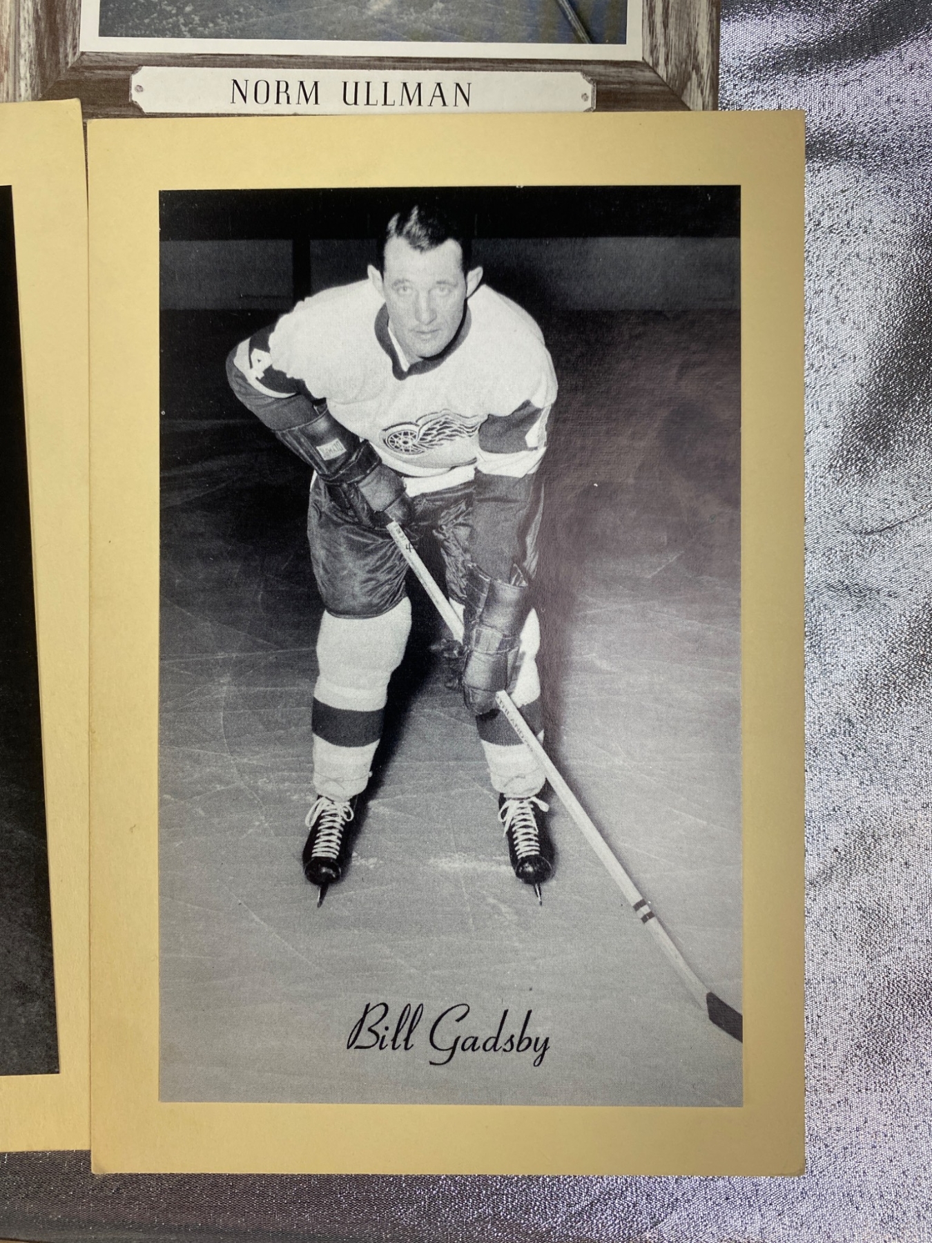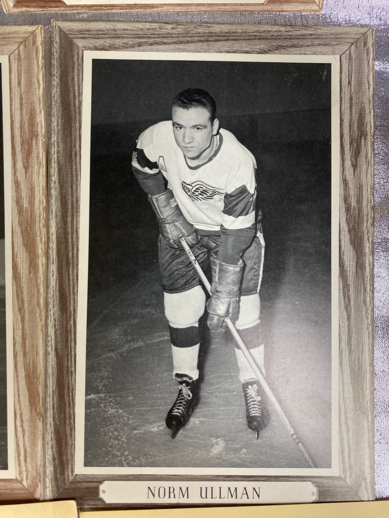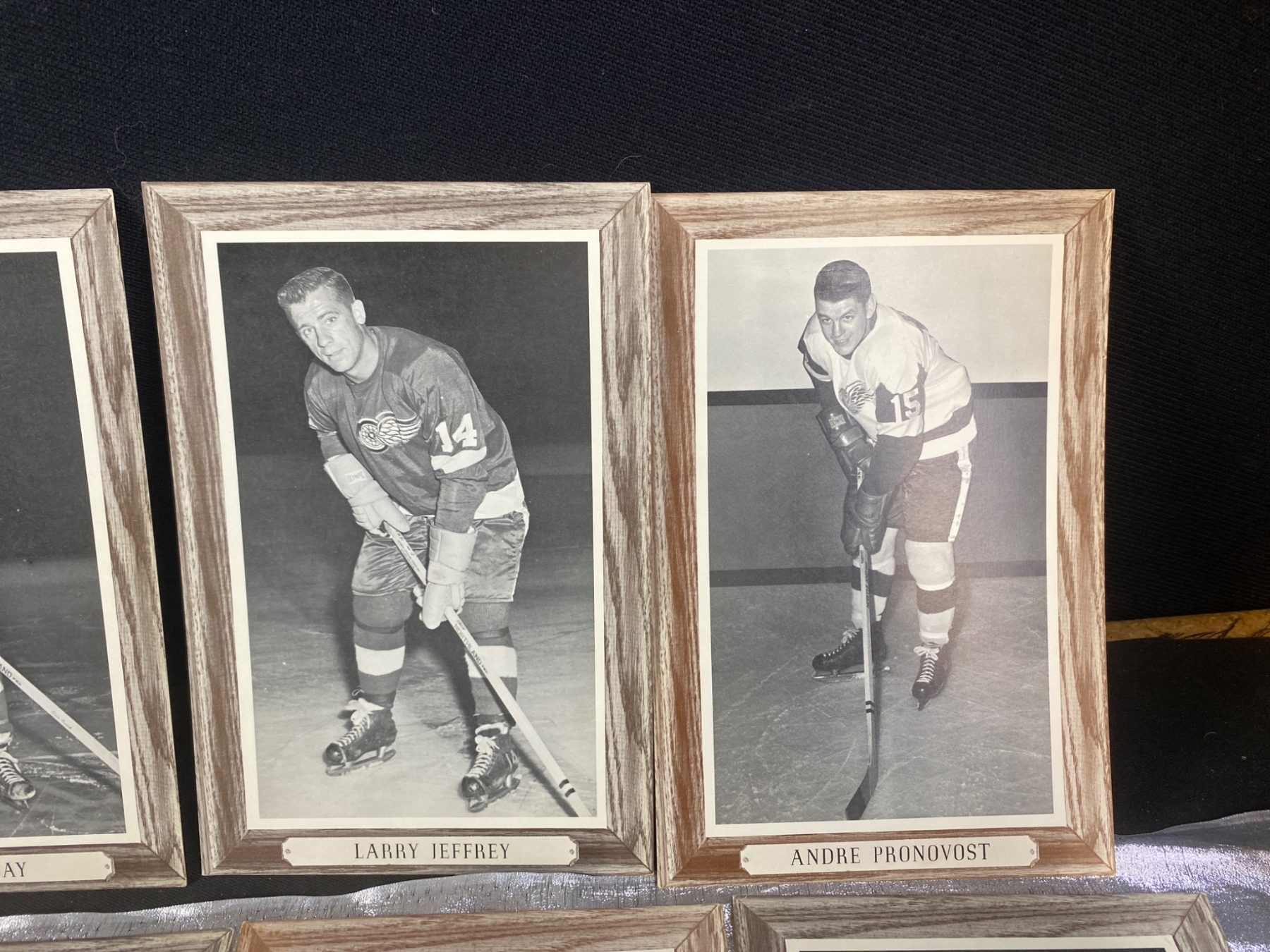 17 black-and-white photographs featuring Detroit Red Wings hockey players, showcasing iconic names such as Norm Ullman, Bill Gadsby, and Alex Delvecchio. Some photos are framed with wood-style borders, while others are mounted on cardstock. A unique addition for hockey enthusiasts or collectors of sports memorabilia. Each photo highlights players poised with their hockey sticks, ready for the rink.