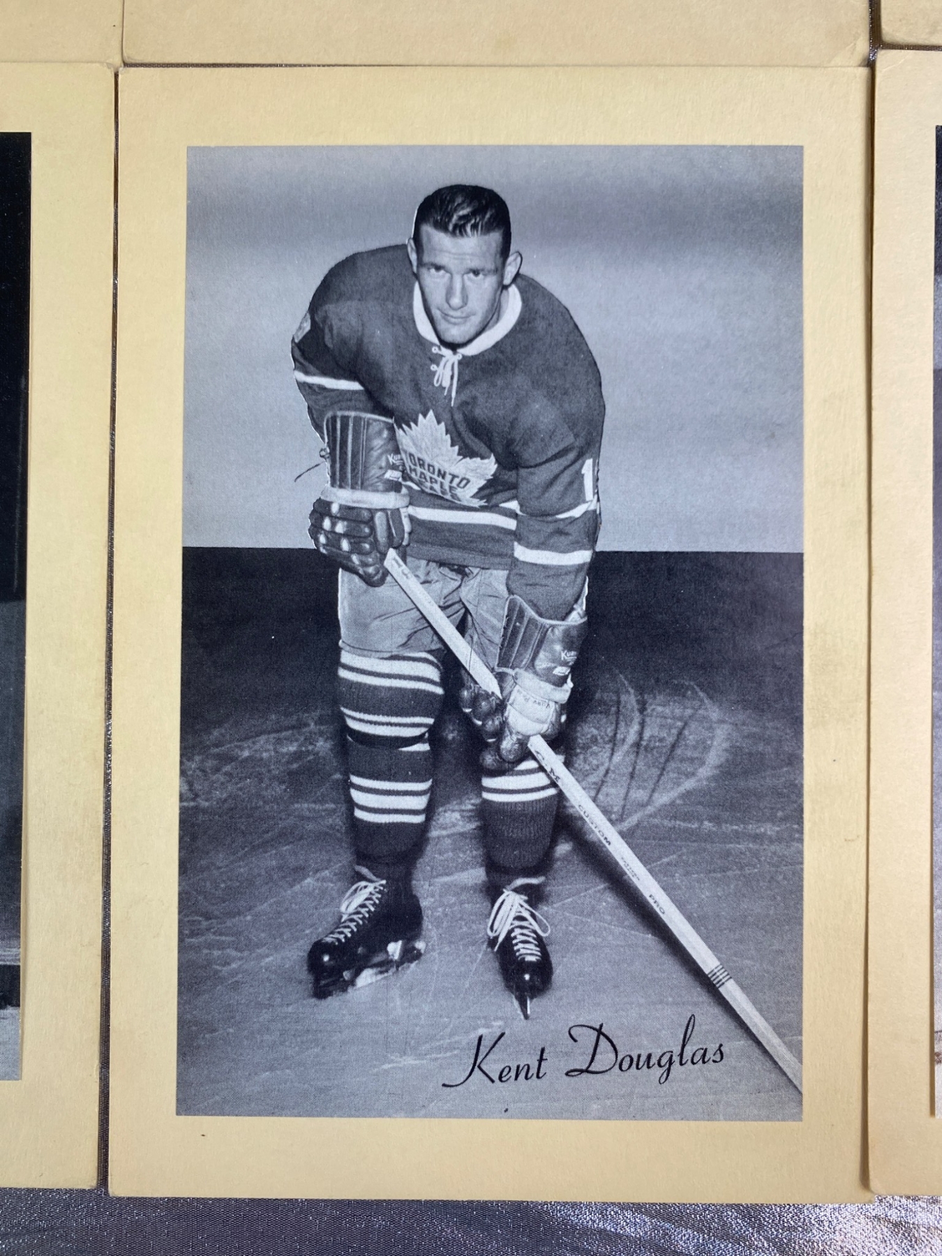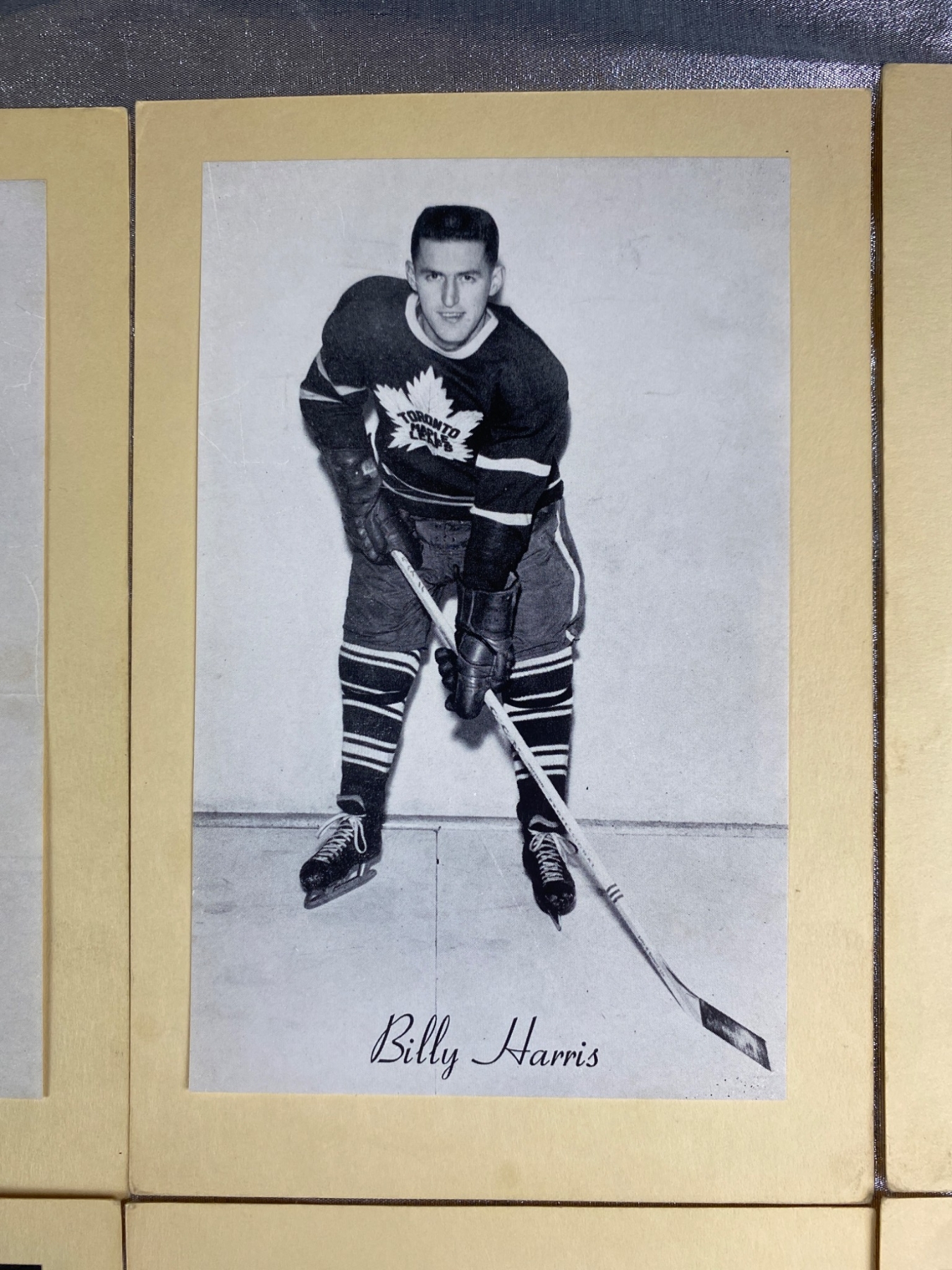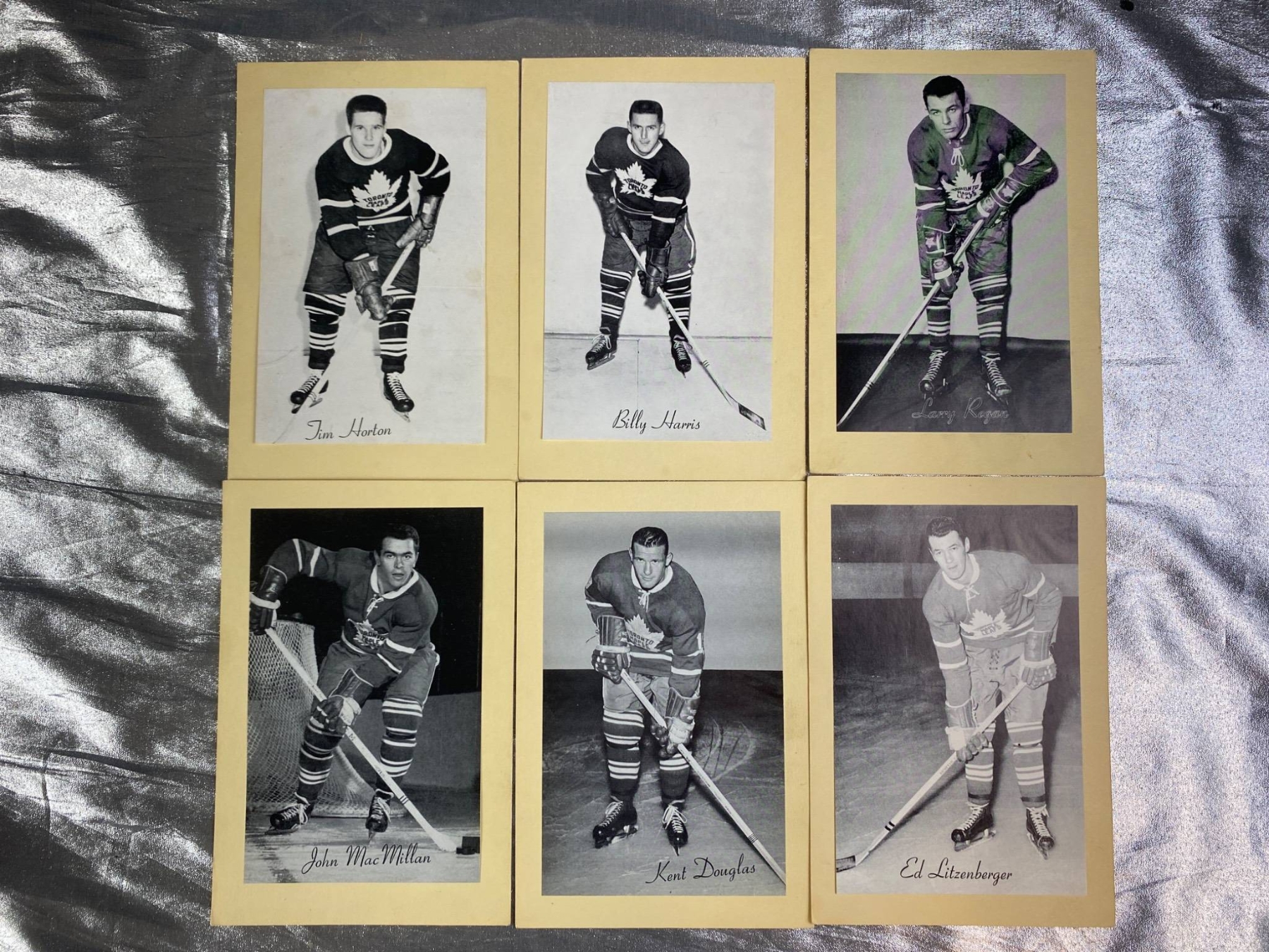 Six black-and-white photos of Toronto Maple Leafs players, including Tim Horton, Billy Harris, Larry Regan, John MacMillan, Kent Douglas, and Ed Litzenberger. Each photo is mounted on cardstock and includes the player’s printed signature. Condition is consistent with vintage photographic prints, with minor wear visible. Ideal for collectors of hockey memorabilia.