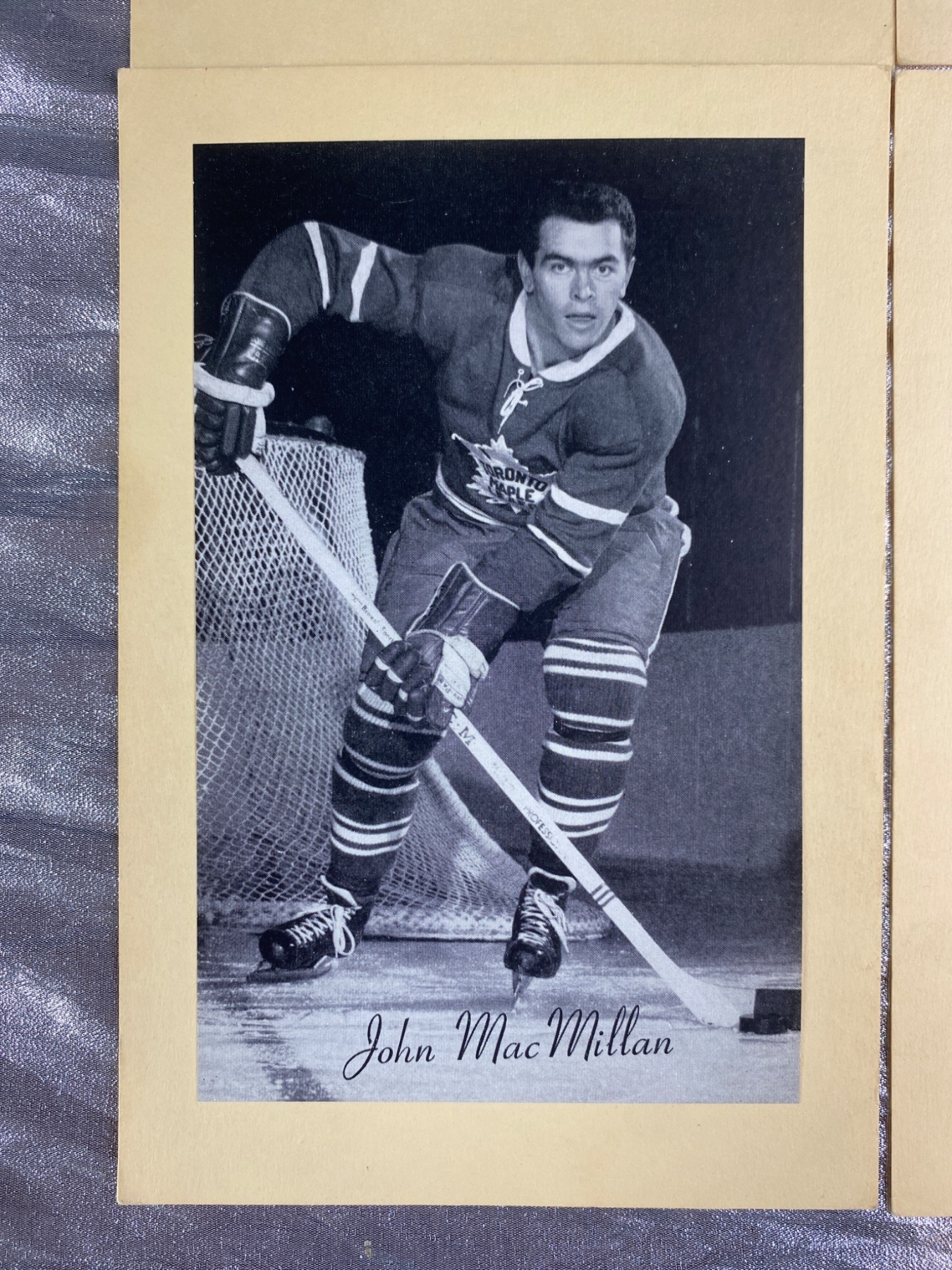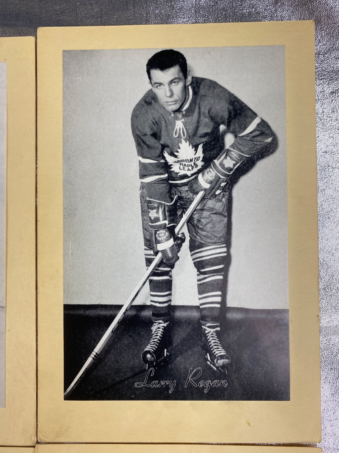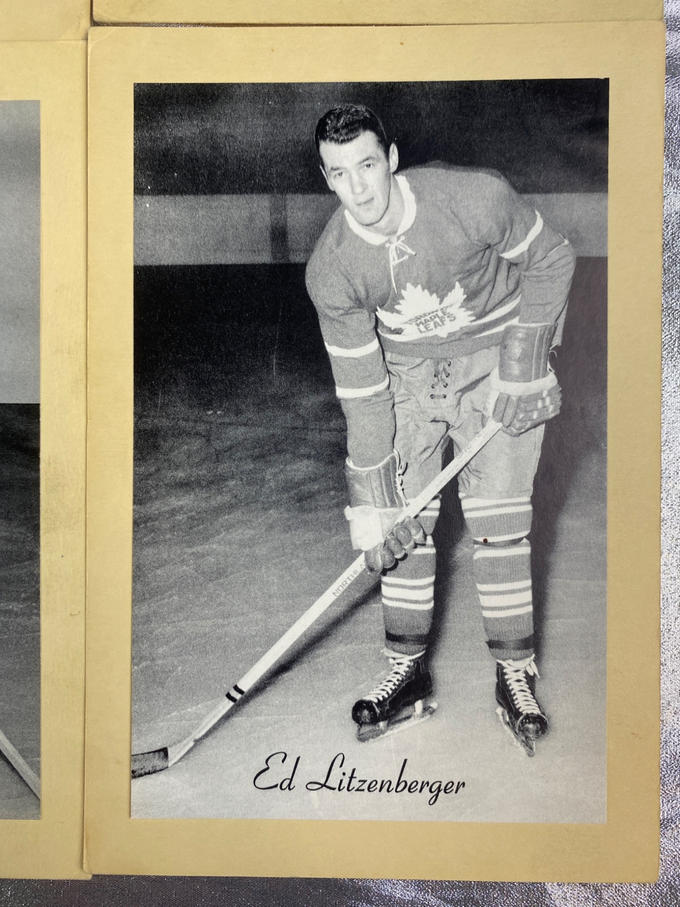 Six black-and-white photos of Toronto Maple Leafs players, including Tim Horton, Billy Harris, Larry Regan, John MacMillan, Kent Douglas, and Ed Litzenberger. Each photo is mounted on cardstock and includes the player’s printed signature. Condition is consistent with vintage photographic prints, with minor wear visible. Ideal for collectors of hockey memorabilia.