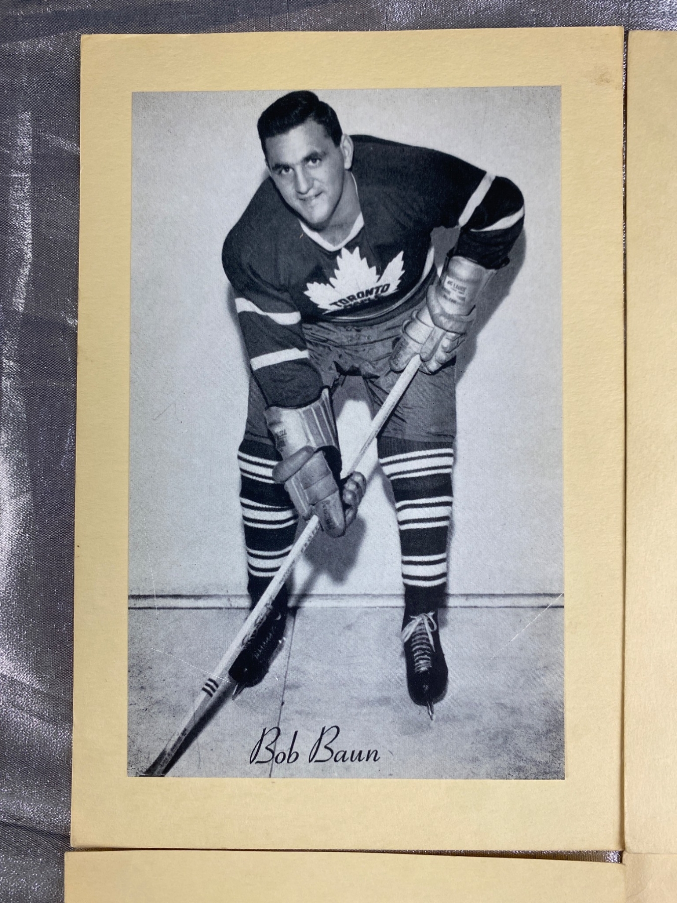 This set comprises six postcards showcasing Toronto Maple Leafs players, including Bob Baun, Larry Hillman, Don Simmons, Bronco Horvath, Alan Stanley, and Red Kelly. The photographs capture these athletes in action poses, with printed player names on the front. Estimated to originate from the mid-20th century, the items show signs of age-appropriate wear but remain in reasonable preservation.