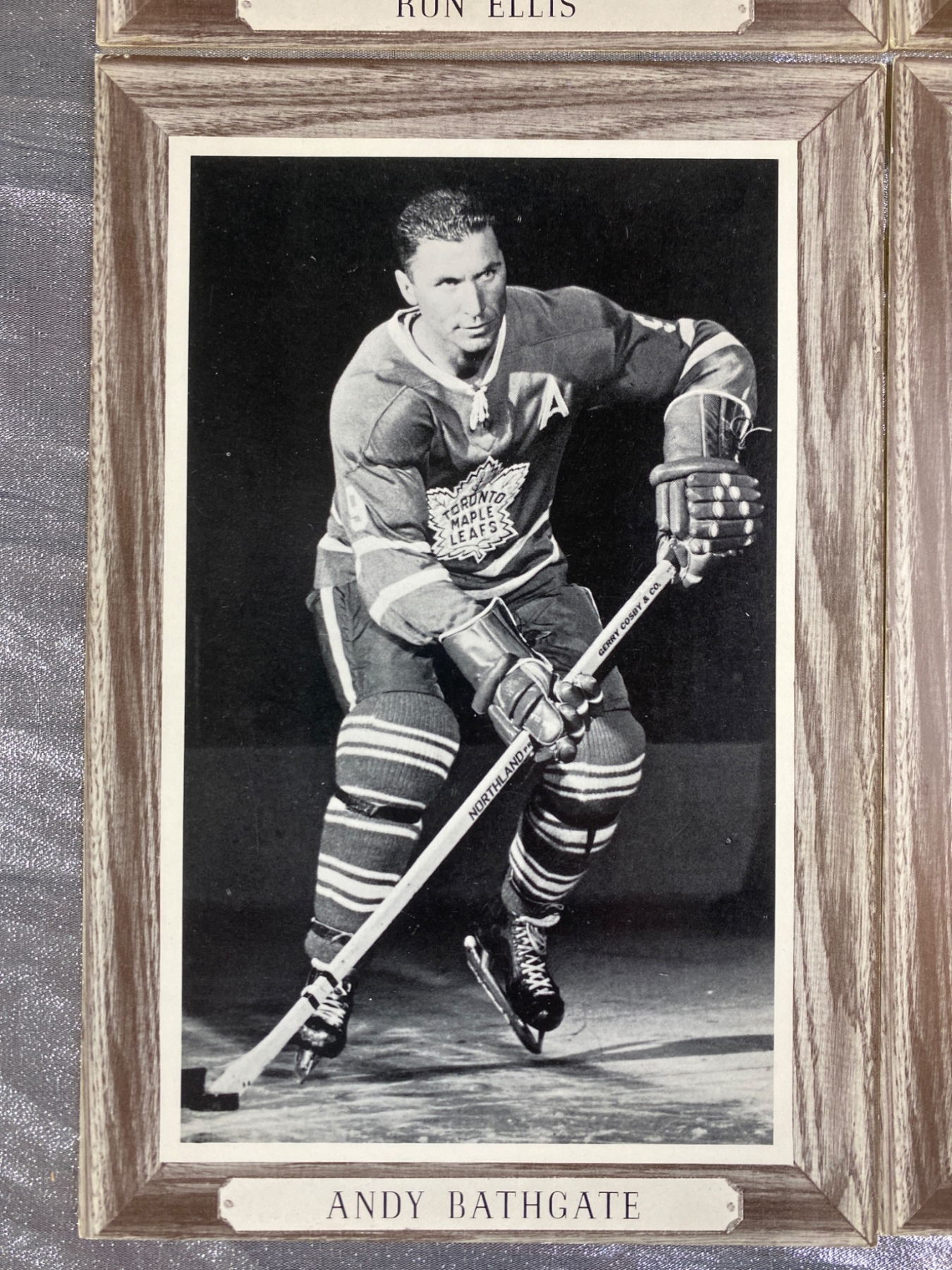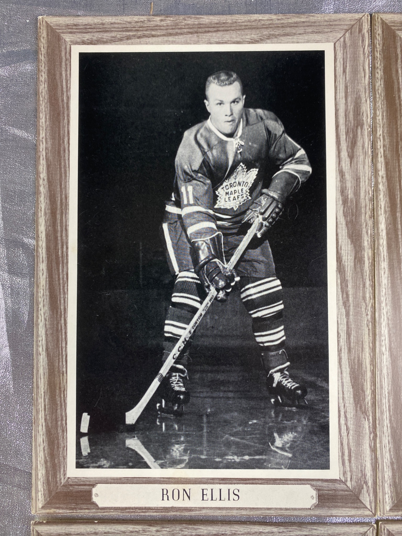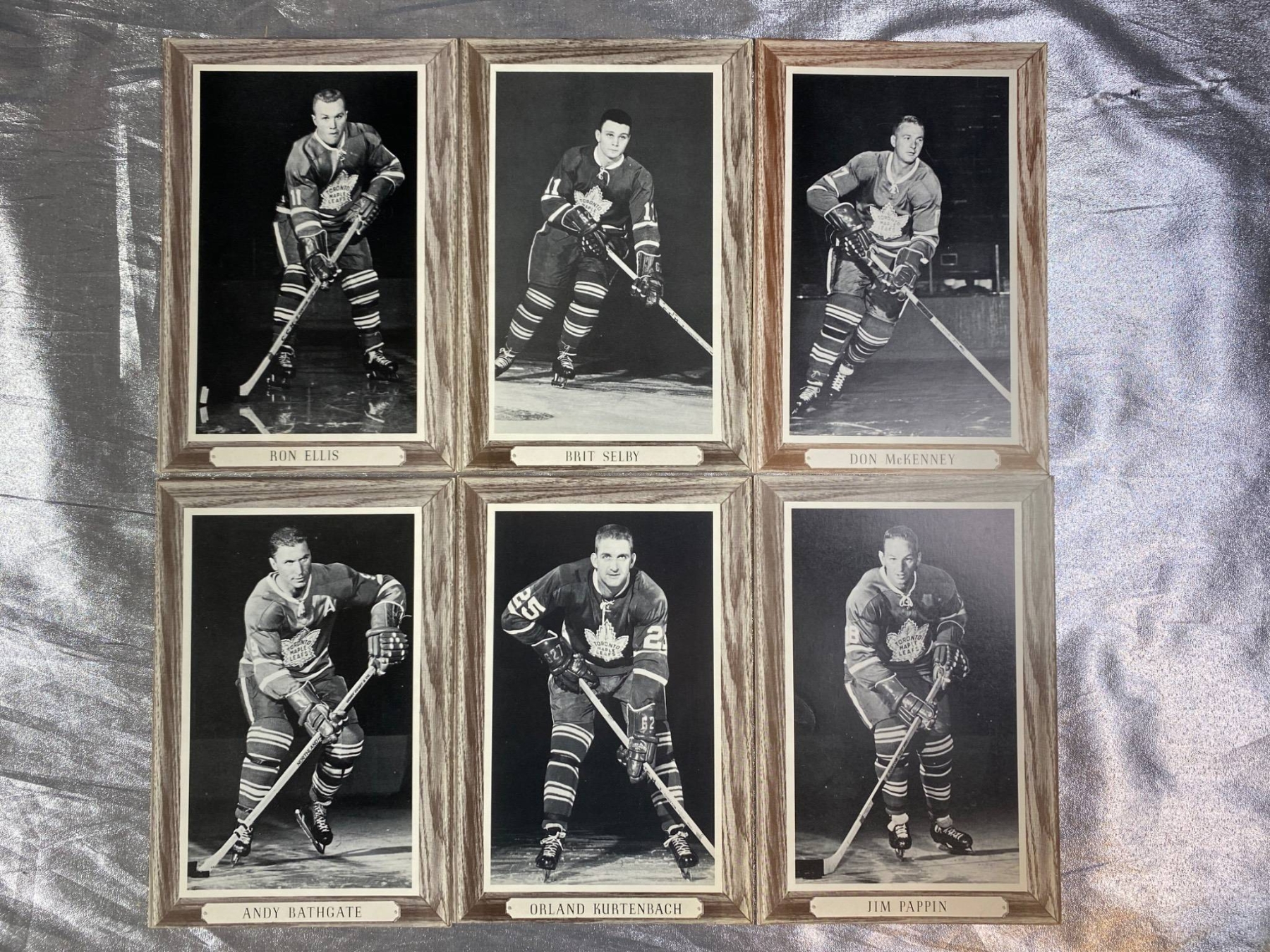 This set includes six black-and-white portrait photographs of Toronto Maple Leafs players: Ron Ellis, Brit Selby, Don McKenney, Andy Bathgate, Orland Kurtenbach, and Jim Pappin. Each photograph is framed individually in a wooden frame with a nameplate. The photographs showcase players in full uniform and carrying hockey sticks, making this set a collector's item for fans of hockey history and the Toronto Maple Leafs team.