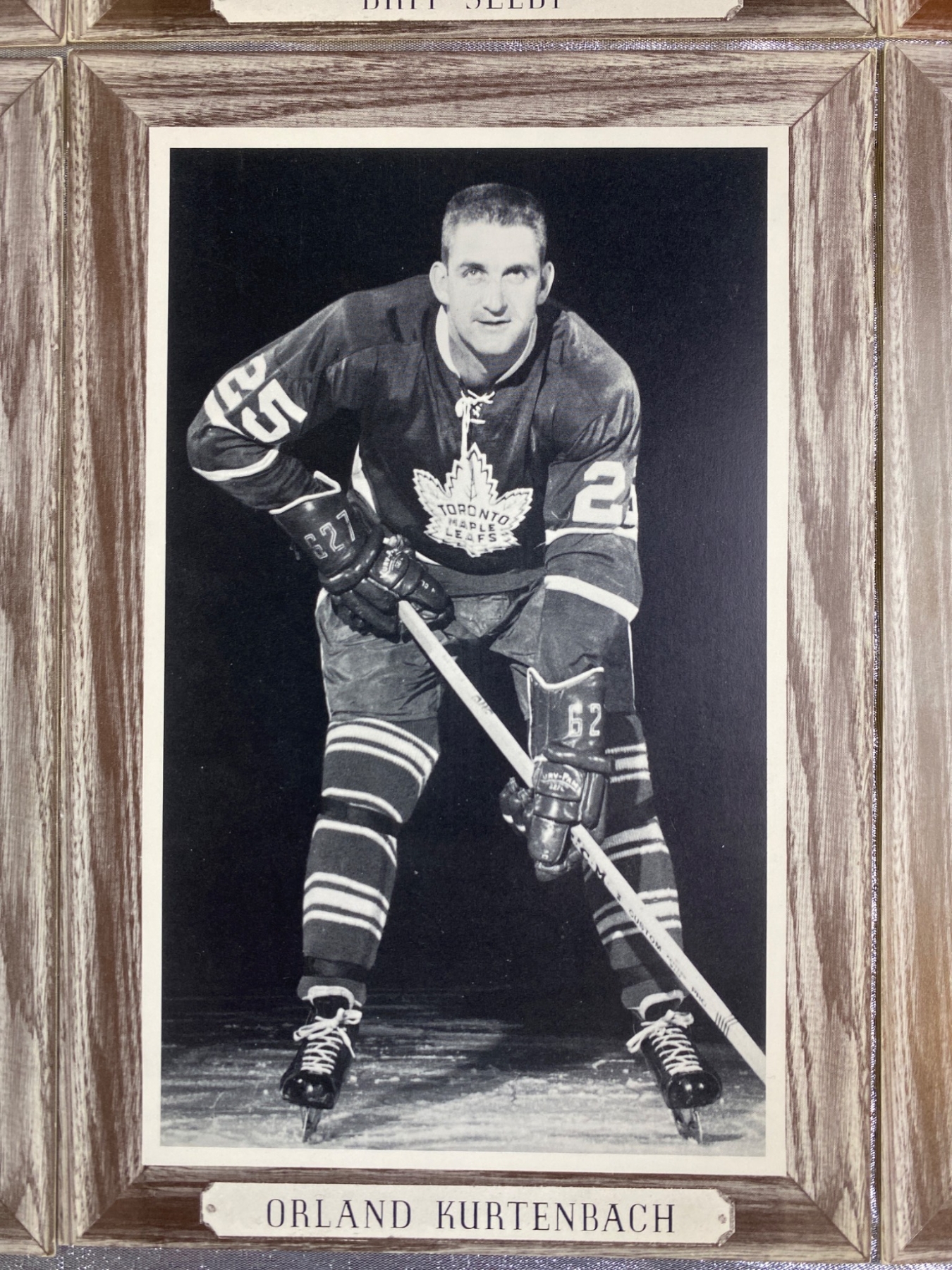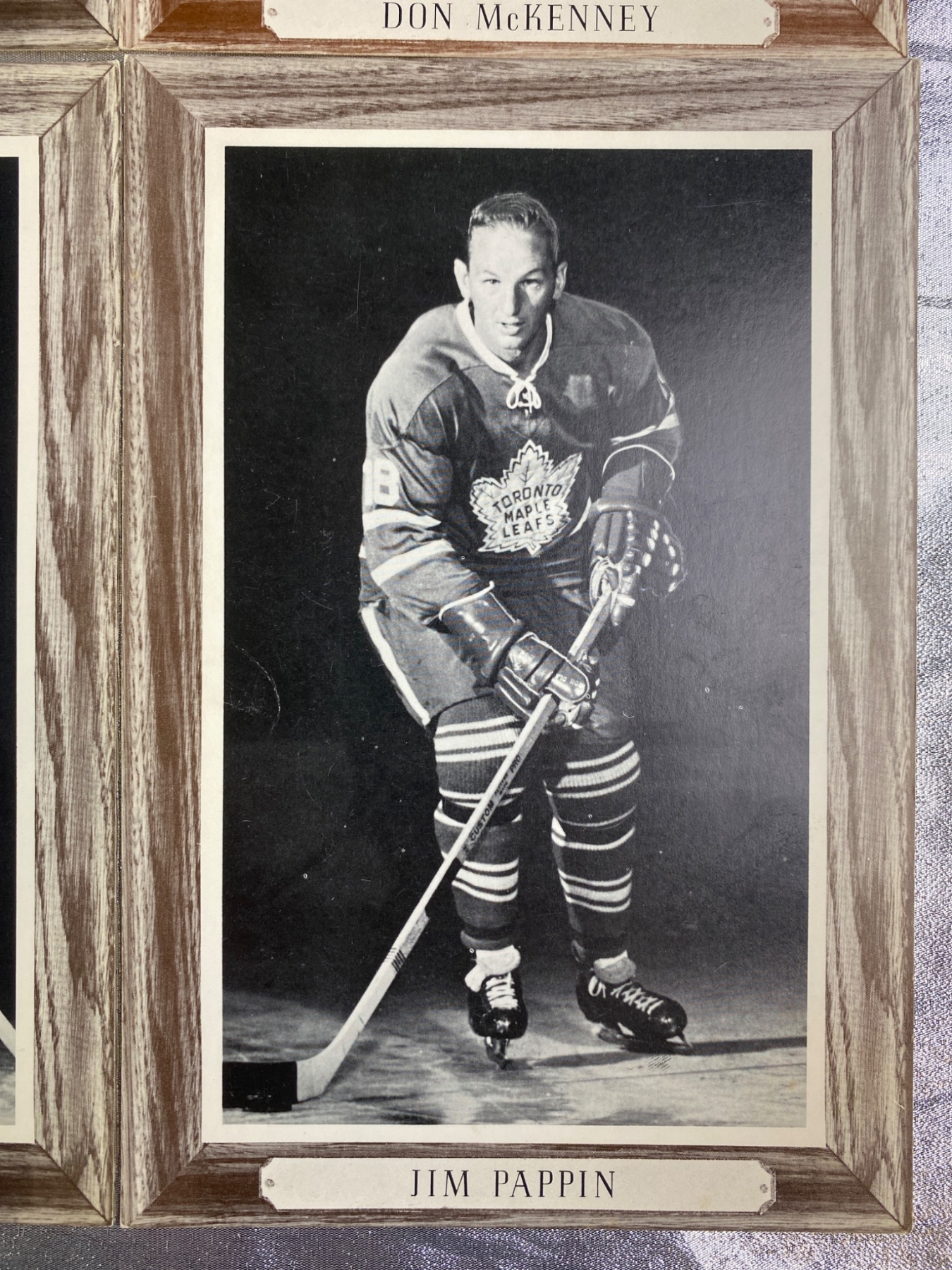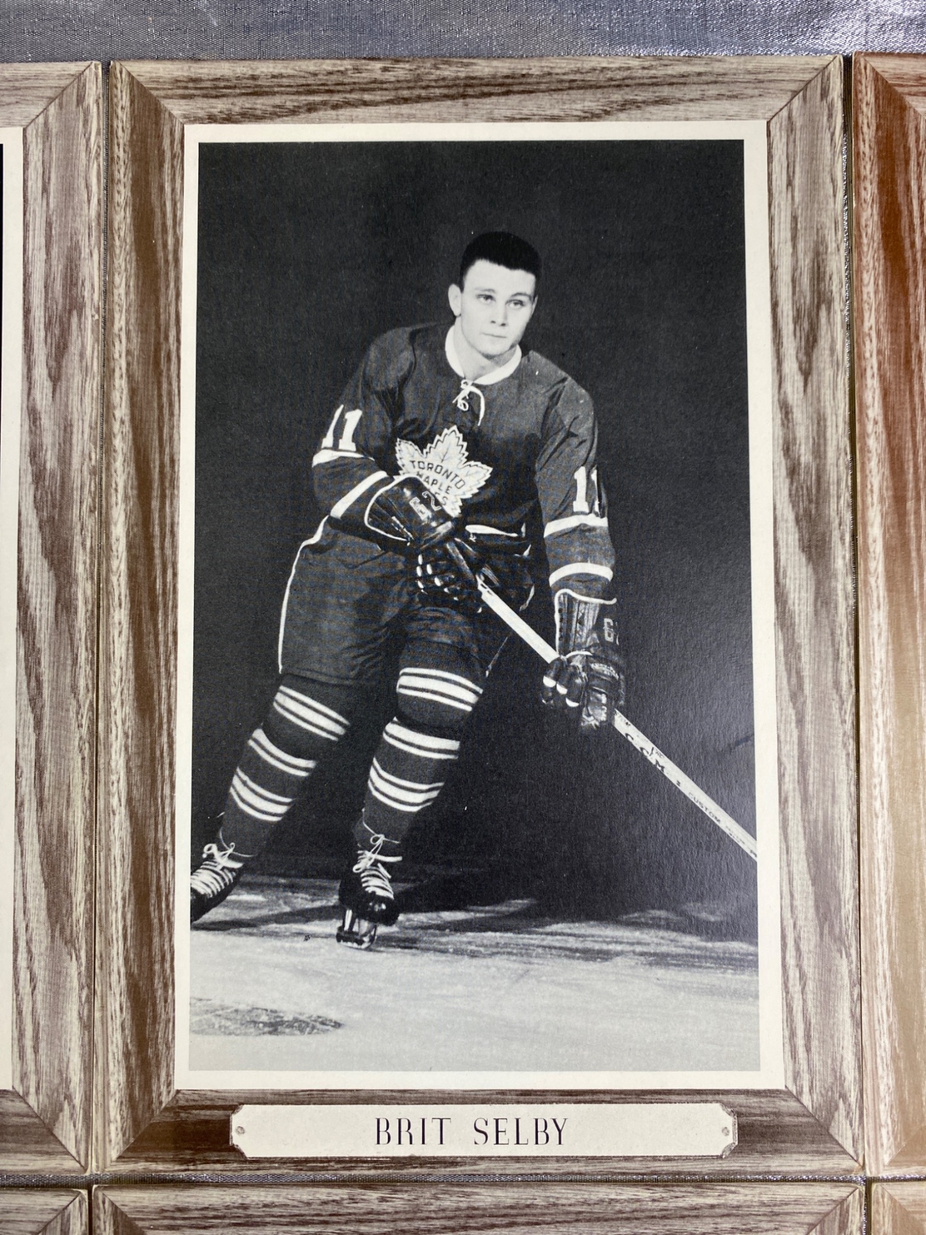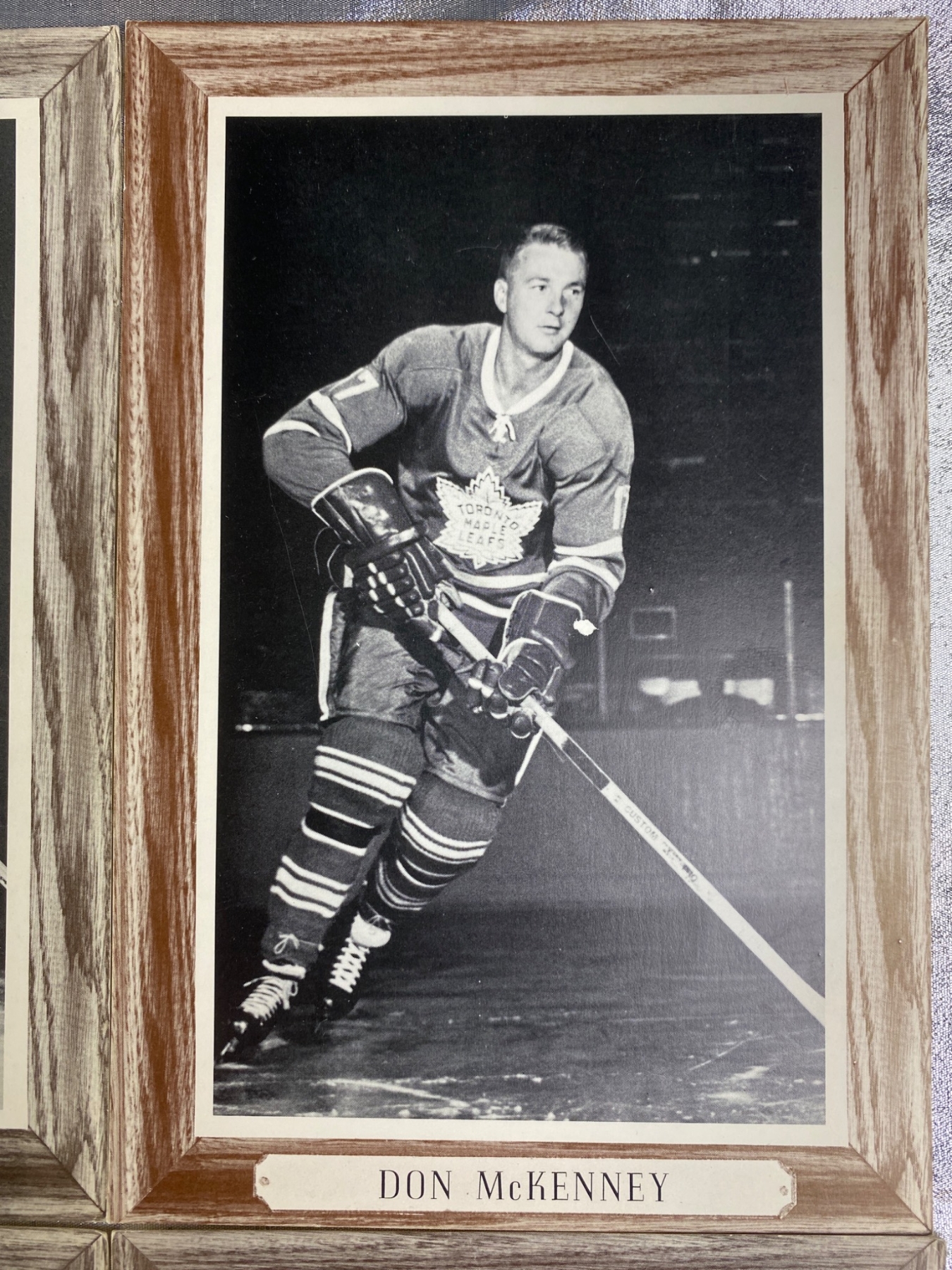 This set includes six black-and-white portrait photographs of Toronto Maple Leafs players: Ron Ellis, Brit Selby, Don McKenney, Andy Bathgate, Orland Kurtenbach, and Jim Pappin. Each photograph is framed individually in a wooden frame with a nameplate. The photographs showcase players in full uniform and carrying hockey sticks, making this set a collector's item for fans of hockey history and the Toronto Maple Leafs team.