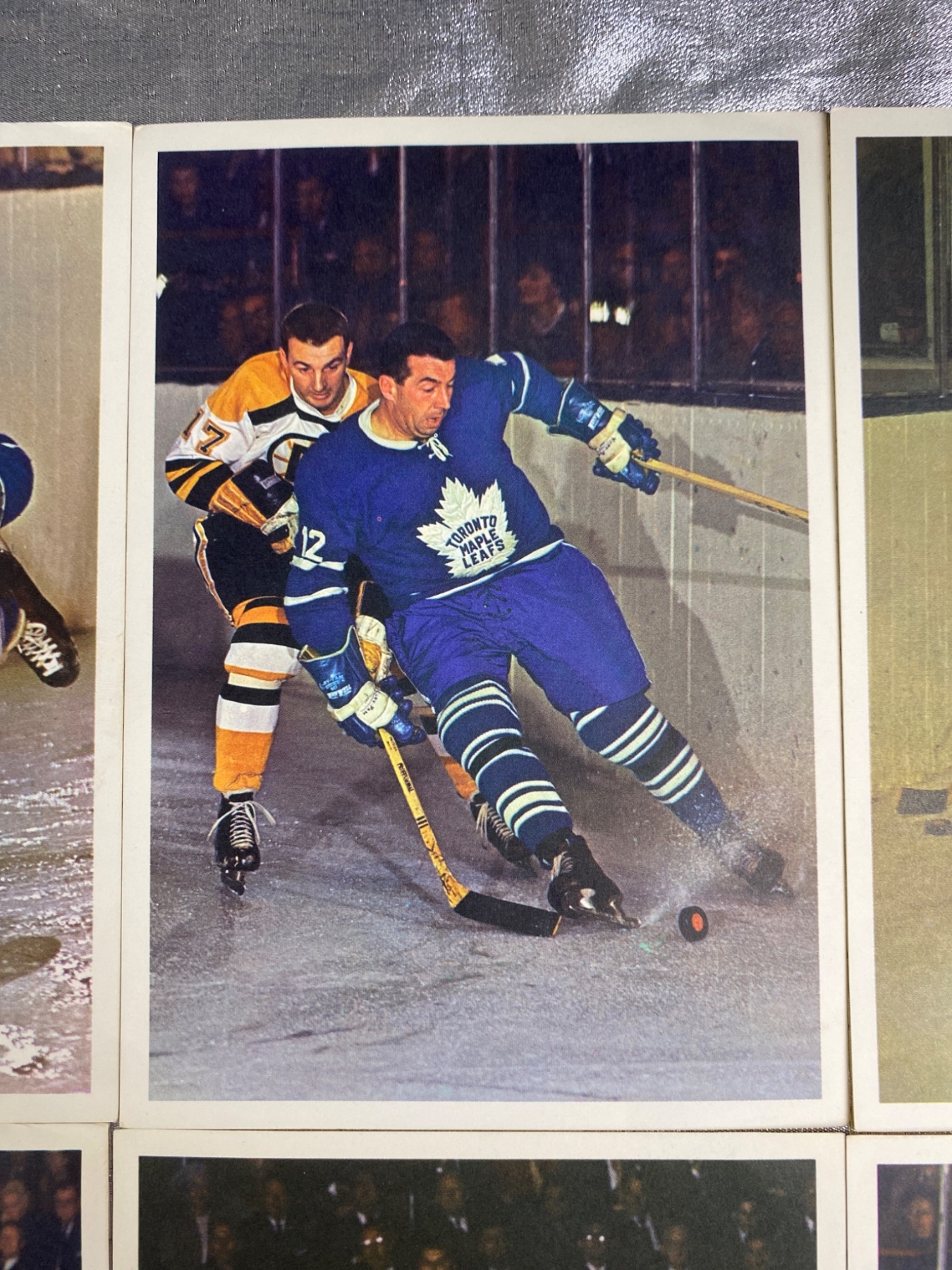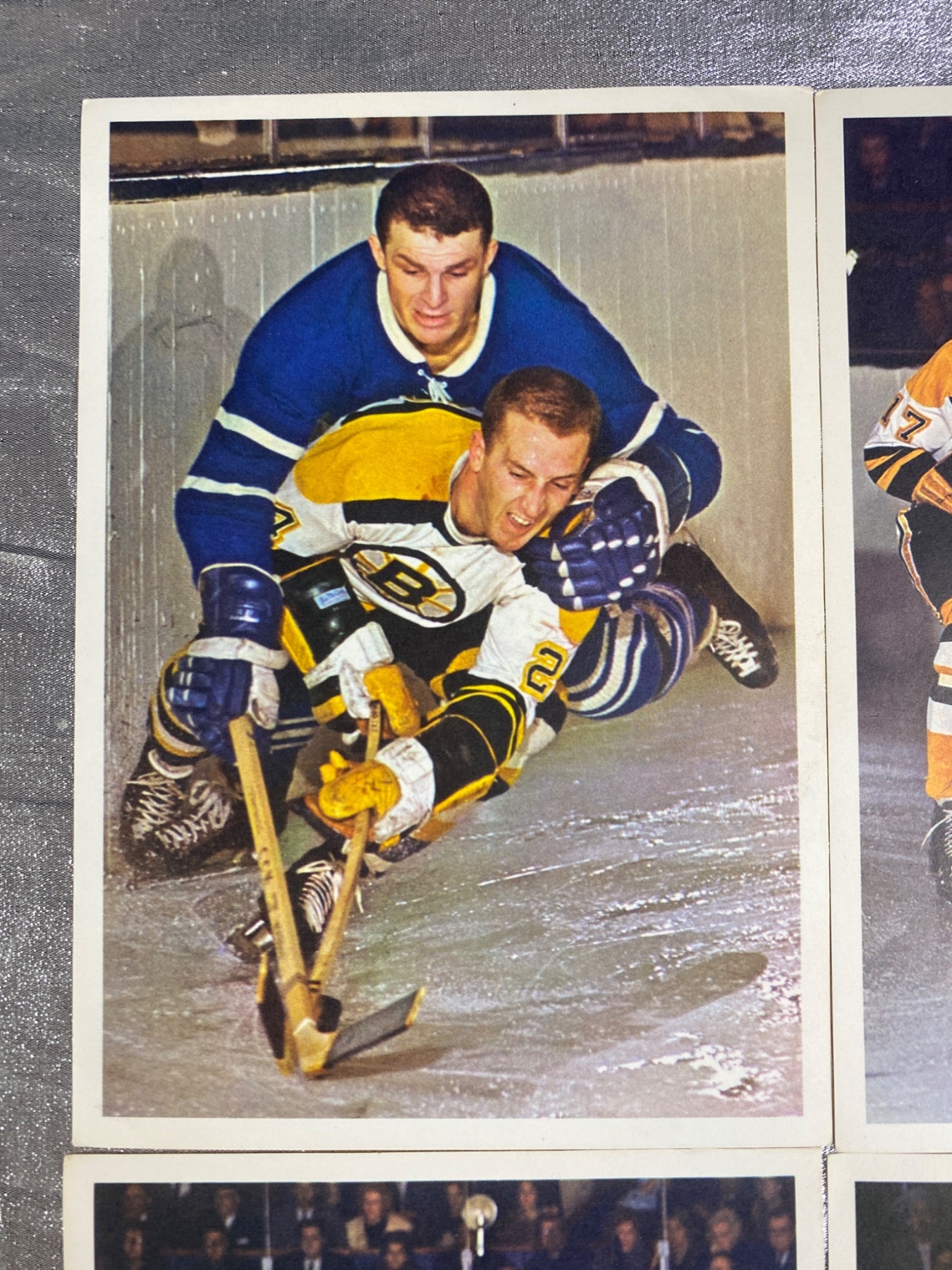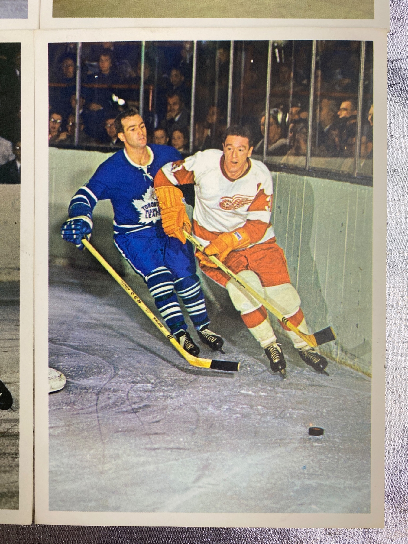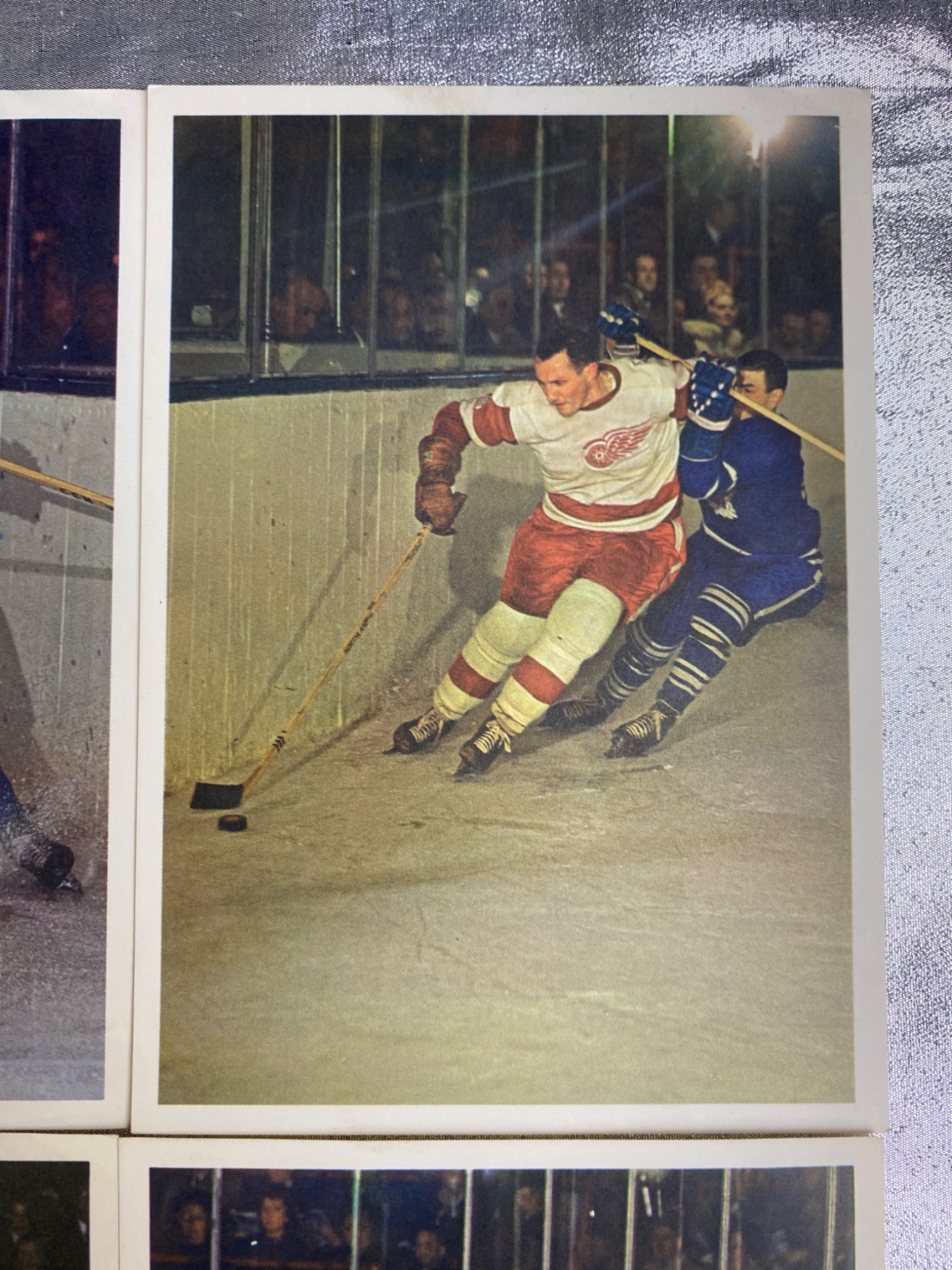 Six vintage ice hockey action trading cards depicting intense on-ice moments from various players and iconic teams, including the Detroit Red Wings, Toronto Maple Leafs, Chicago Blackhawks, and Boston Bruins. Cards showcase detailed full-color imagery and dynamic gameplay scenes. Suitable for sports memorabilia collectors or ice hockey enthusiasts. Minor wear consistent with age.