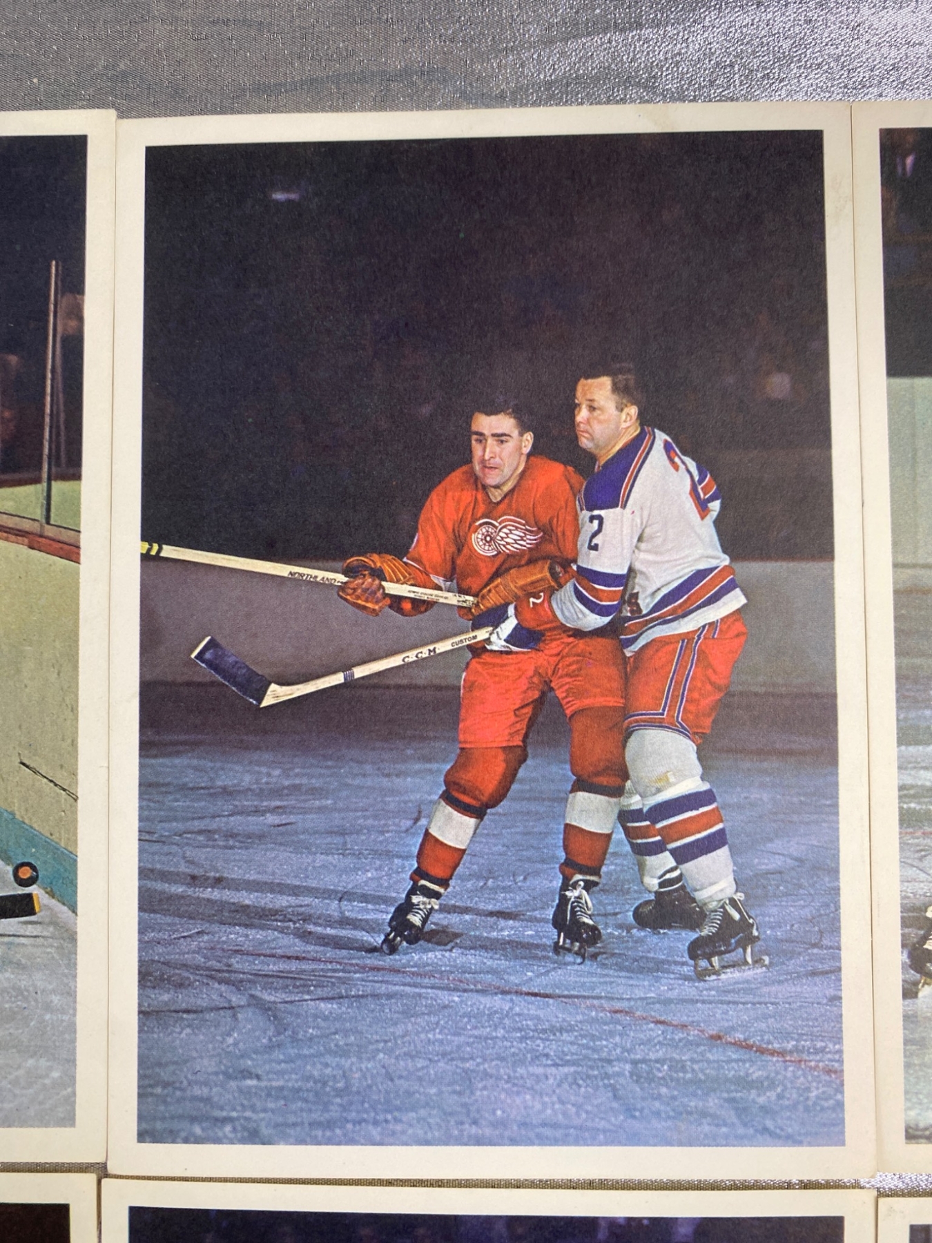 Six color-printed ice hockey postcards showcasing live-action moments from NHL games, featuring players from historic teams like Detroit Red Wings, Toronto Maple Leafs, and Chicago Blackhawks. Each postcard captures intricate on-ice gameplay with vibrant details, appealing for NHL fans and sports memorabilia collectors. Cards appear in overall good condition with no major visible damage.