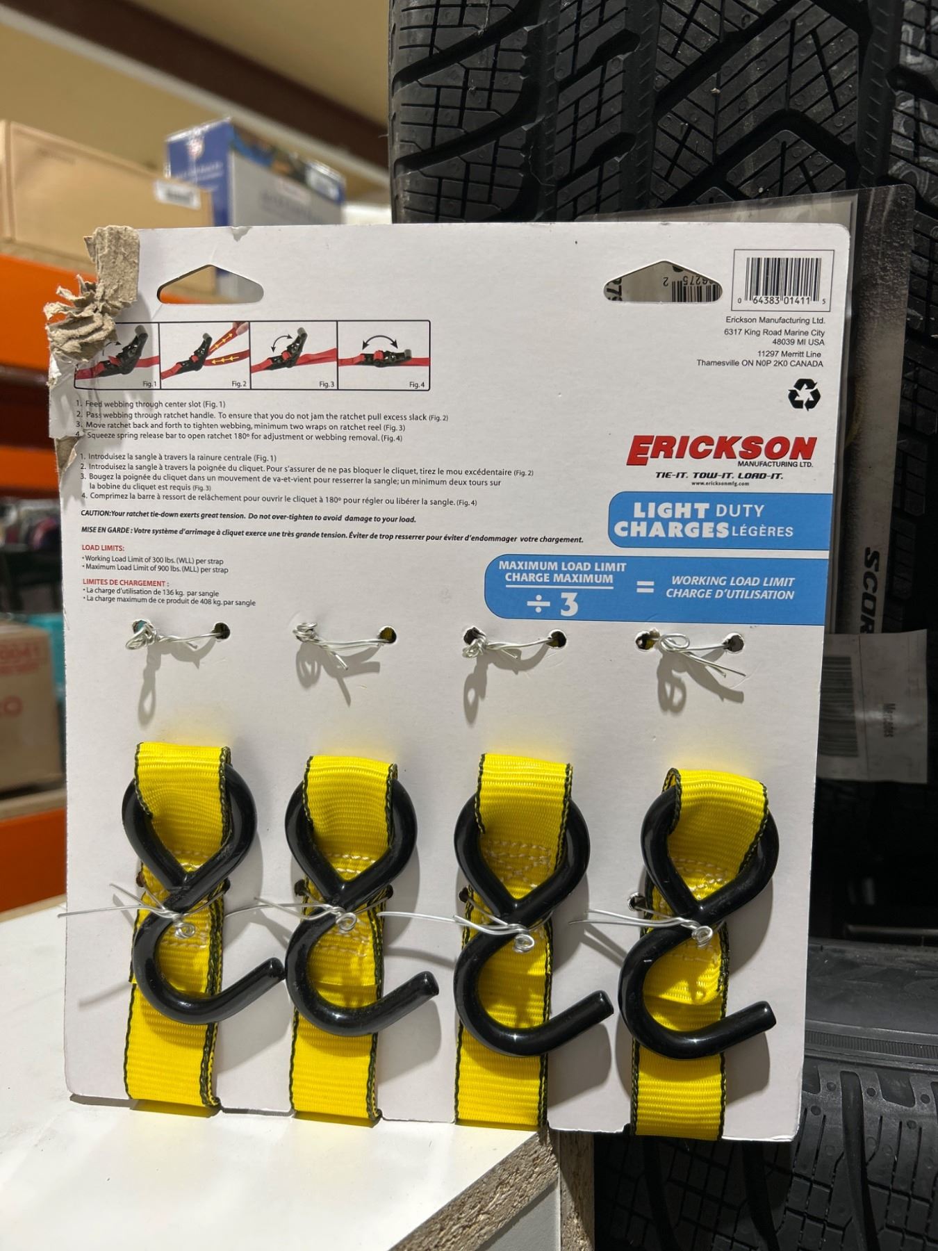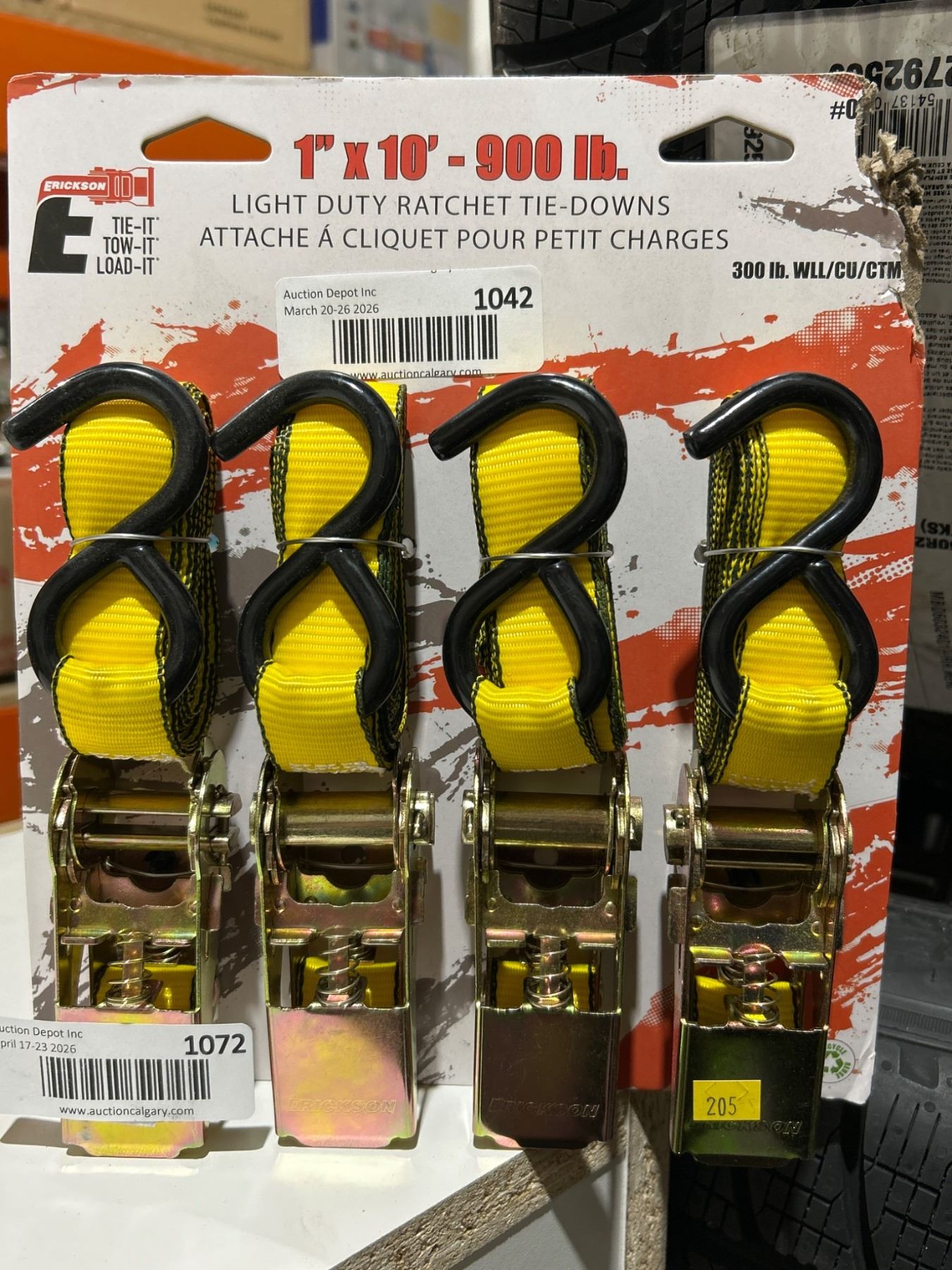 Lot 1072 Erickson 1 in x 10 ft Light Duty Ratchet Tie-Downs, 4 Pieces, 900 lb Capacity
