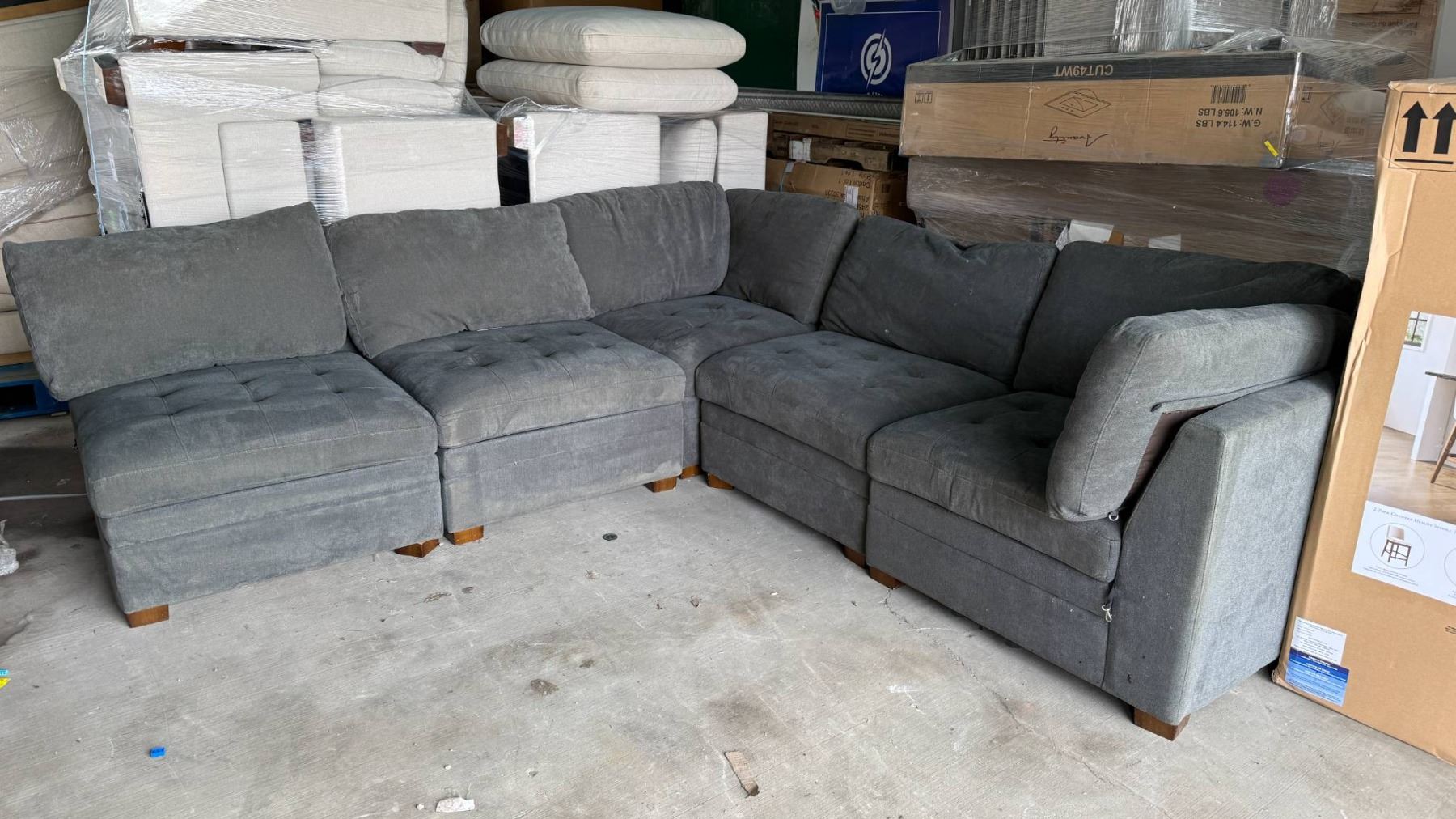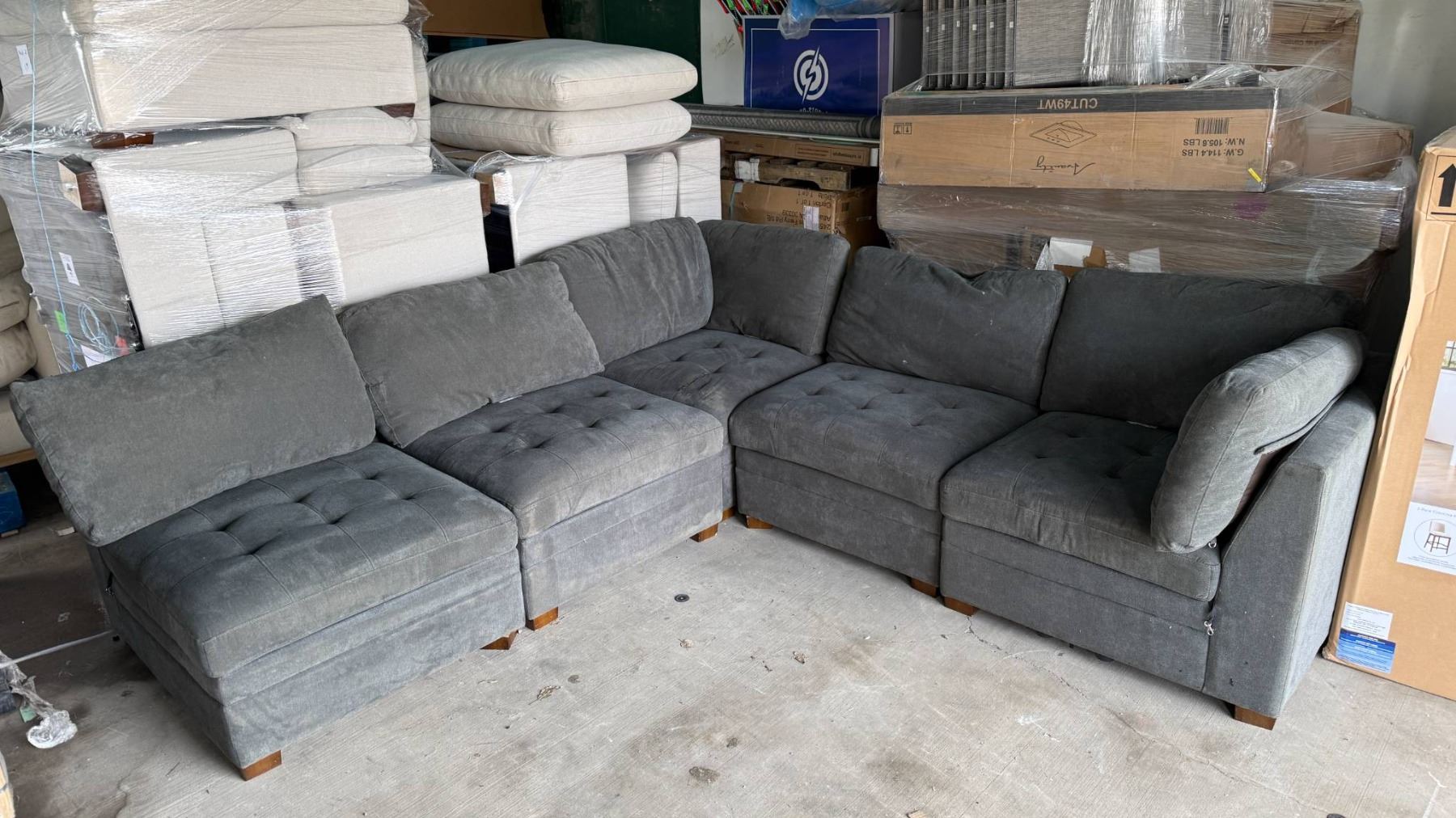 Lot 1222 Modular Gray Fabric Sectional Sofa with Tufted Cushions and Wooden Legs