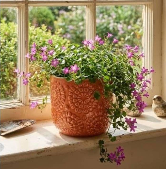 Lot of 2 - Stone & Beam Flowerpot with Textured Floral Design, Orange, 4.5-Inch Diameter