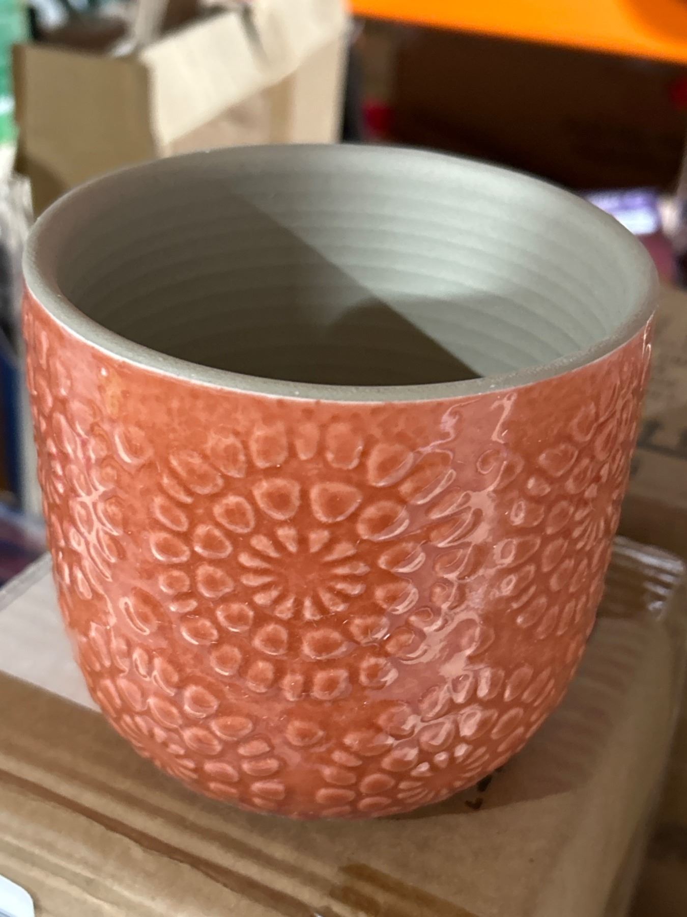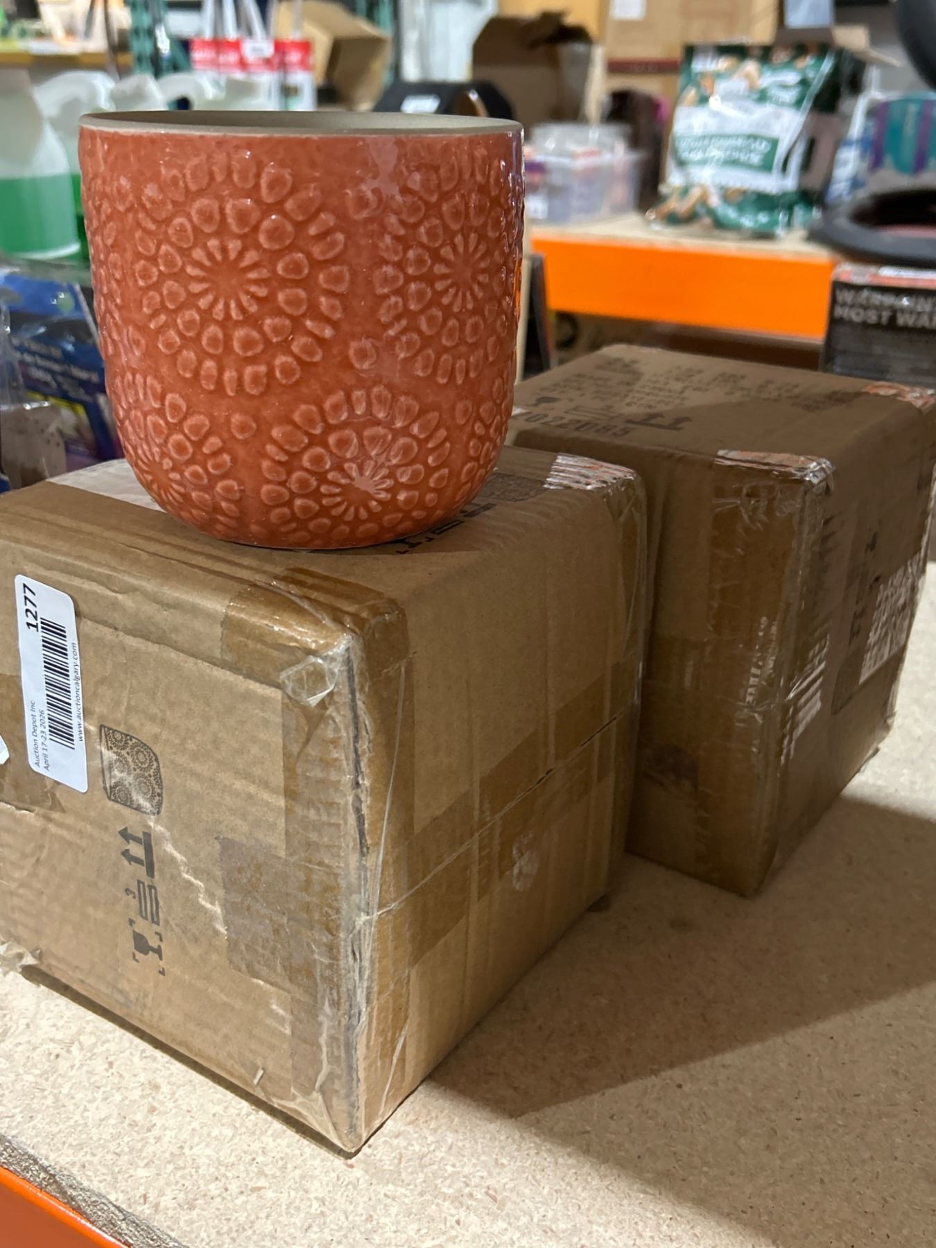 Lot 1277 Lot of 2 - Stone & Beam Flowerpot with Textured Floral Design, Orange, 4.5-Inch Diameter