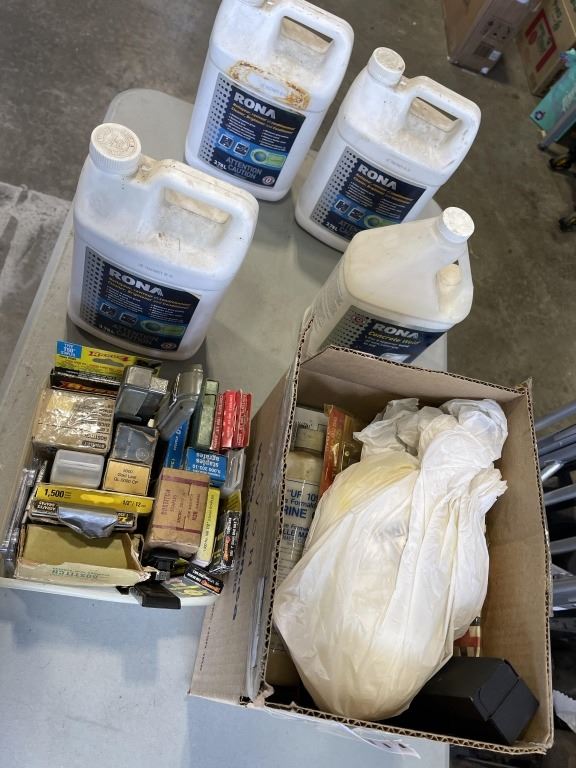 Lot 147 BOX OF NEW OLD STOCK AND 4 JUGS OF SHOP FLUIDS