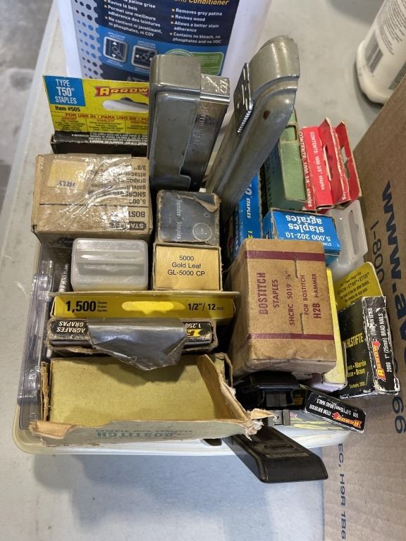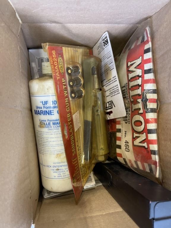 BOX OF NEW OLD STOCK AND 4 JUGS OF SHOP FLUIDS