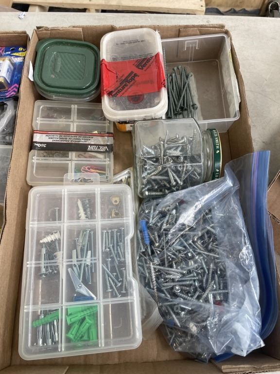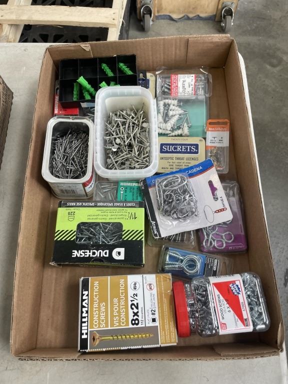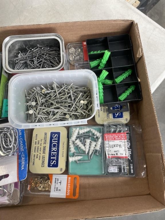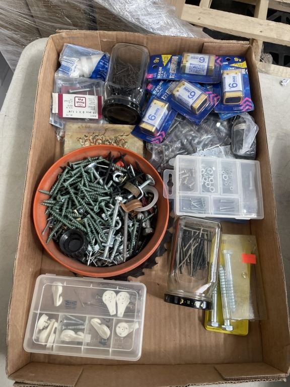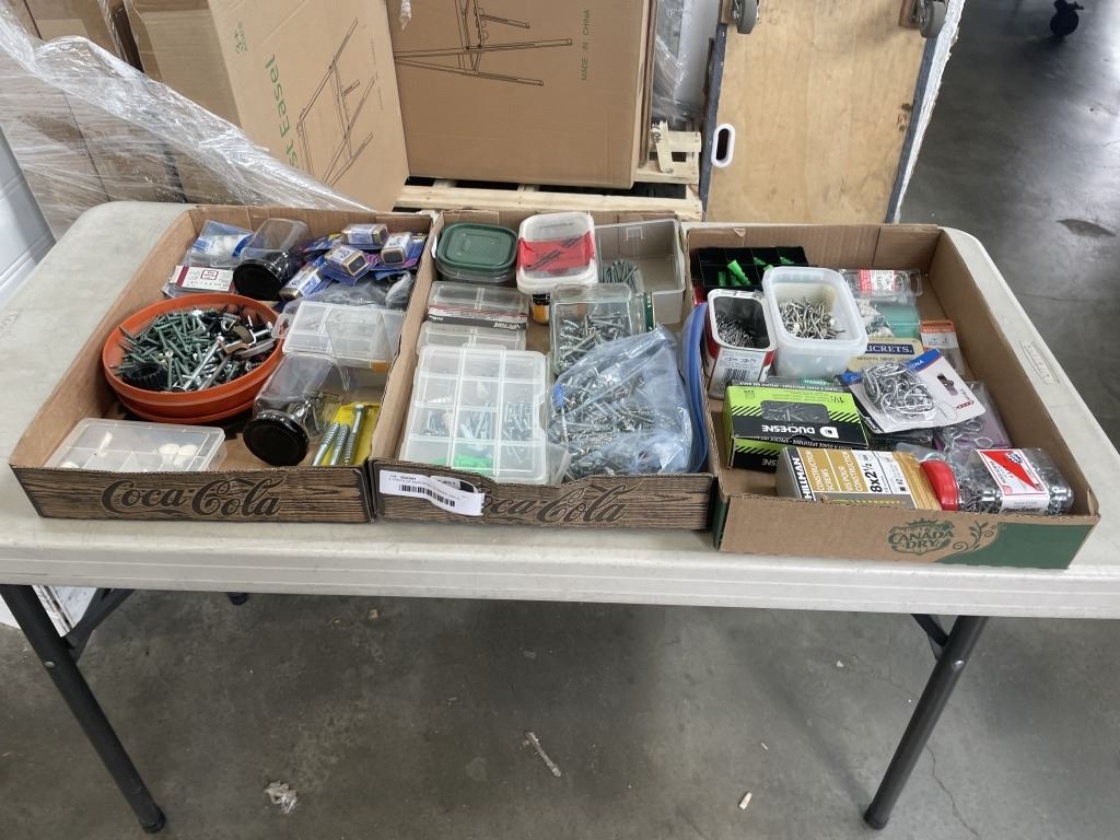 3 TRAYS OF ASSORTED SCREWS, NAILS, NUTS AND BOLTS, ETC