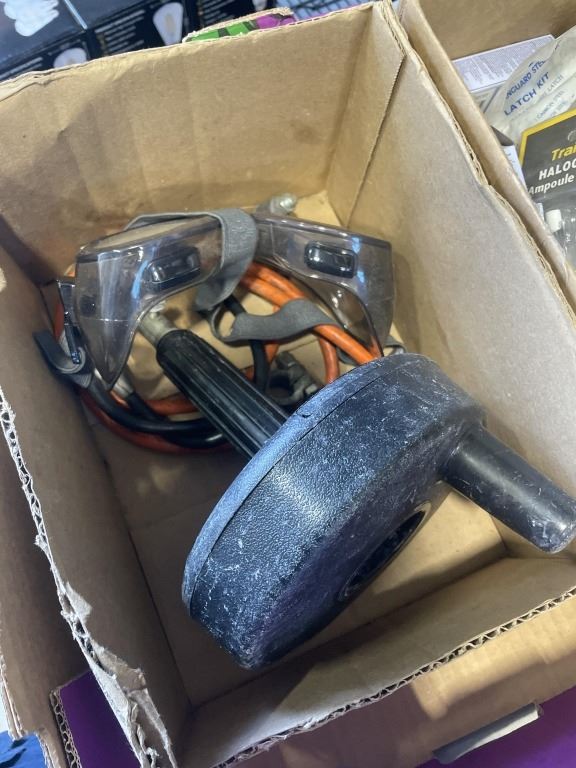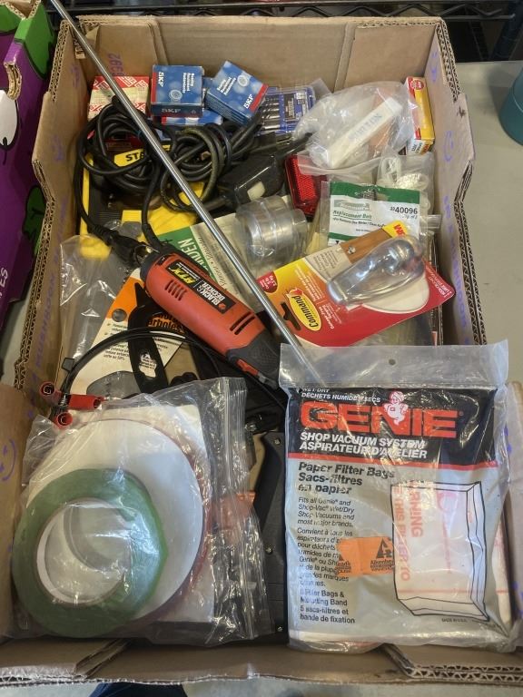 TRAY OF ASSORTED SHOP HARDWARE AND ROTARY TOOL, GLU GUNS ETC AND TRAY OF HALOGEN REPLACEMENT BULBS, DRAIN SNAKE, ETC