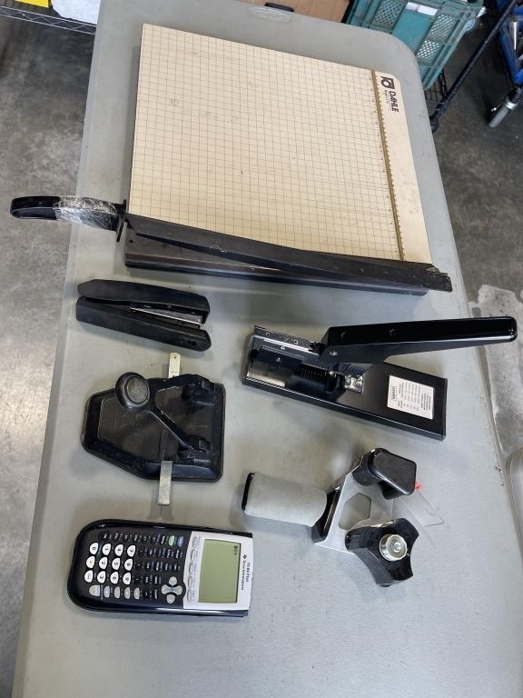ASSORTED OFFICE ITEMS INLCUDING PAPER CUTTER, SCIEWNTIFIC CALCULATOR ETC