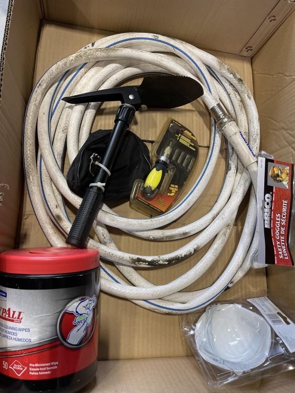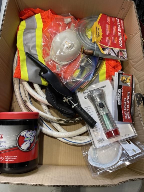 Lot 175 BOX OF WATER HOSE REFLECTIVE JACKET, PARTICLE MASKS EMERGENCY LIGHT AND MORE