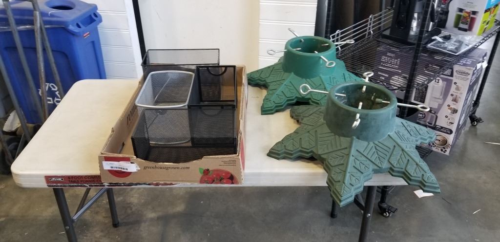 Lot 200 2 CHRISTMAS TREE STANDS AND LOT OF BLACK METAL ORGANIZERS