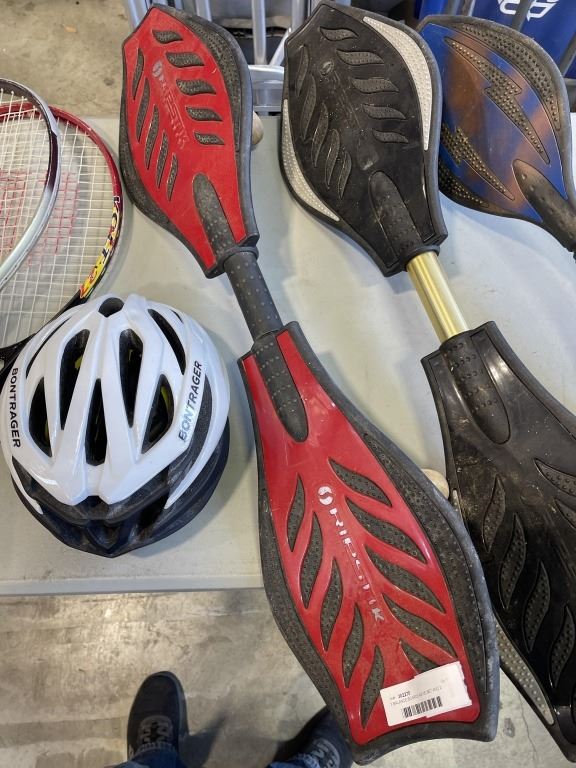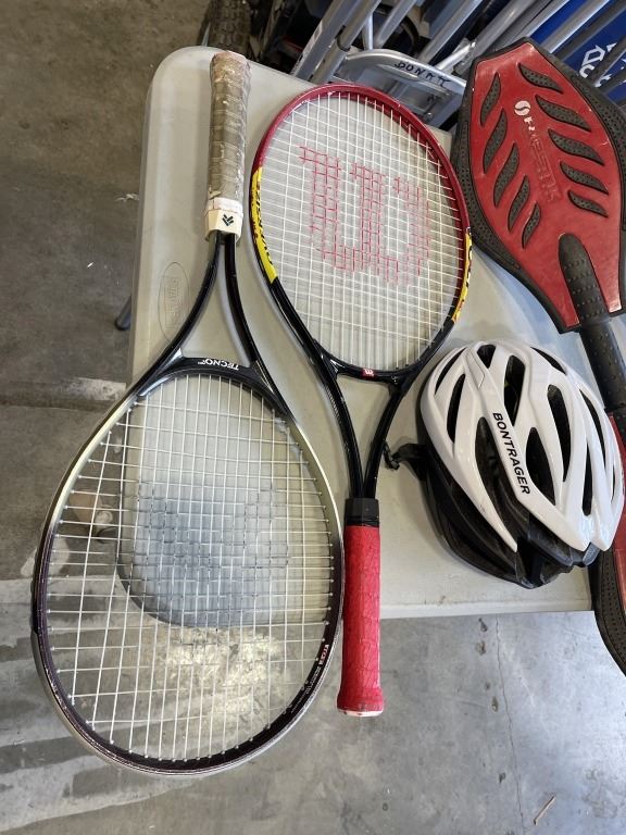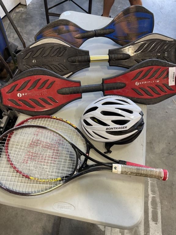 Lot 217 3 BALANCE BOARDS AND HELMET AND 2 TENNIS RACKETS