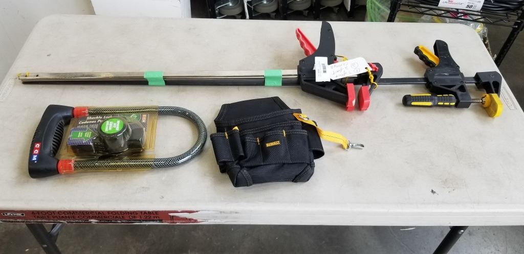 Lot 284 2 3FT AND 2- 2FT QUICK GRIP CLAMPS AND DEWALT TOOL POUCH