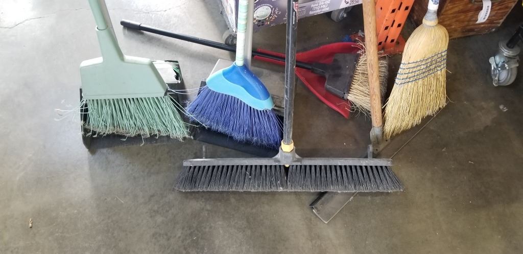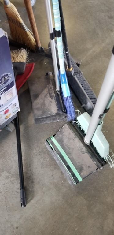 ASSORTED BROOMS, SQUEEGIE, AND LOBBY DUST PANS