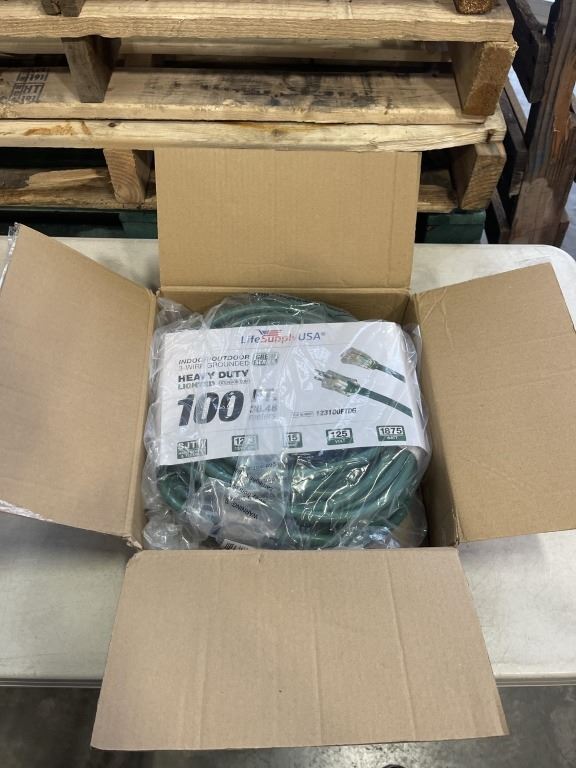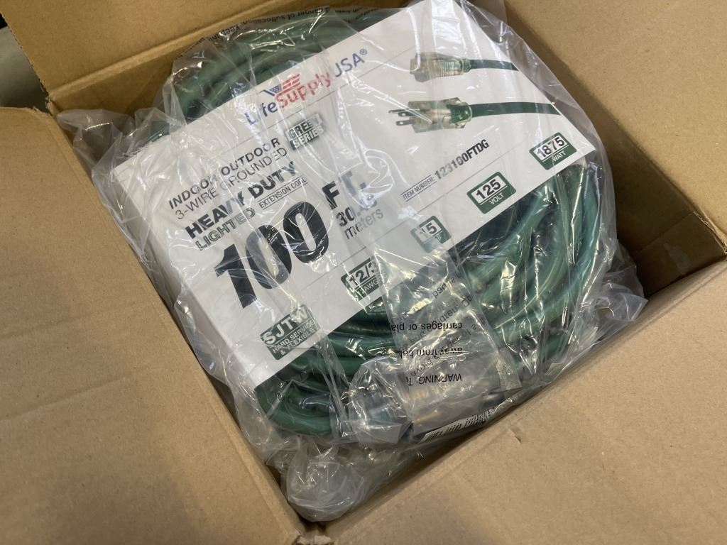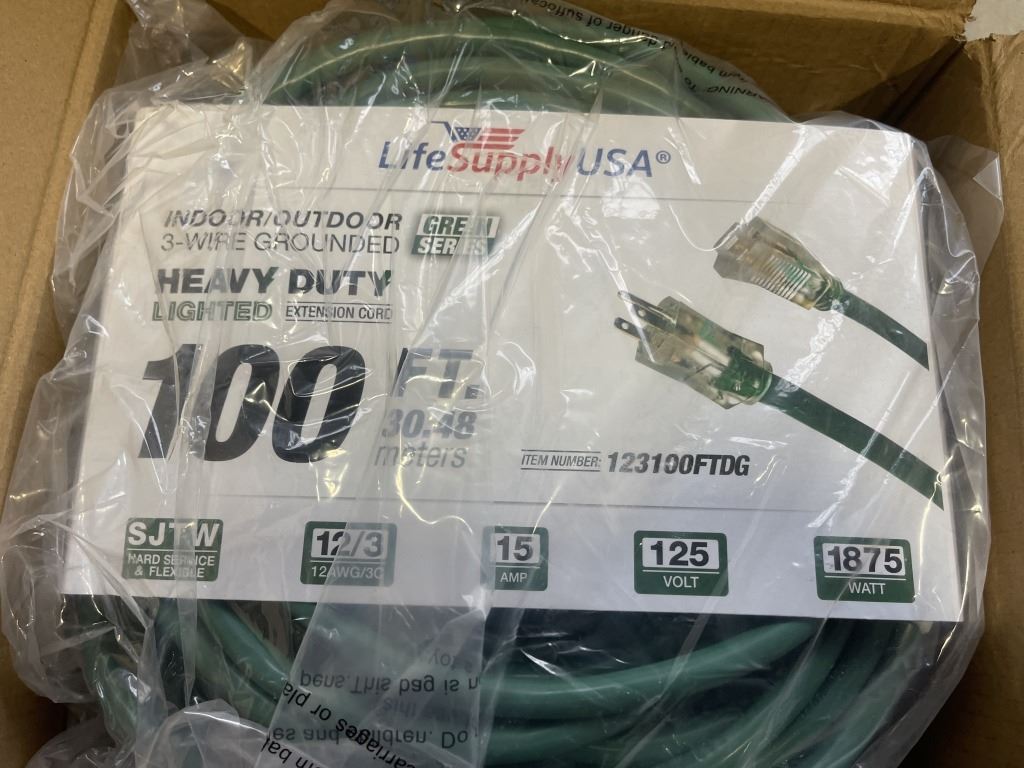 Lot 391 AS NEW 100FT GREEN INDOOR OUTDOOR HEAVY DUTY LIGHTED 3 WIRE GROUNDED EXTENSION CORD 12AWG