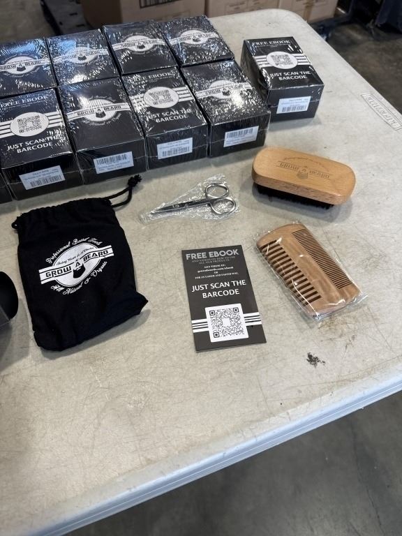 Lot 402 12 NEW GROW A BEARD KITS, EACH KIT INCLUDES WOODEN BRUSH, DOUBLE SIDED COMB, TRIMMING SCISSORS, CARR
