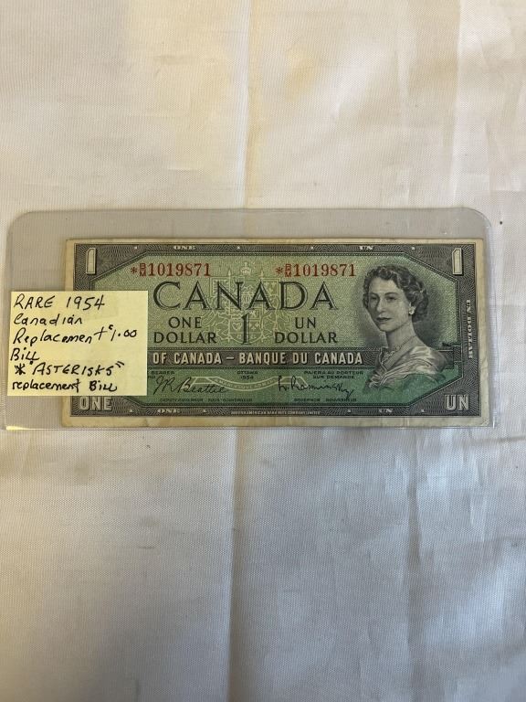 RARE 1954 CANADIAN REPLACEMENT $1 BILL, ASTERICKS REPLACEMENT BILL