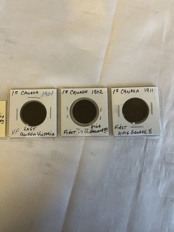 3 CANADIAN LARGE CENTS 1901 LAST QUEEN VICTORIA, 1902 FRIST KING EDWARD VII, 1911 FIRST KING GEORGE V RARE