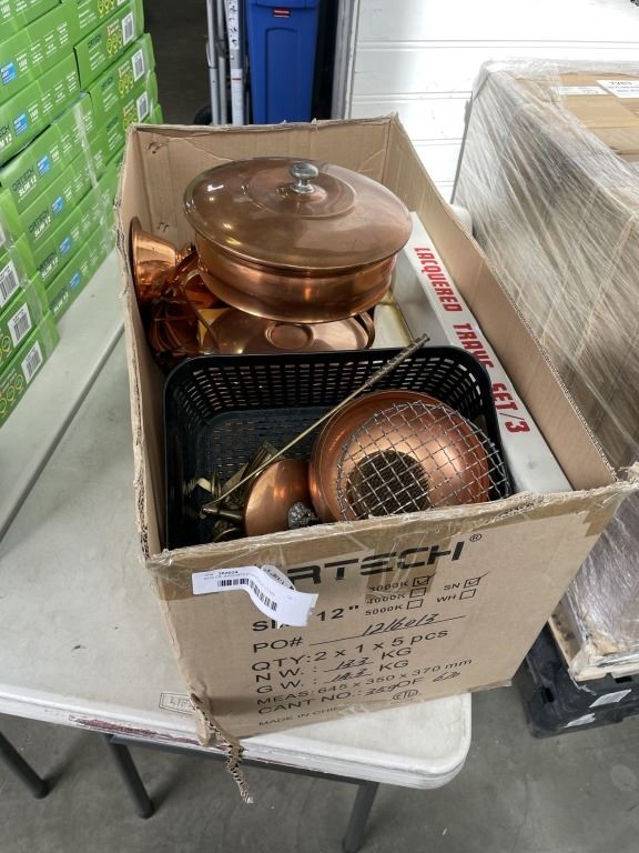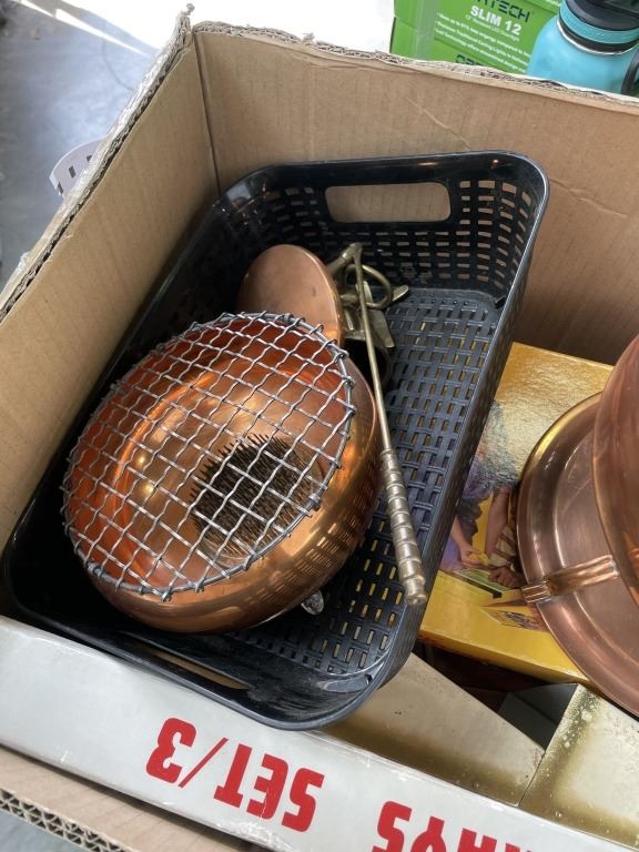Lot 528 BOX OF ASSORTED VINTAGE ITEMS INCLUDING LAQUORED TRAY SET, COPPER SERVING ITEMS