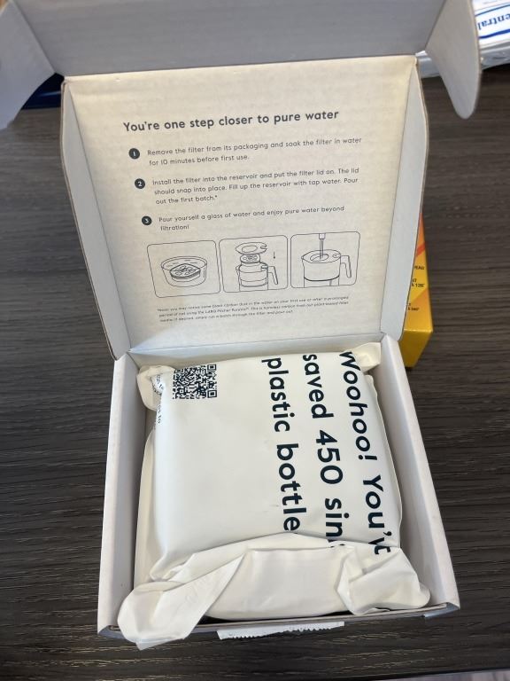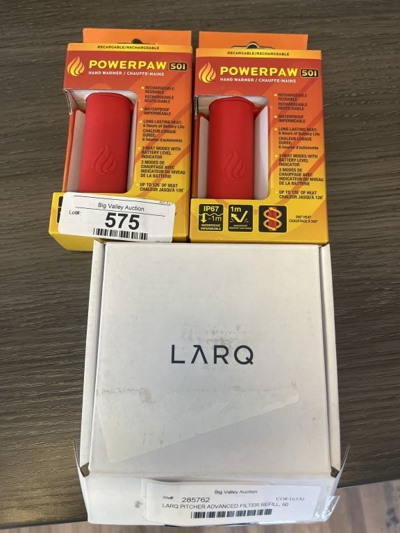 Lot 575 LARQ PITCHER ADVANCED FILTER REFILL, 60 GALLON AND 2 POWERPAW HAND WARMERS