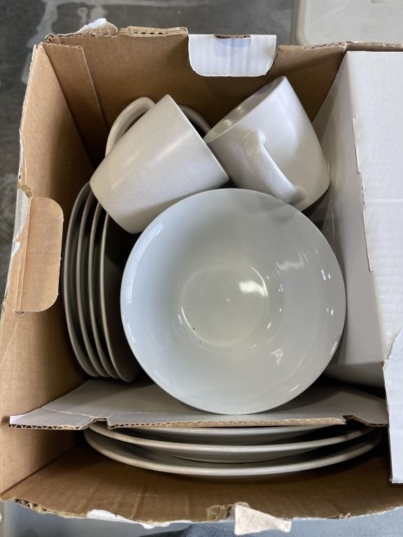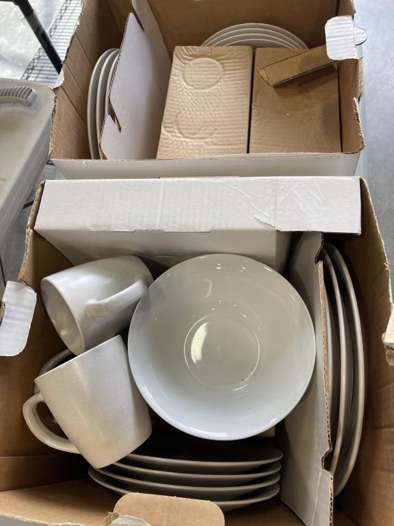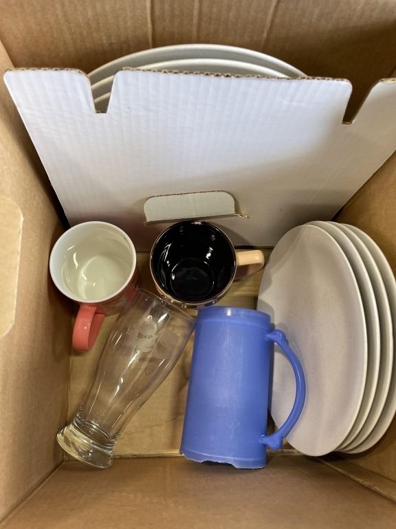 2 BOXES OF DINNERWARE, MUGS AND MORE