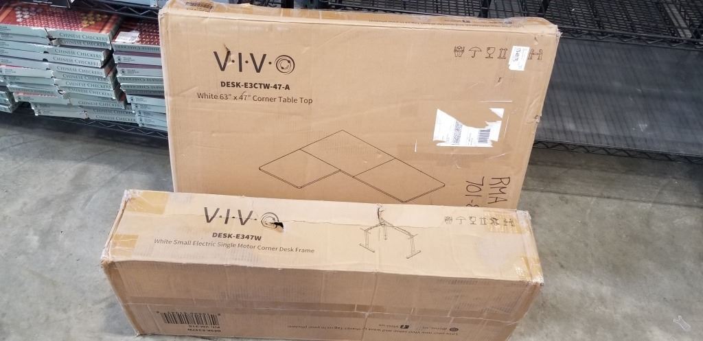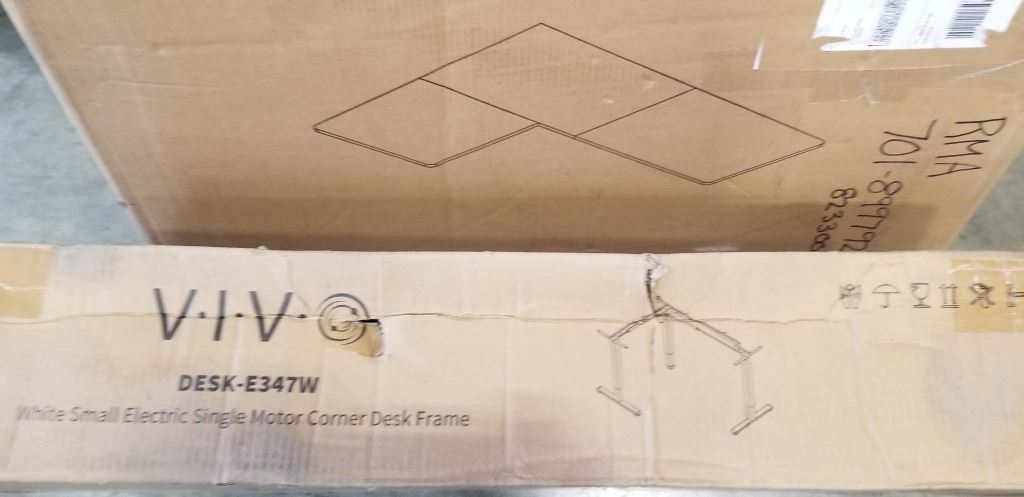 VIVO WHITE 63" BY 47" CORNER TABLE TOP AND WHITE SMALL ELECTRIC SINGLE MOTOR CORNER DESK FRAME
