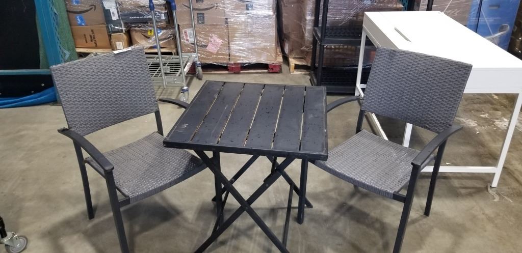 2 RATTAN STACKING PATIO CHAIRS AND FOLDING TABLE