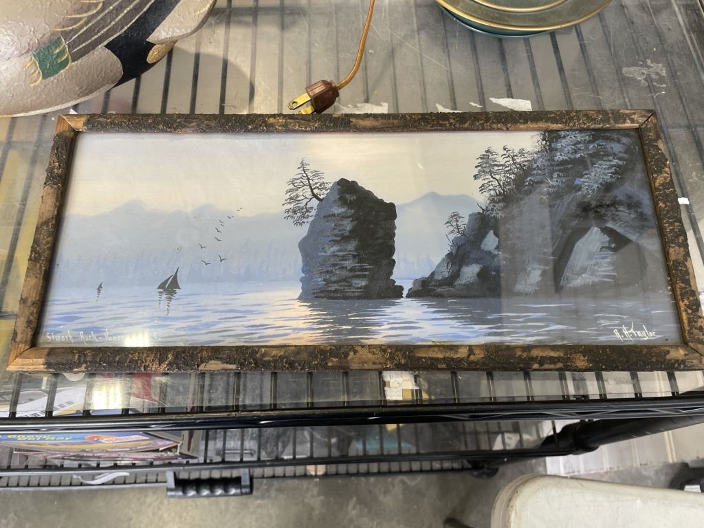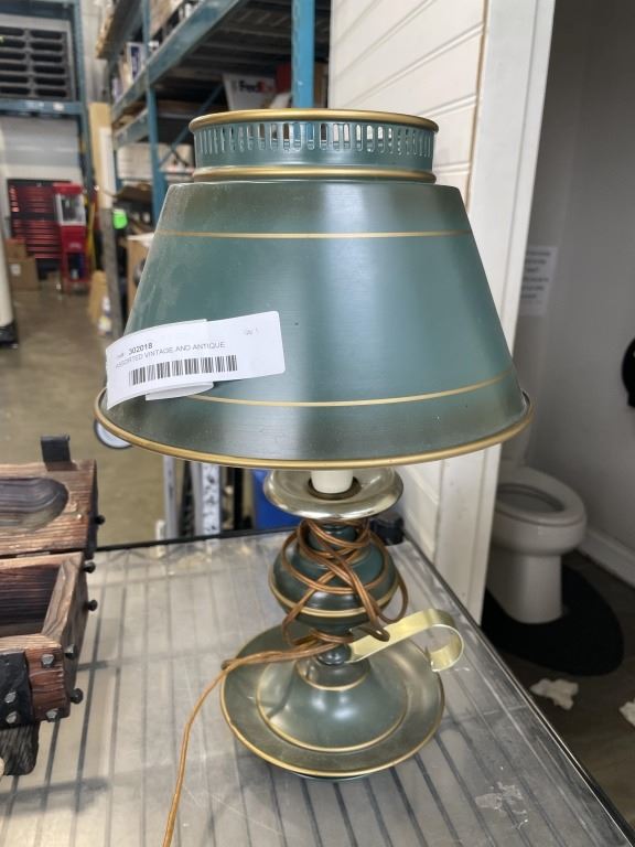 ASSORTED VINTAGE AND ANTIQUE COLLECTIBLES, LAMPS, BOXES ETC