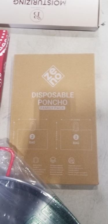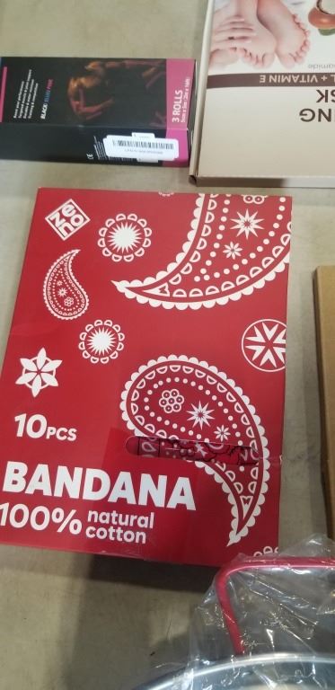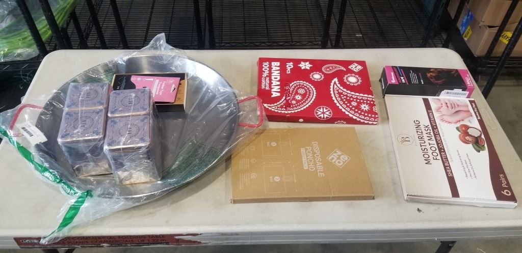 LARGE LOT INCLUDING BAKING PAN, 4 TINS OF BLACK CURRANT TEA BAGS, BLOOMORA MOISTURIZING FOOT MASK, 10 PACK BANDANAS, DISPOSABLE PONCHOS, FASHION TAPE, KINESIOLOGY TAPE, 2 IN 1 BROW LAMINATION & LASH LIFT KIT
