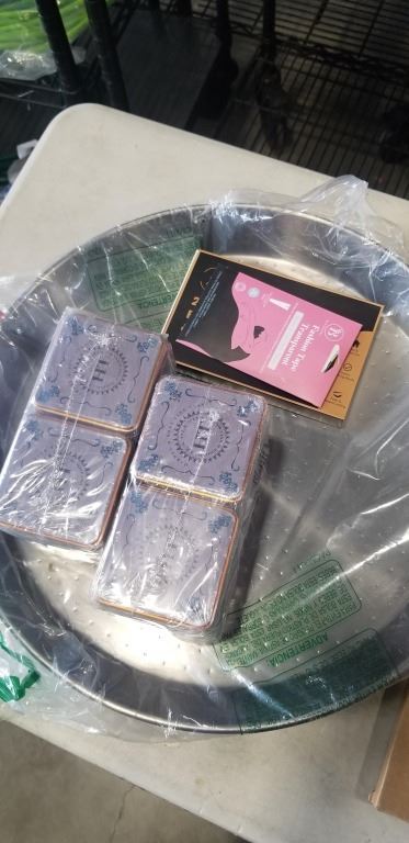 Lot 1177 LARGE LOT INCLUDING BAKING PAN, 4 TINS OF BLACK CURRANT TEA BAGS, BLOOMORA MOISTURIZING FOOT MASK, 1