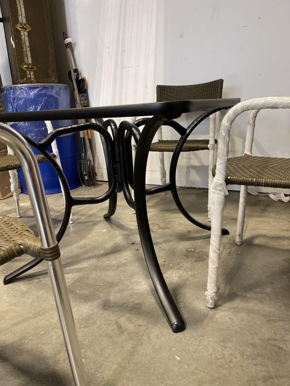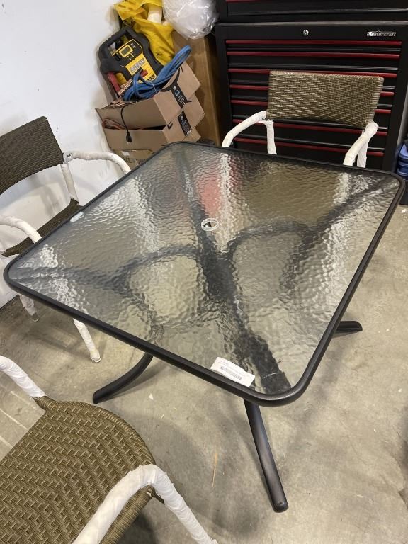 Lot 1241a BRAND NEW GLASS TOP SQAURE PATIO WITH 4 BROWN STACKING CHAIRS, 36 INCH SQUARE TABLE
