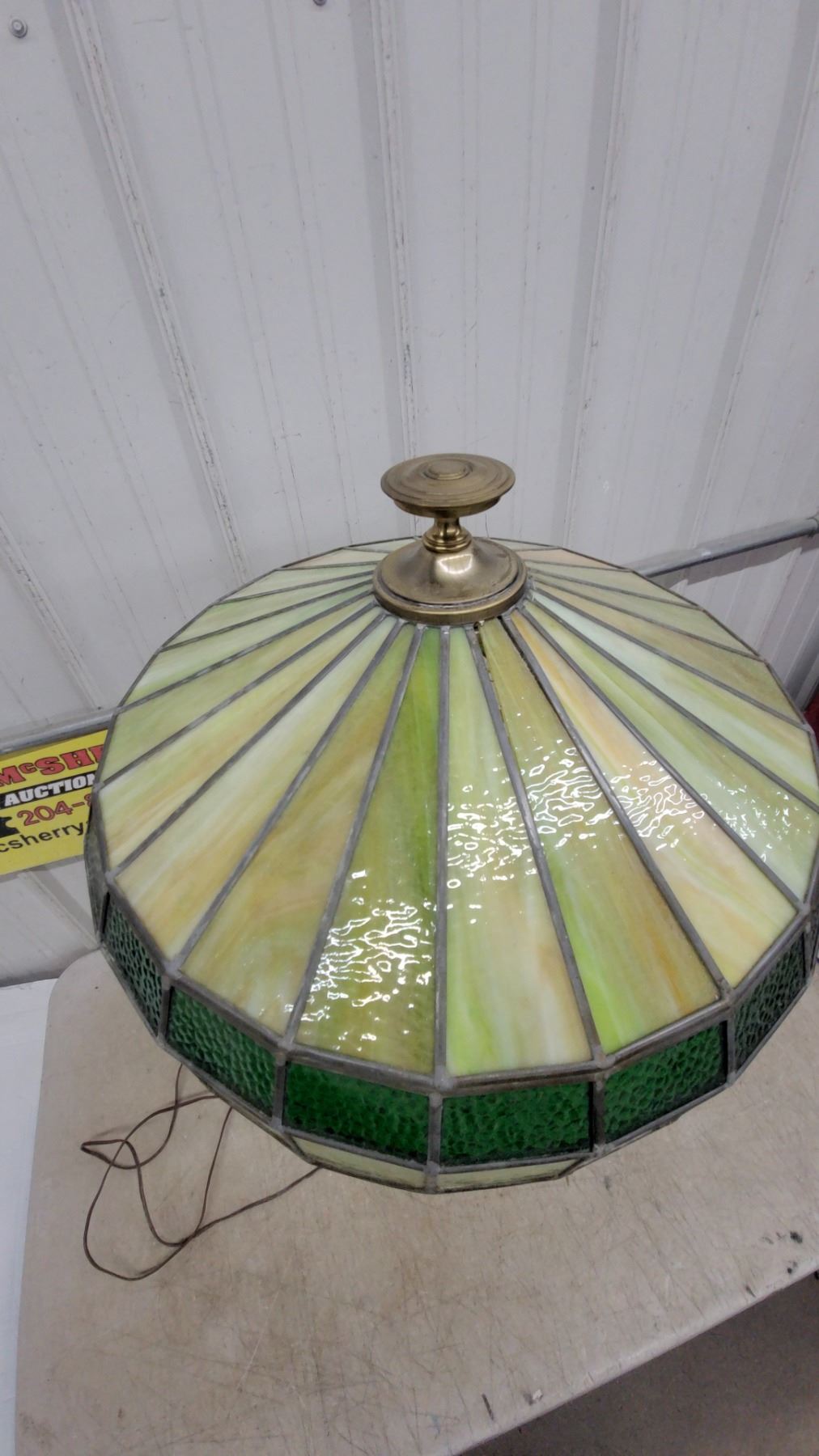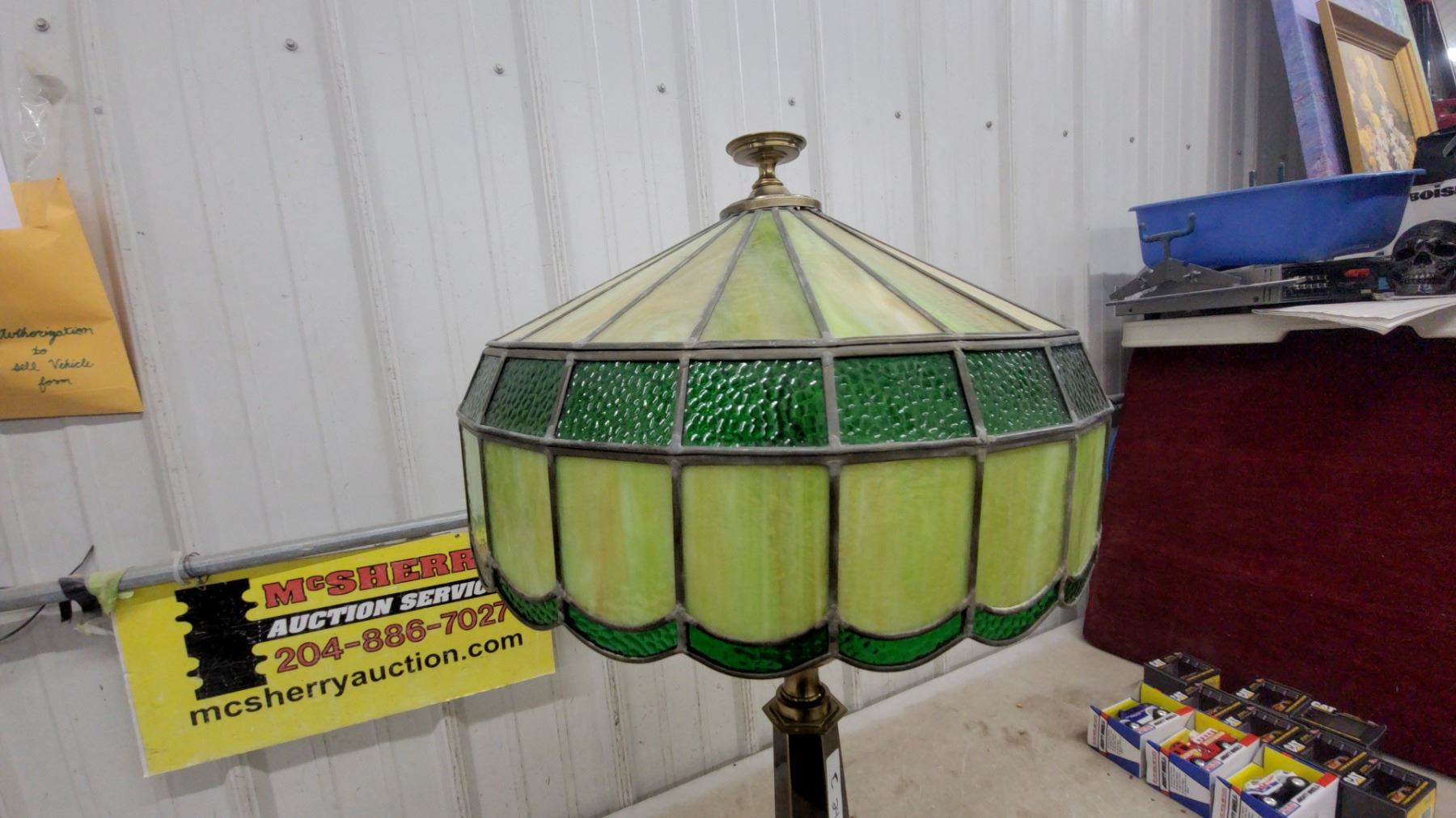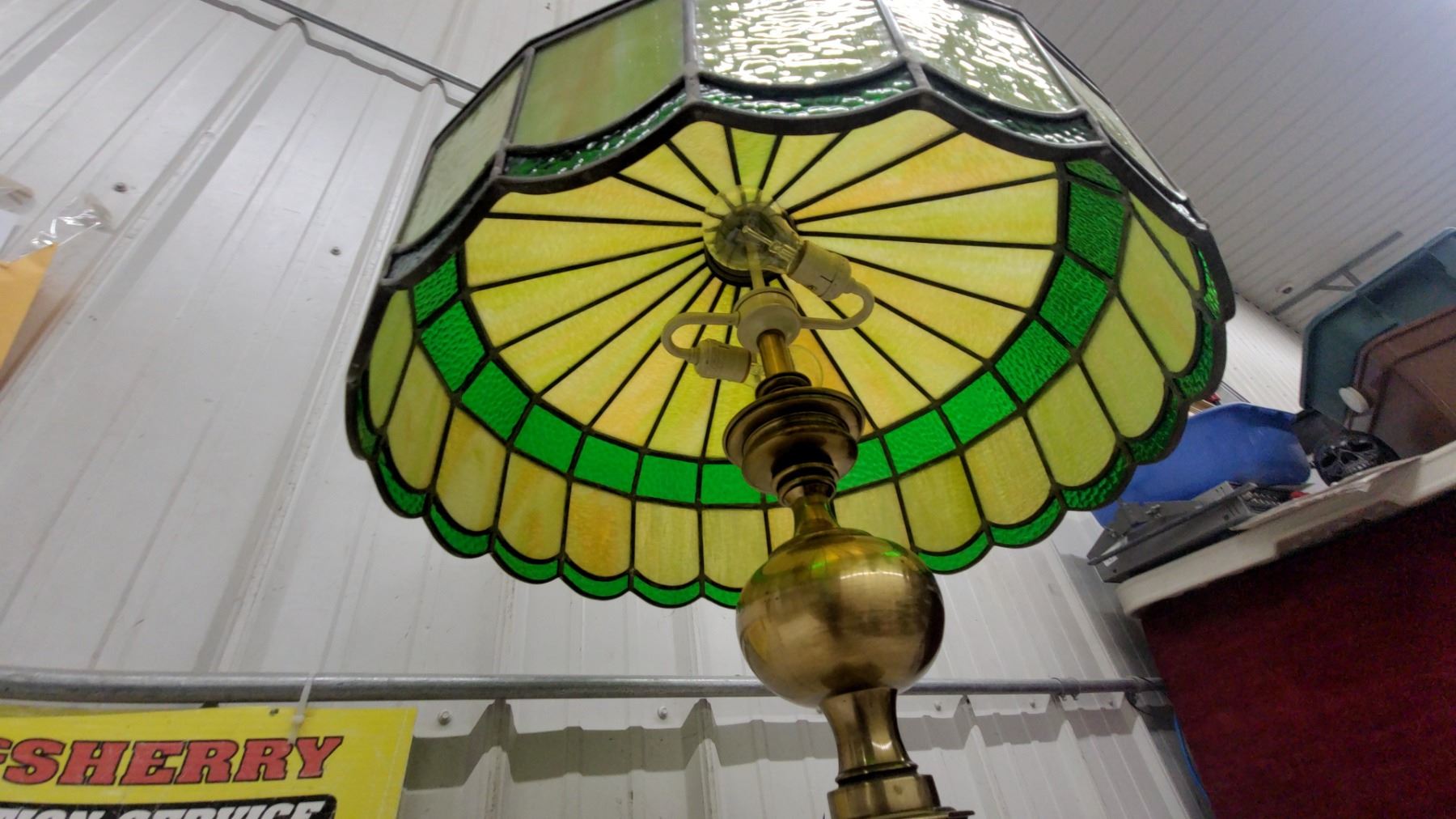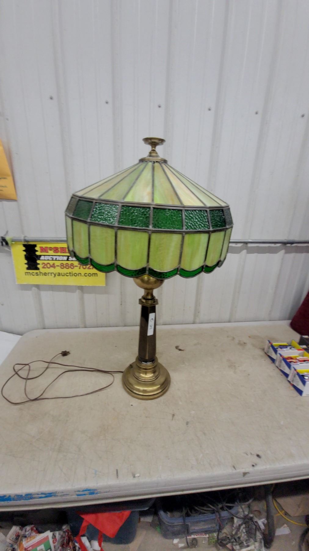 Lot 24 Tiffany-Style Stained Glass Table Lamp with Brass Base, Green/Yellow Shade