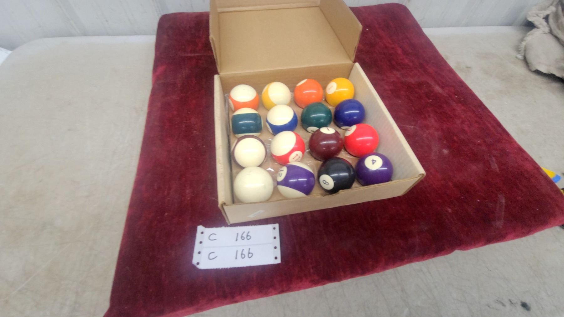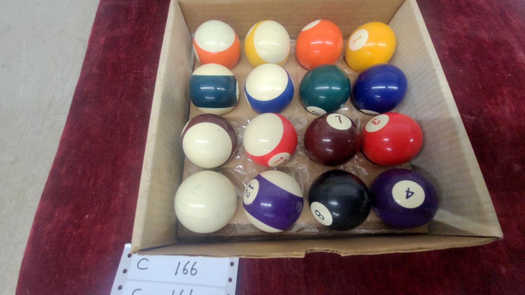 Lot 166 Set of Pool/Billiard Balls in Cardboard Box, Standard Numbered Solids and Stripes with Cue Ball