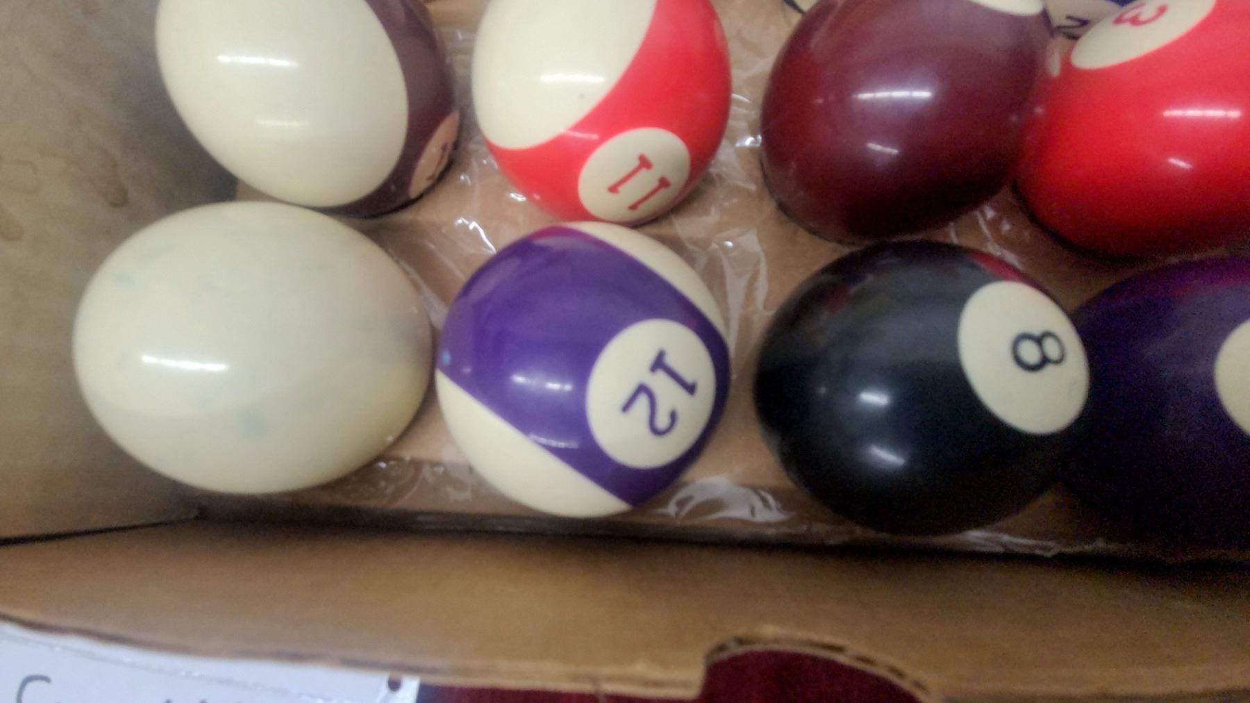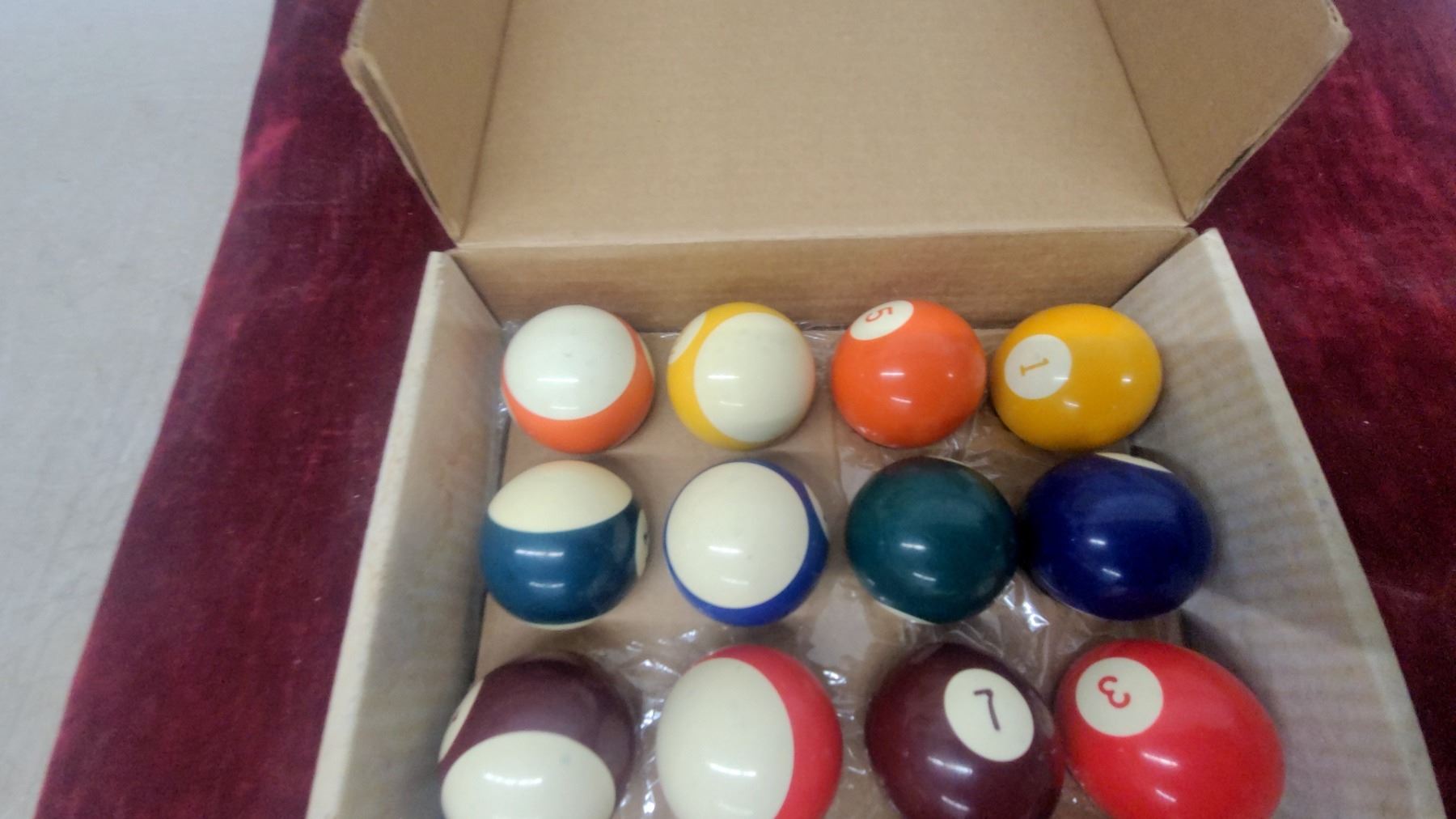 Set of Pool/Billiard Balls in Cardboard Box, Standard Numbered Solids and Stripes with Cue Ball