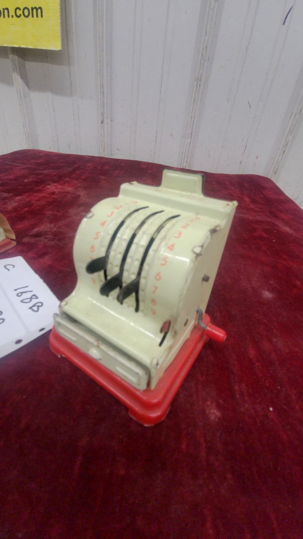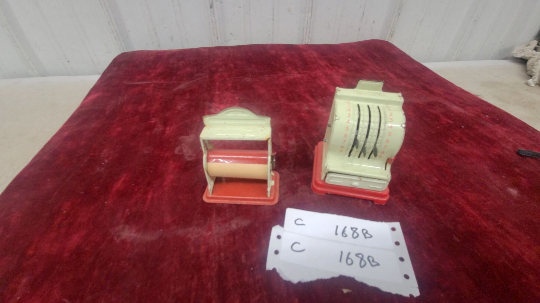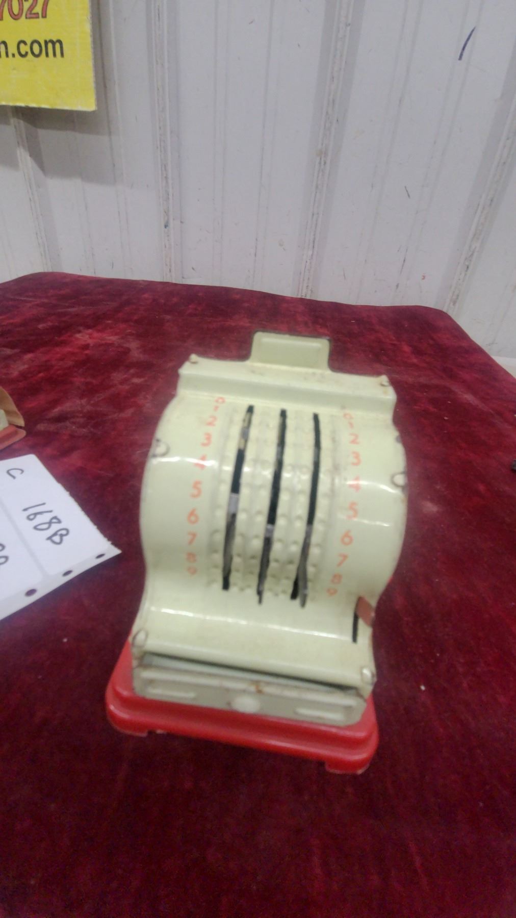 Lot 168B Vintage Toy Cash Register with Red Base and Cream Body, Numbered Dial Mechanism and Paper Dispenser