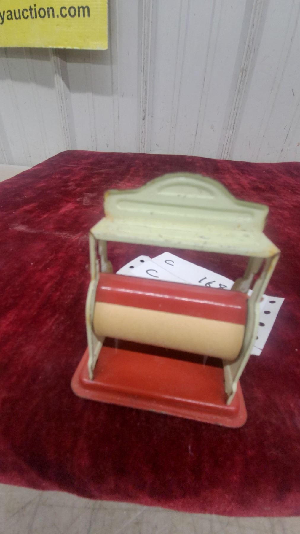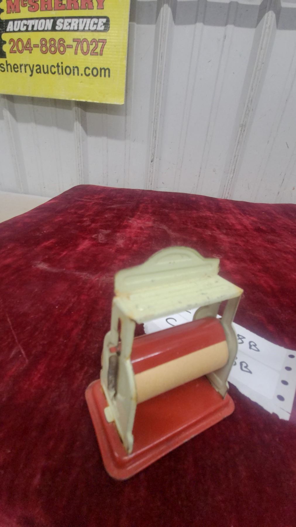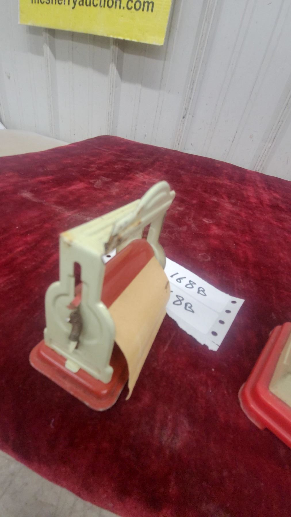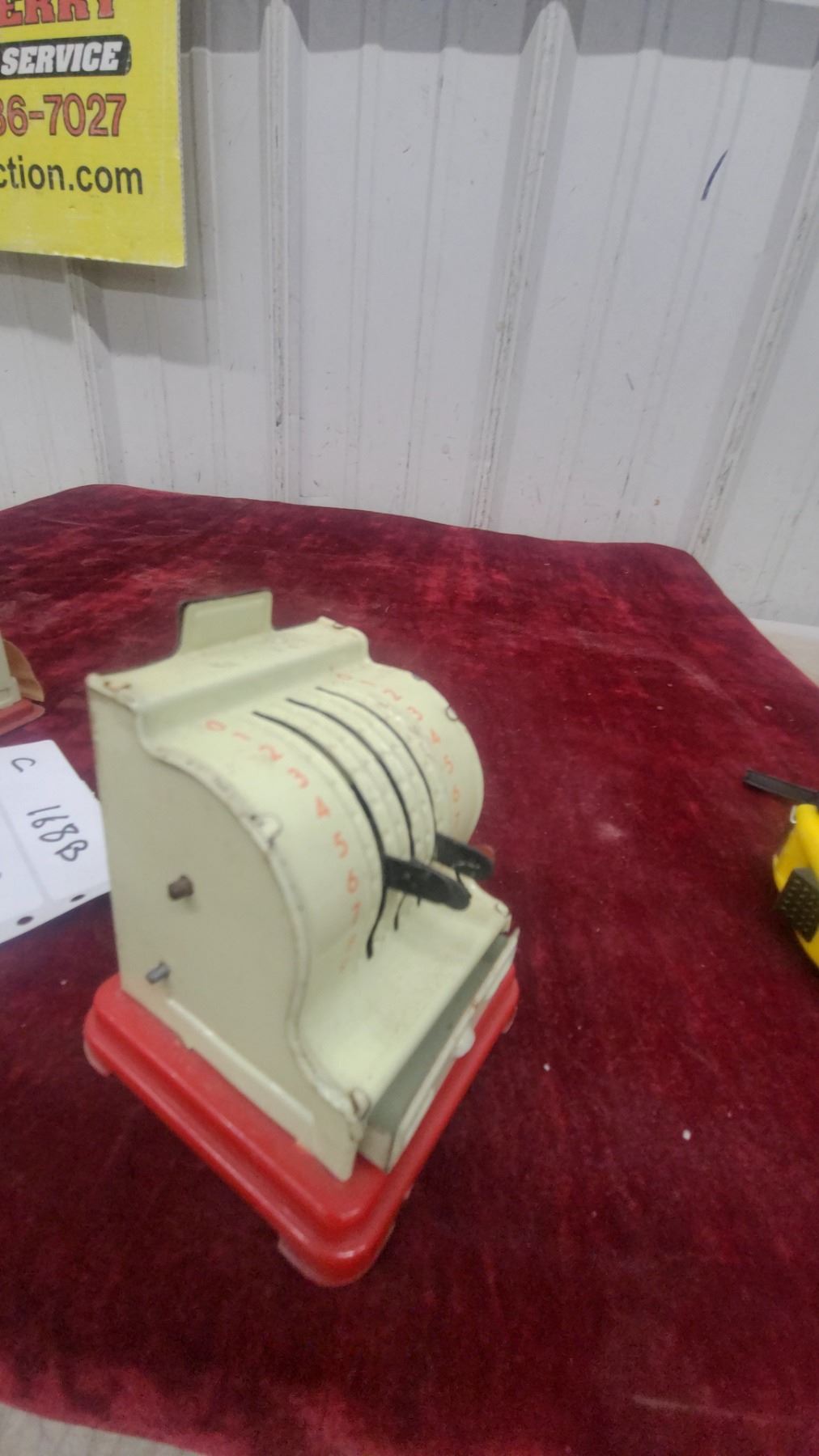 Lot 168B Vintage Toy Cash Register with Red Base and Cream Body, Numbered Dial Mechanism and Paper Dispenser