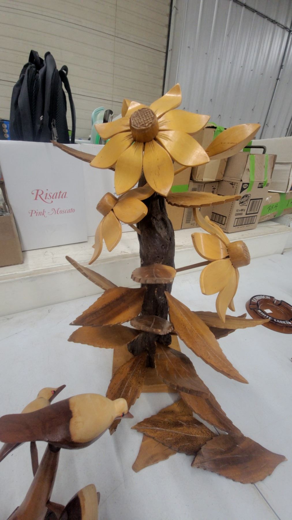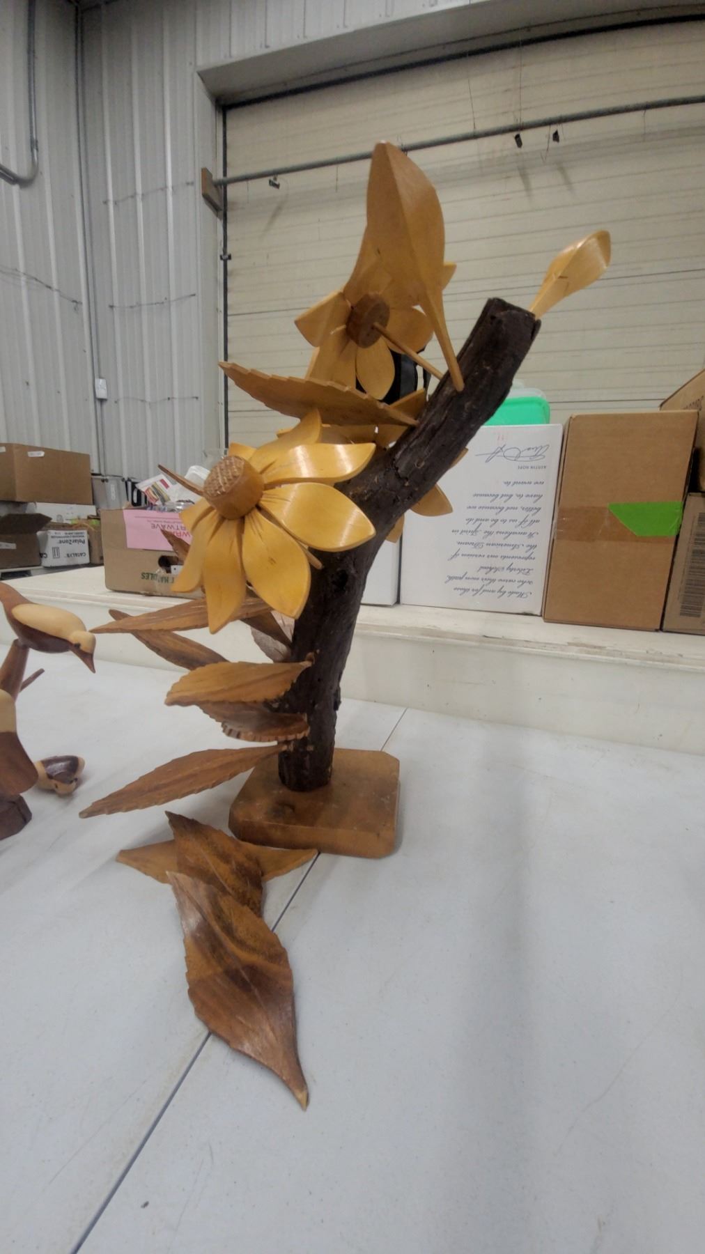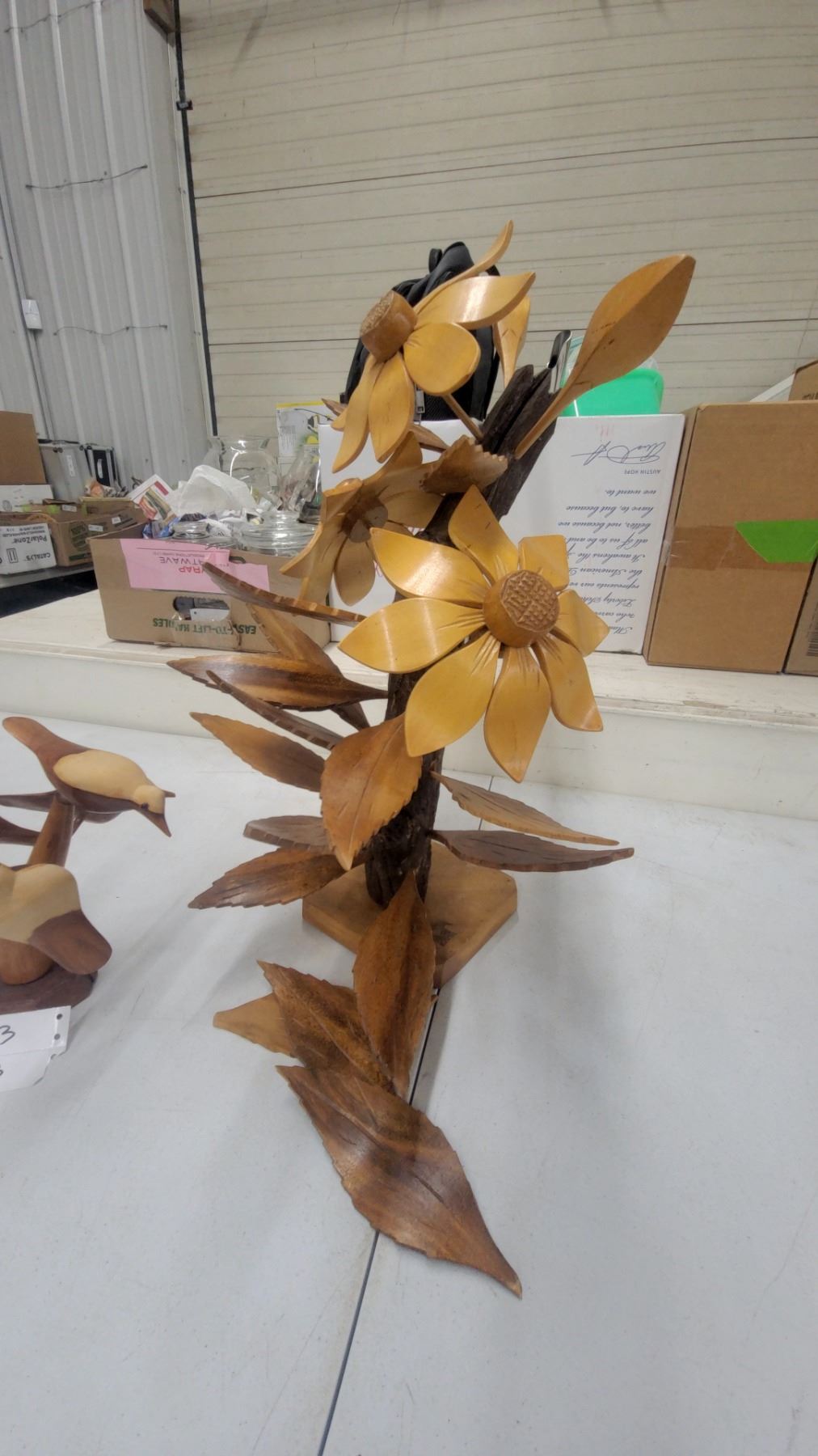 Lot 173 Carved Wooden Floral Sculpture with Sunflowers and Bird Figurine, Decorative Folk Art Set
