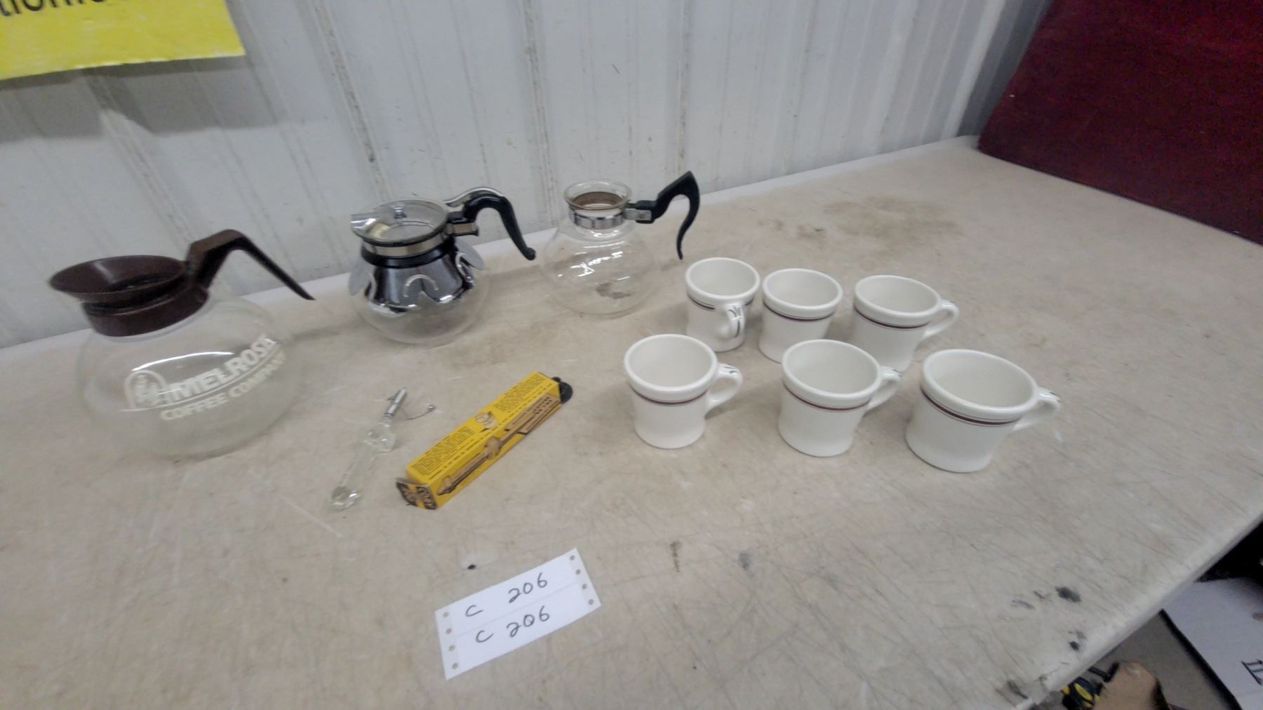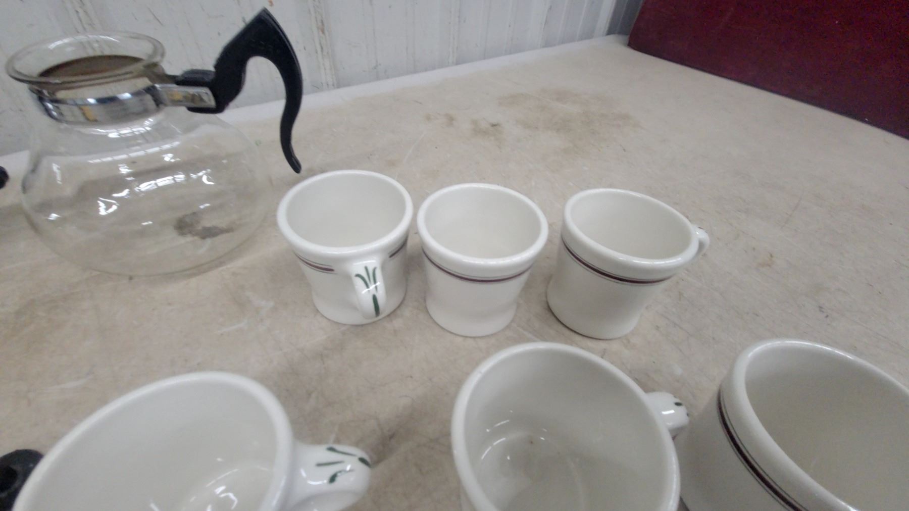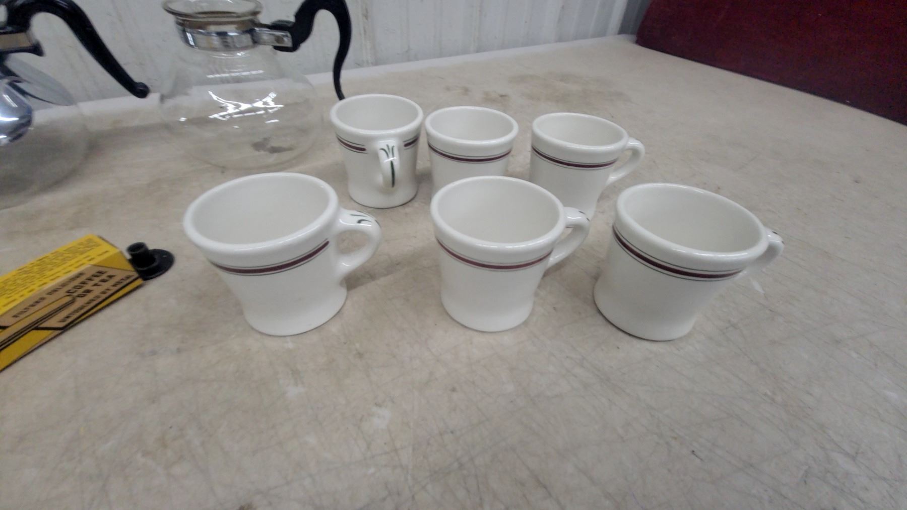 Lot 206 Vintage Glass Coffee Carafe with Brown Handle, 6 White Grindley Hotelware Ceramic Mugs with Stripe
