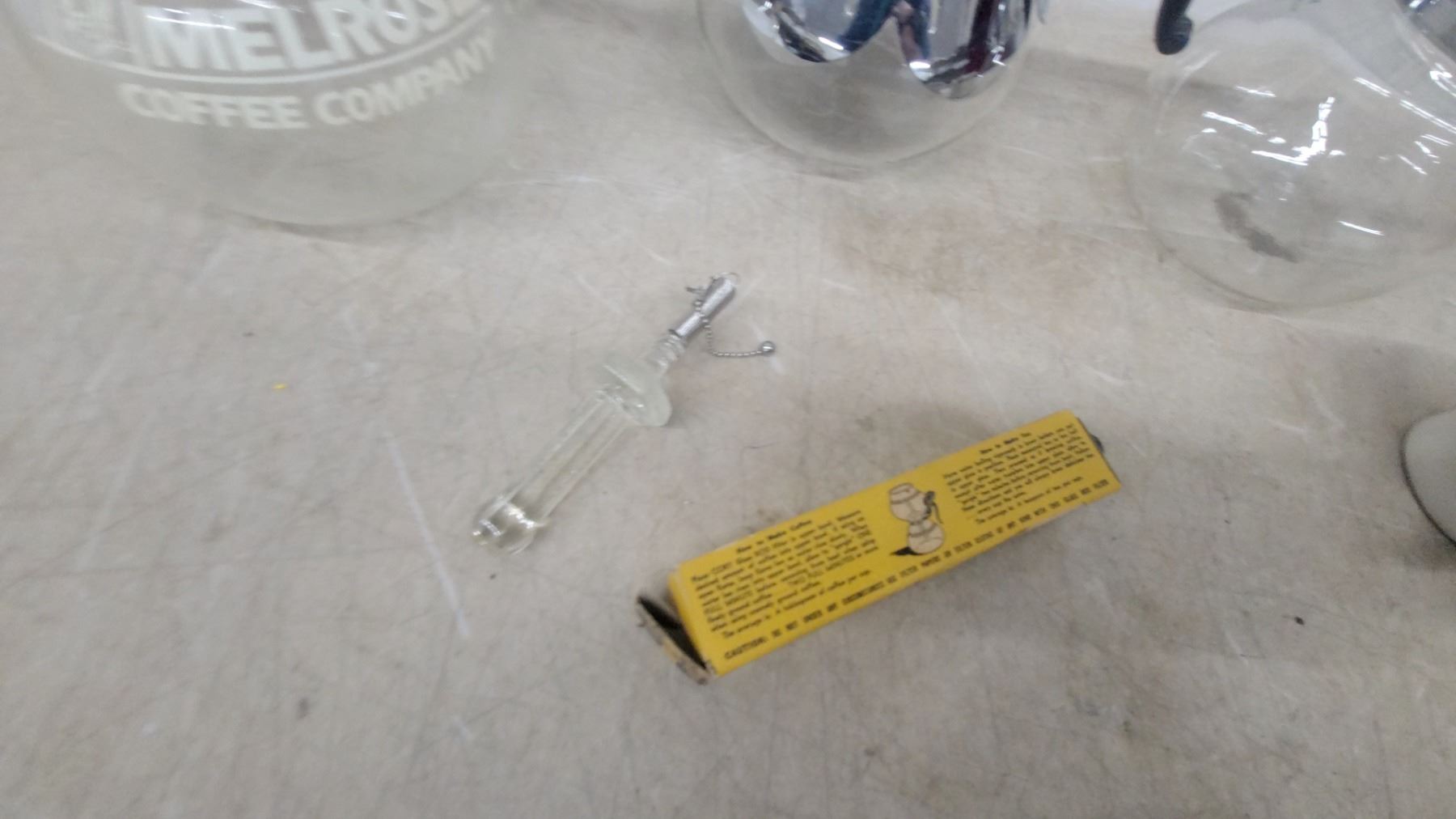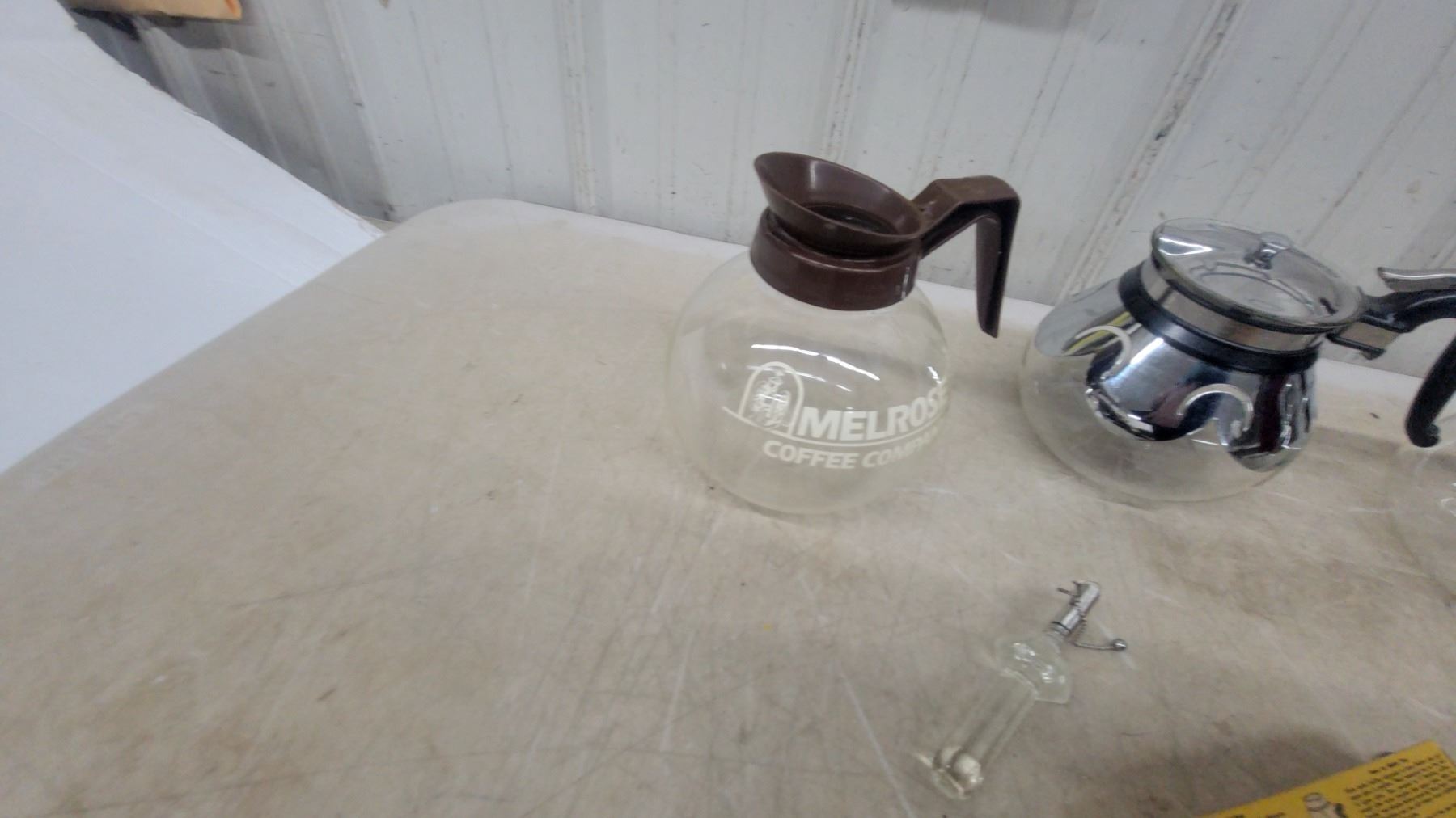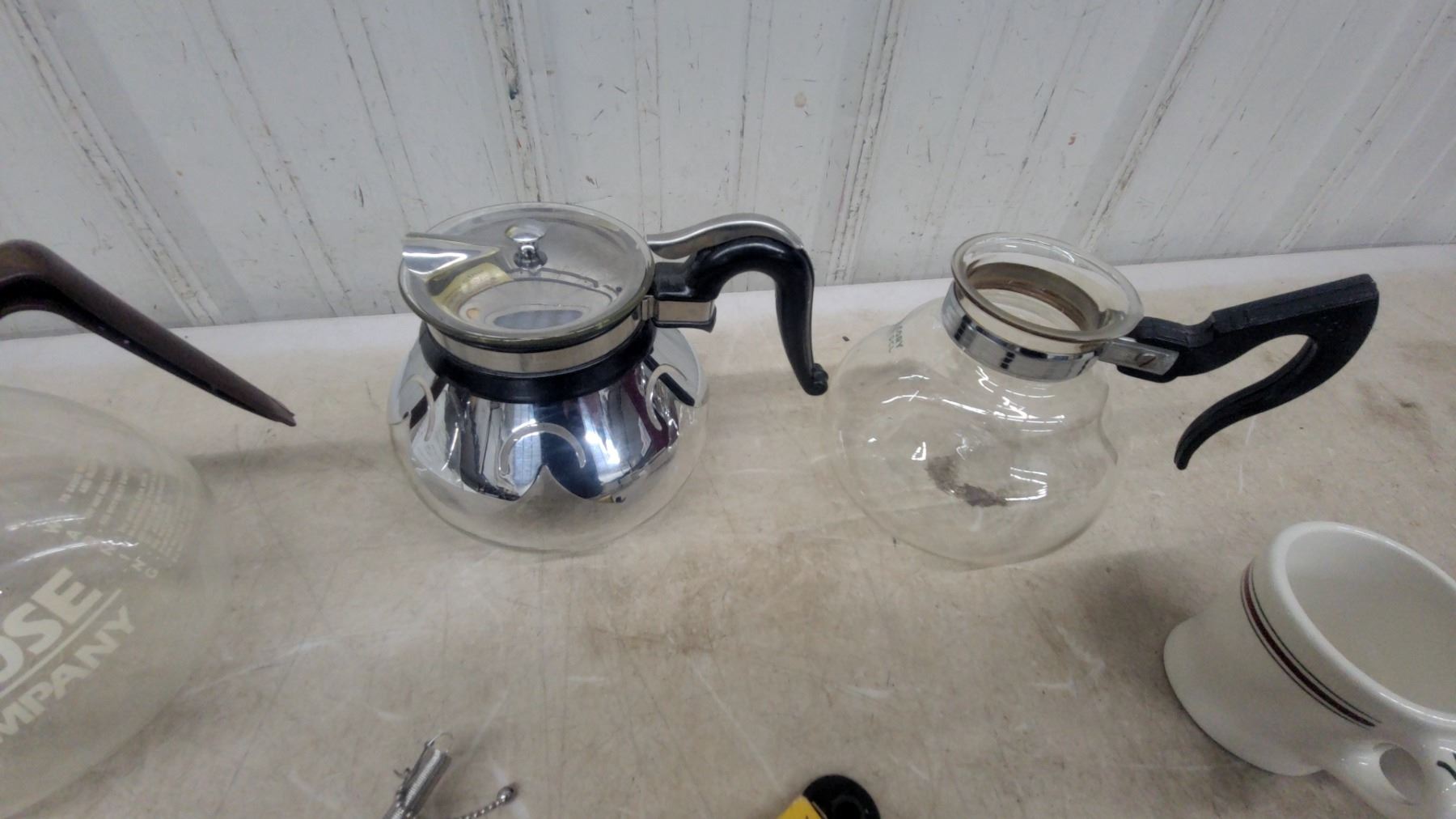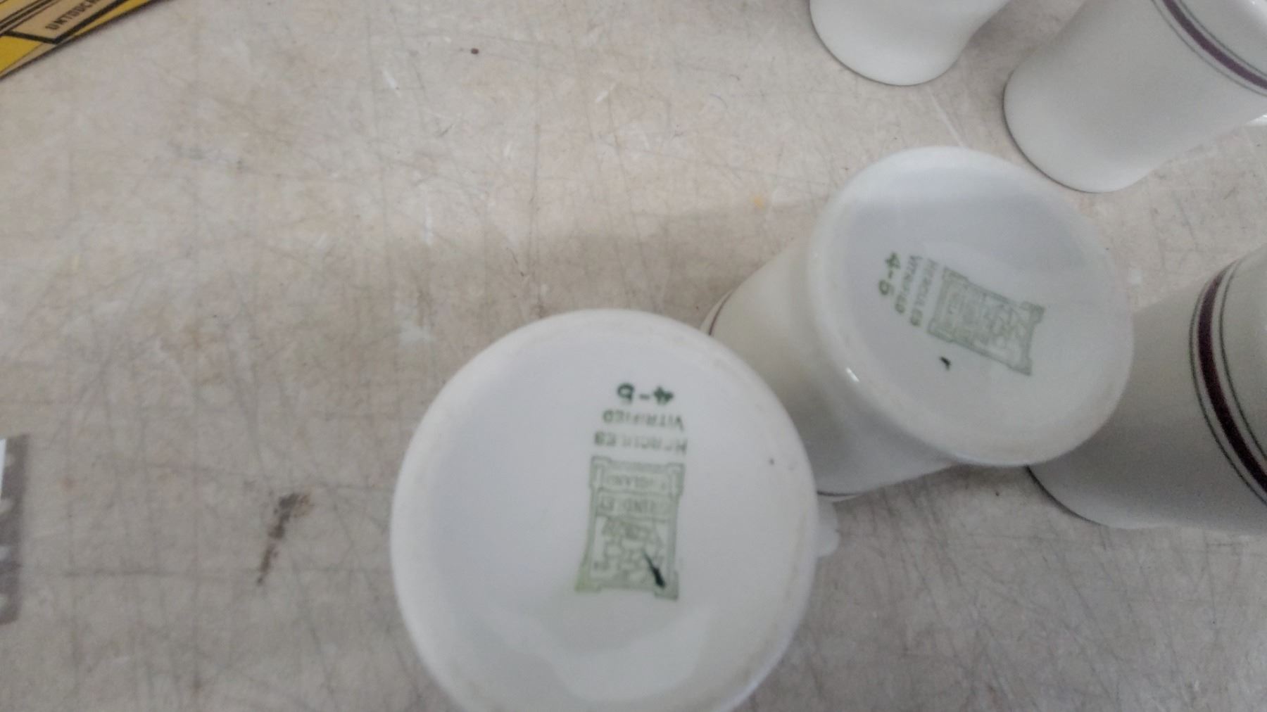 Lot 206 Vintage Glass Coffee Carafe with Brown Handle, 6 White Grindley Hotelware Ceramic Mugs with Stripe