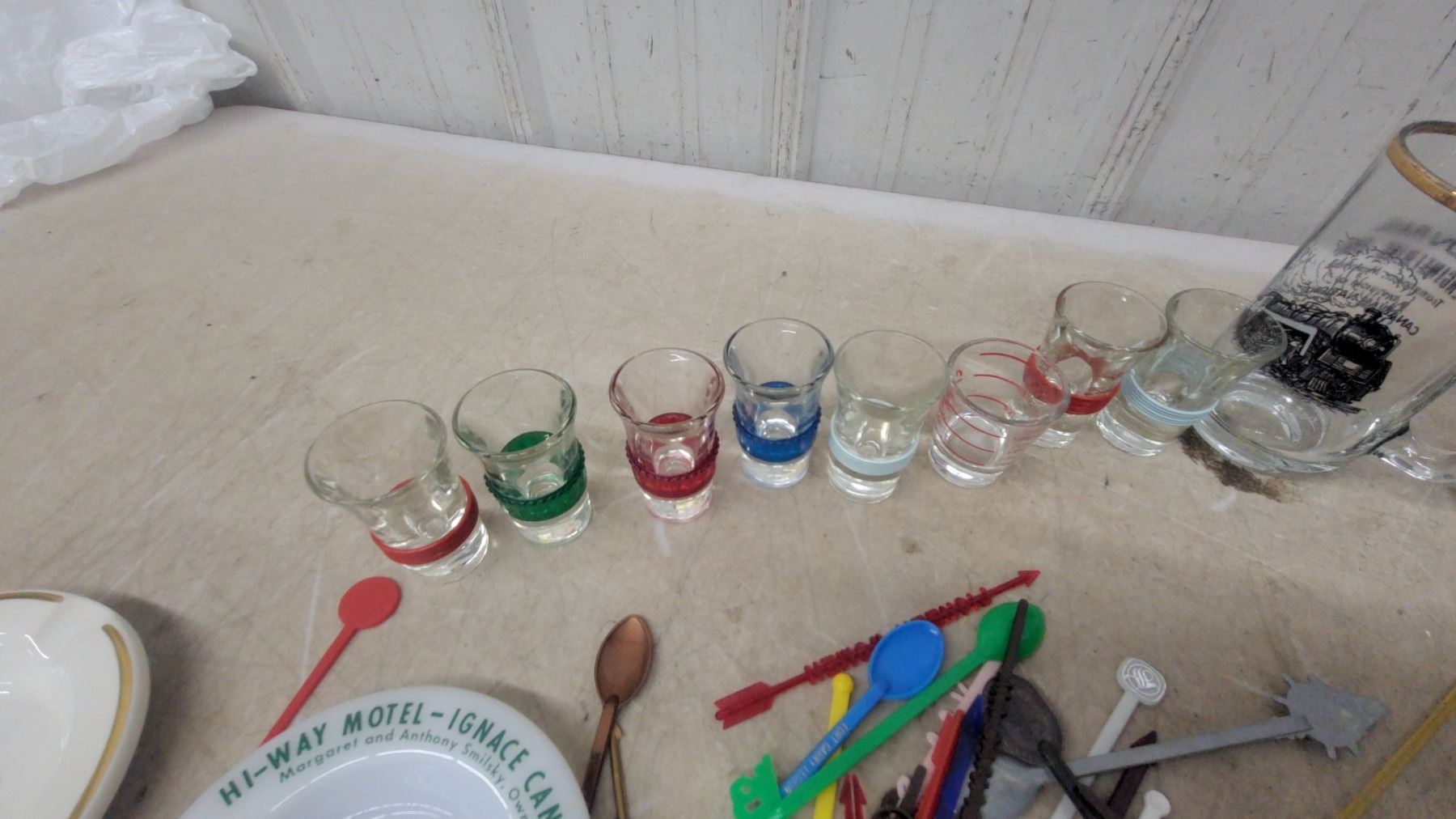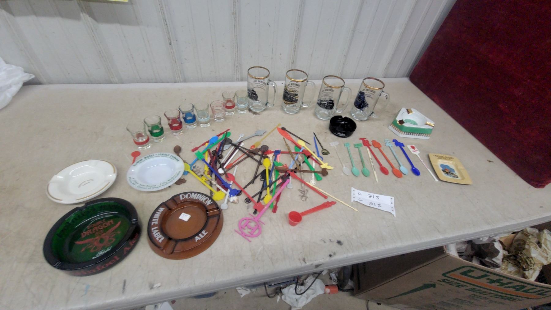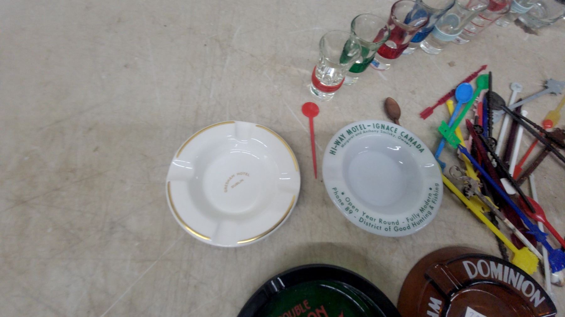 Lot 215 Vintage Ashtrays & Barware Lot: Double Dragon Ale, Dominion White Label, Hotel Ashtrays, Shot Glass